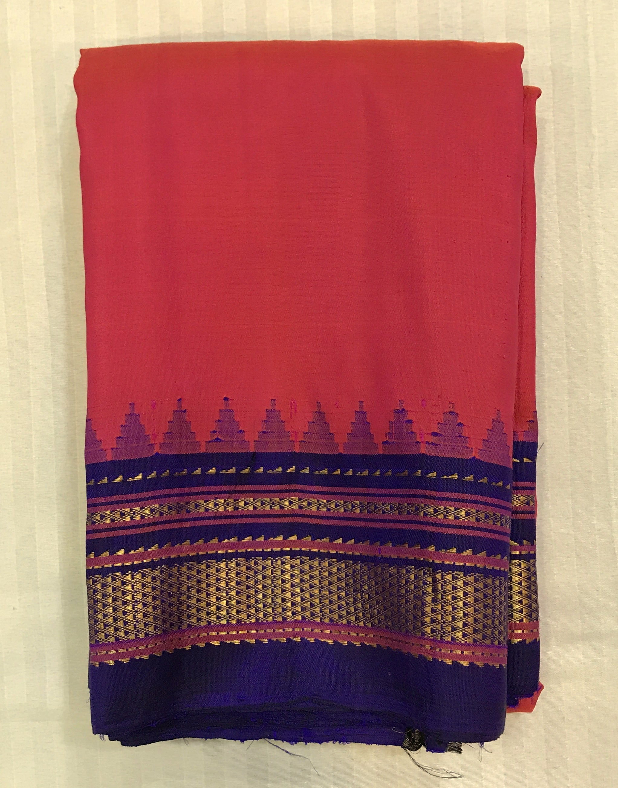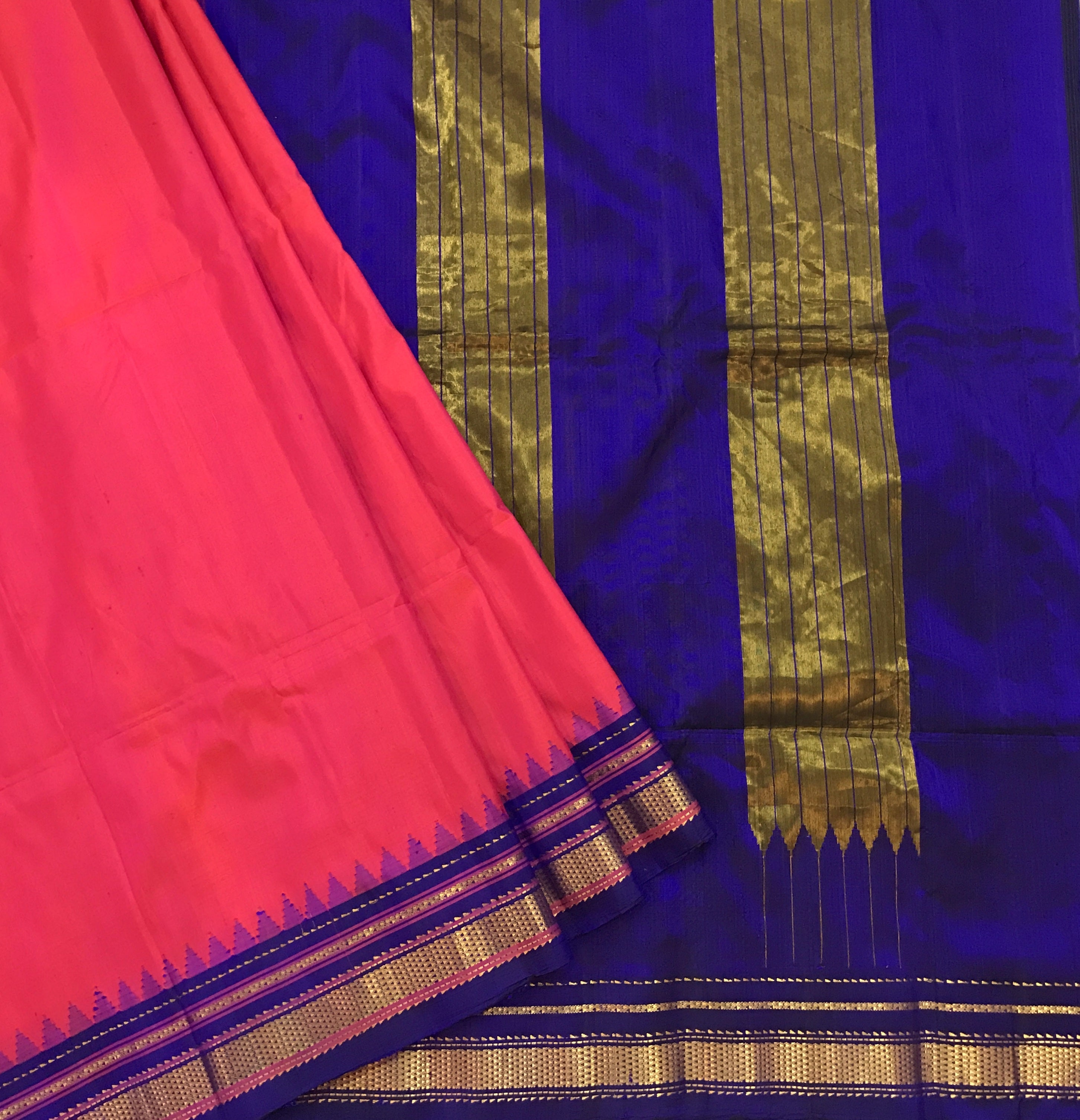 This excellent combination of shining pink and a ink blue in this pure silk Irkal looks phenomenal with a temple border and zari pallu, this is a gorgeous combination and can be worn for any function! This Irkal has a beautiful pallu which give this saree a traditional touch. The colour of the zari (slightly copperish and not typical yellow gold) is unique to this Irkal style of weaving.