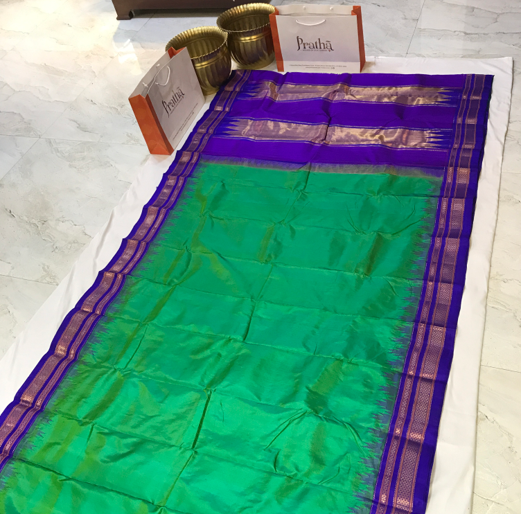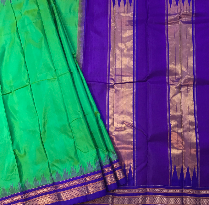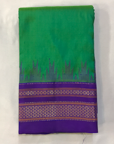 The plain Irkal in a beautiful shade of green with purple border, this one is a fashionably unique drape! This pure silk power loom Irkal in these beautiful colours is a keepsake. The plain weave with its traditional temple border and the classic irkal golden zari pallu looks stunning.