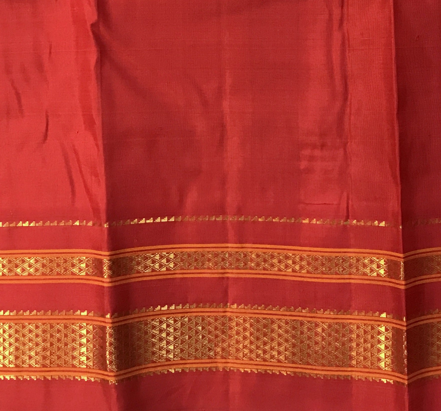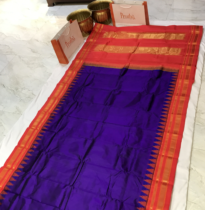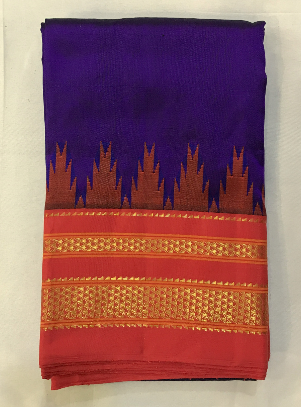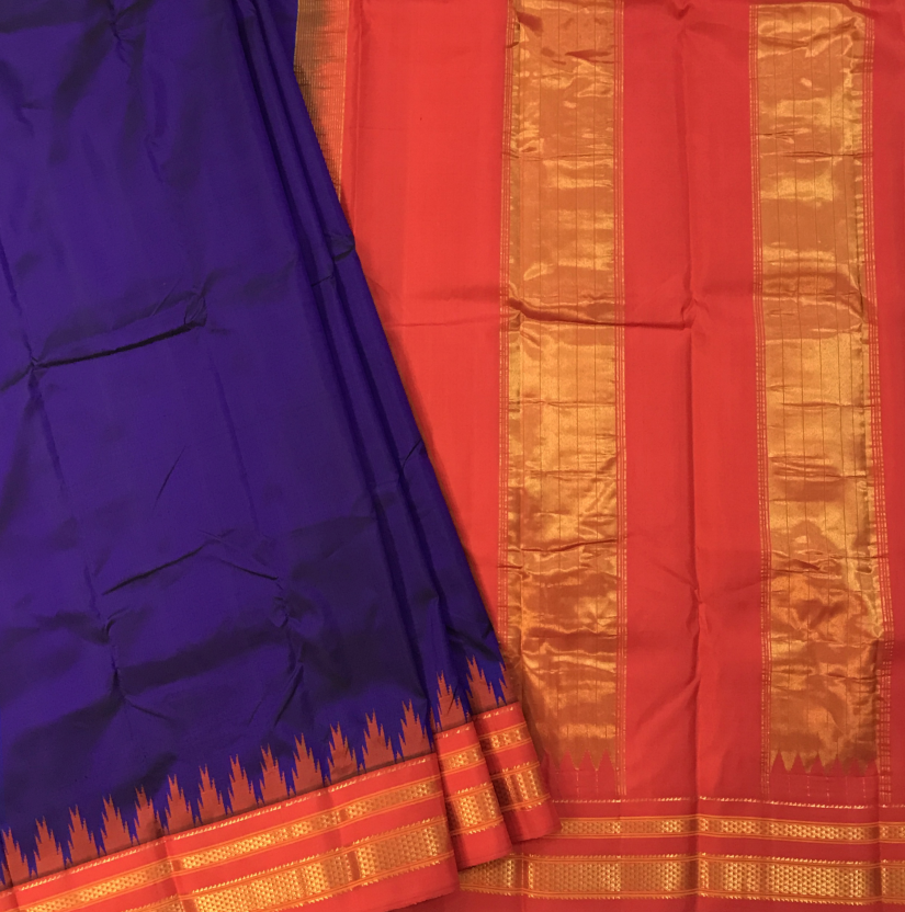The plain Irkal in a beautiful shade of purple with orange border, this one is a fashionably unique drape! This pure silk power loom Irkal in these beautiful colours is a keepsake. The plain weave with its traditional temple border and the classic irkal golden zari pallu looks stunning.