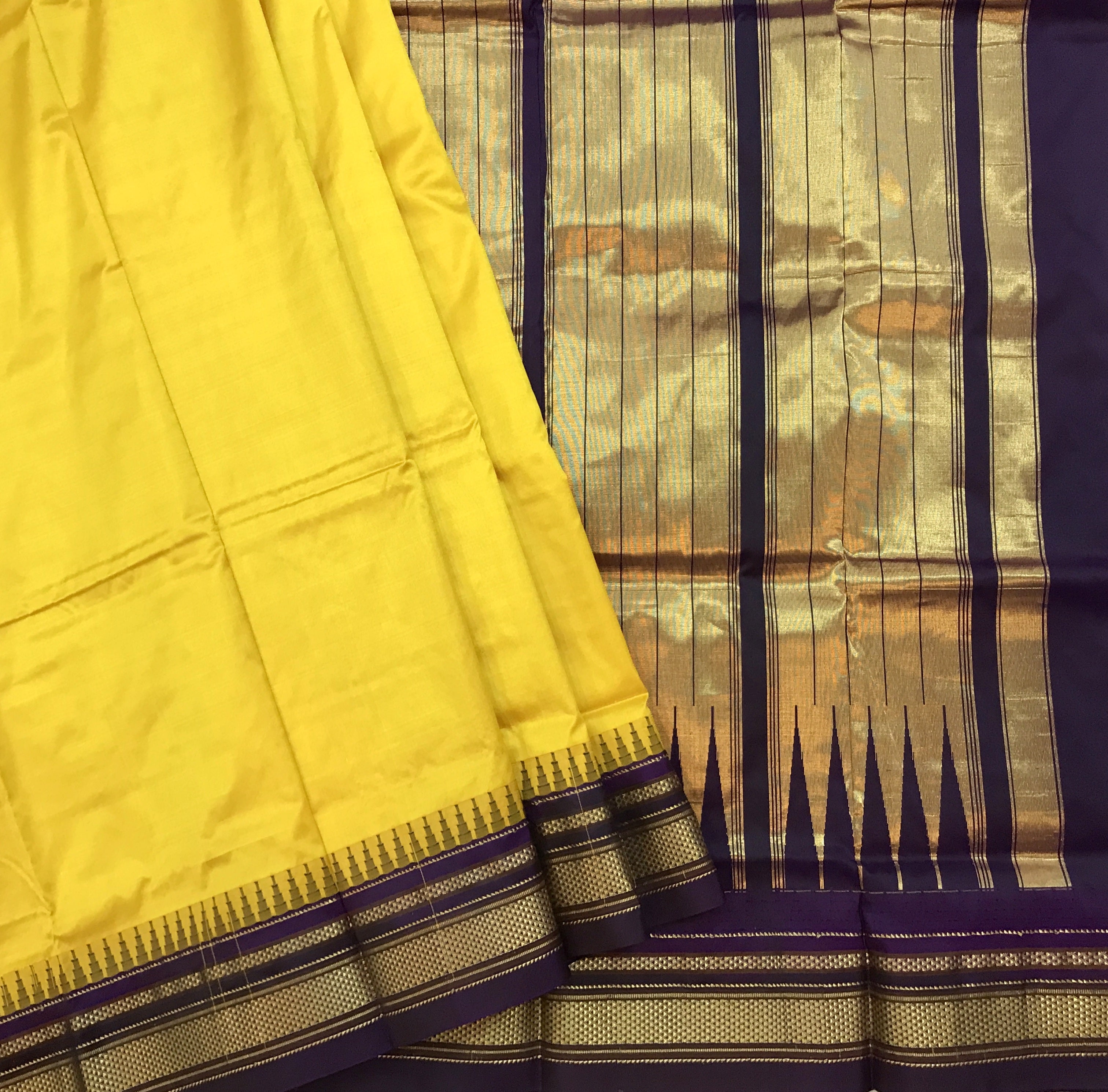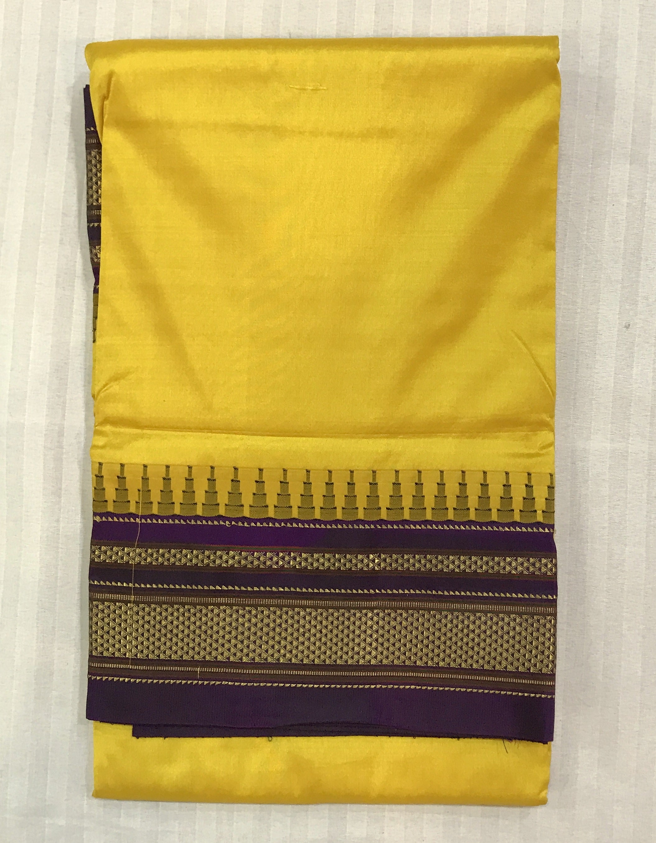 The plain Irkal in a beautiful shade of yellow with purple border, this one is a fashionably unique drape! This pure silk power loom Irkal in these beautiful colours is a keepsake. The plain weave with its traditional temple border and the classic irkal golden zari pallu looks stunning.