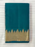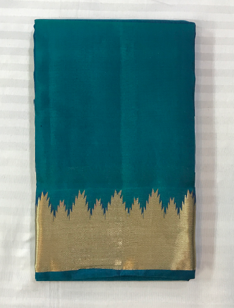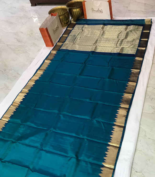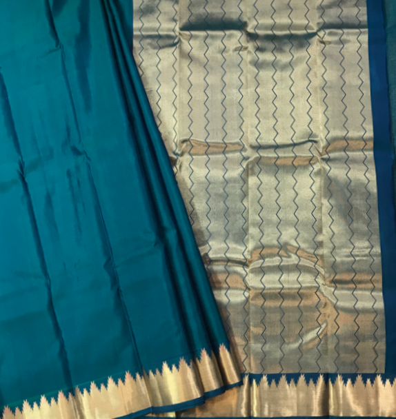 This elegant turquoise blue Kanchi silk saree with a striking golden zari border exudes  sophistication. Whether you're attending a casual gathering, a party, or a small function, this saree is perfect for making a stylish statement wherever you go.