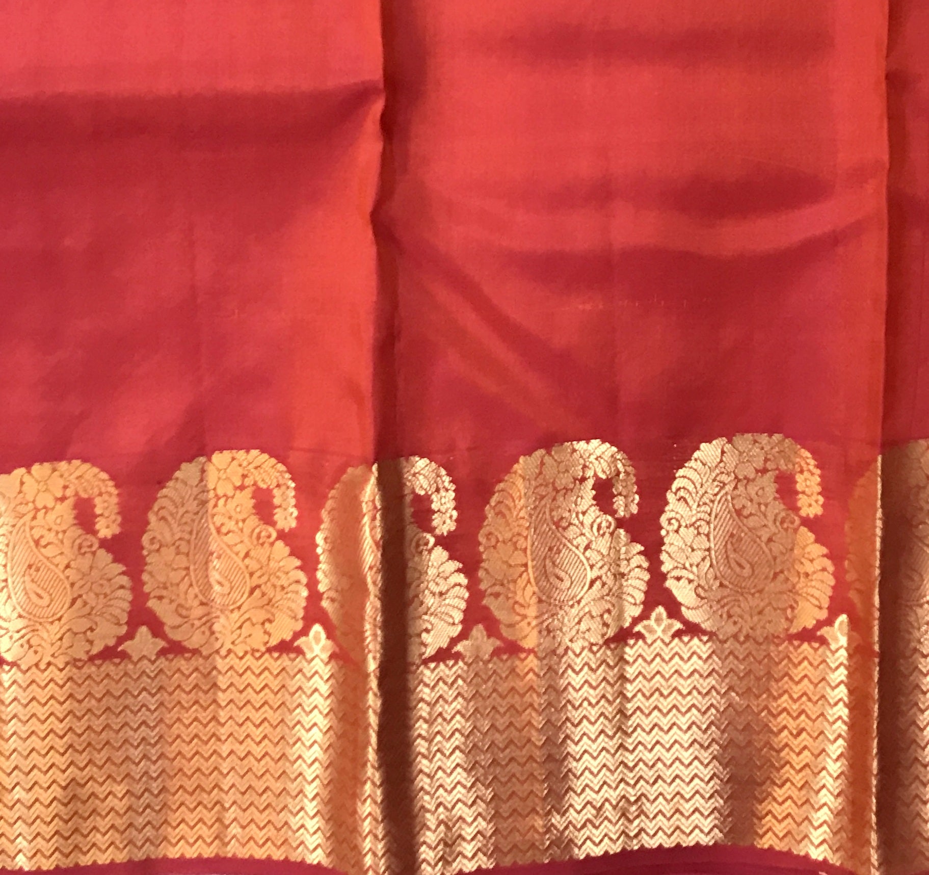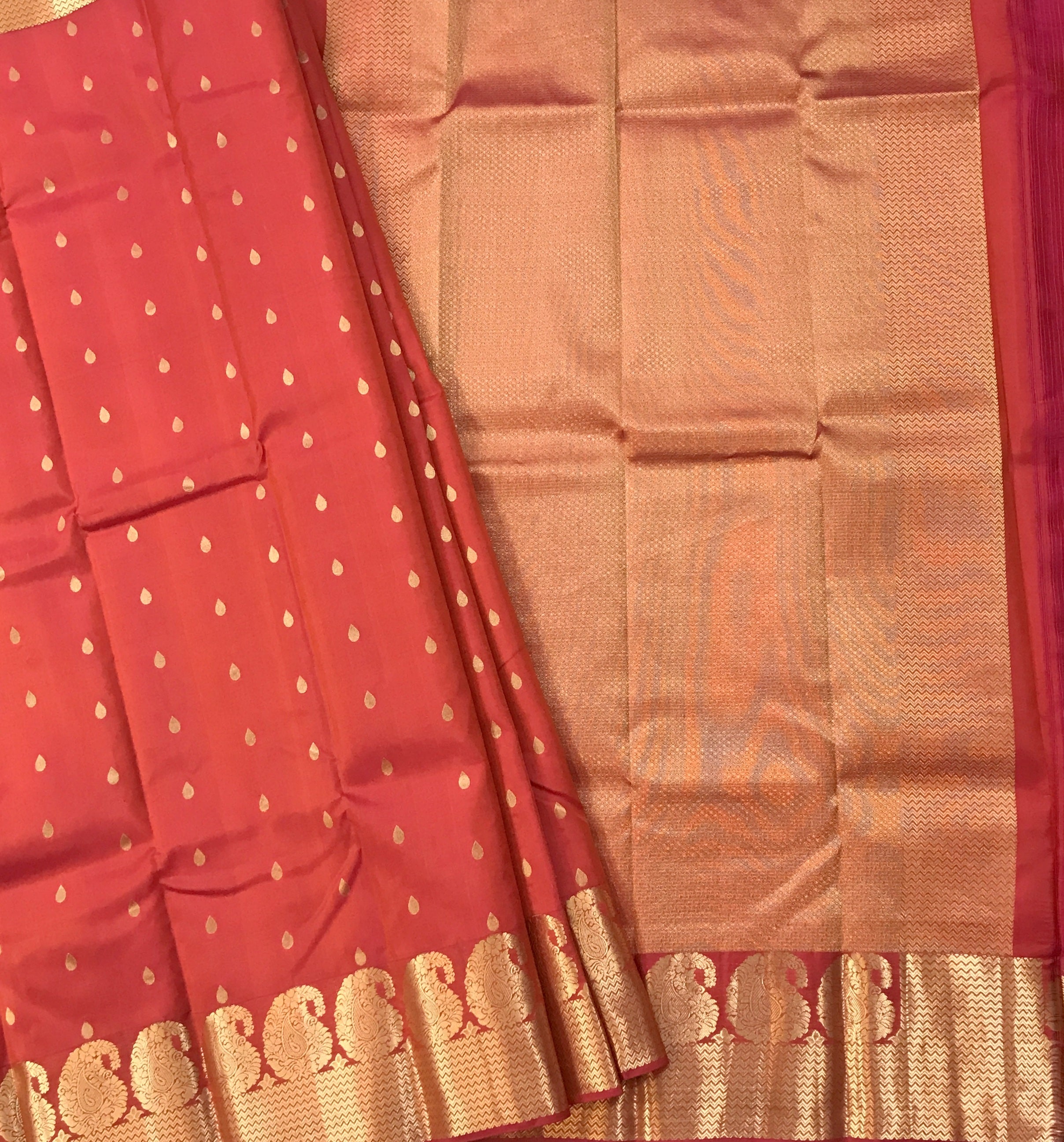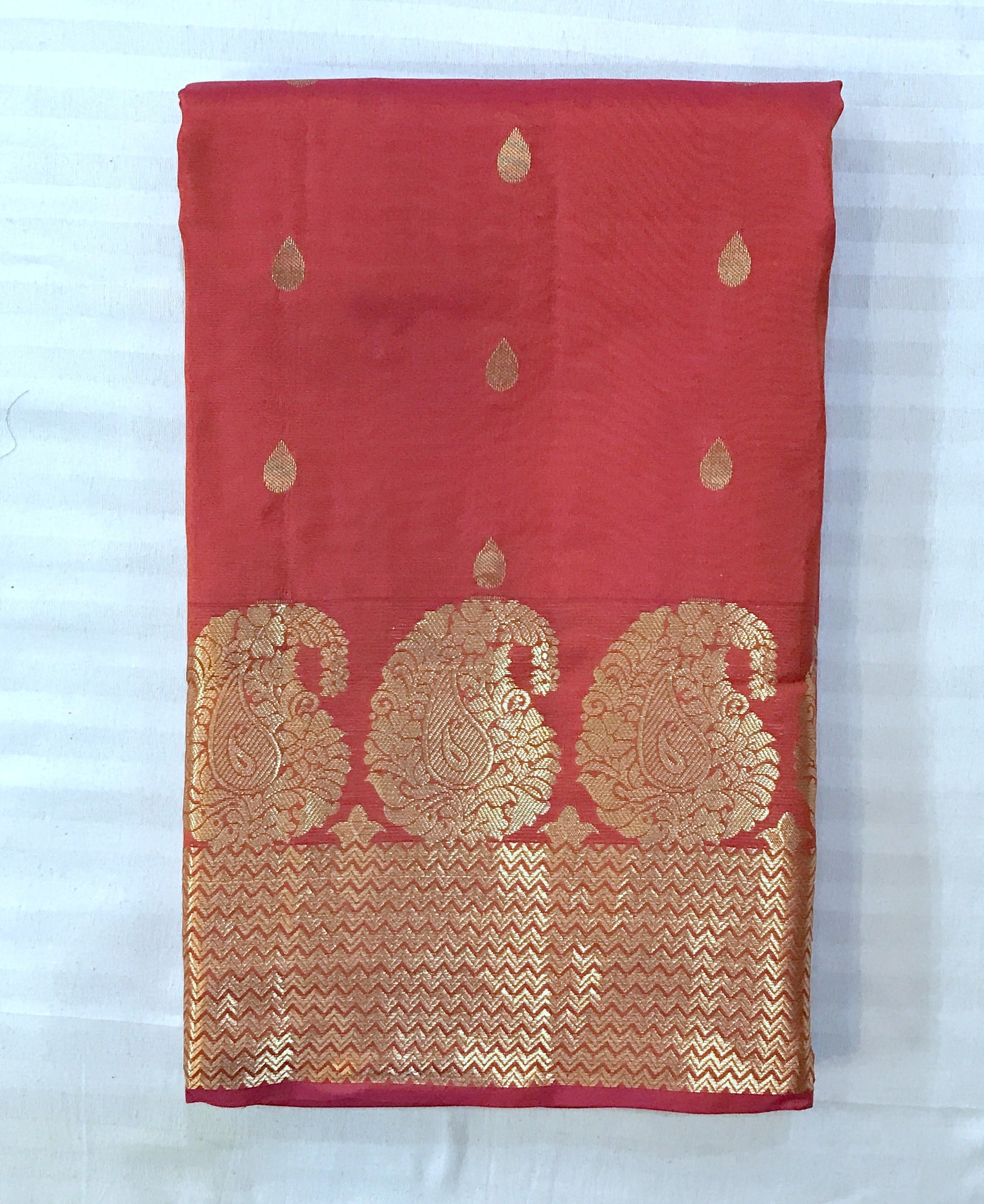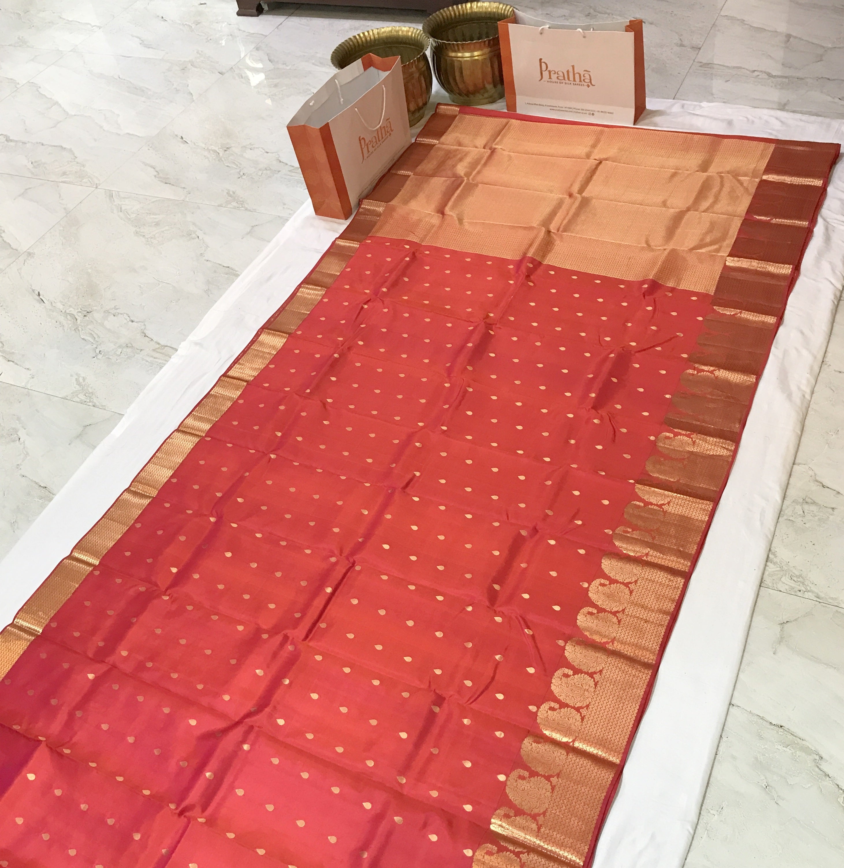 A beautiful mix shades of orange-red-pink in traditional power loom Kanjeevaram with a golden zari ( intricate design ) border, this is a magnificent saree! The unique colour makes it stand out. Its small leaf shaped power loom butti with intricate design traditional style border add to its beauty. This saree is perfect for day as well as evening.