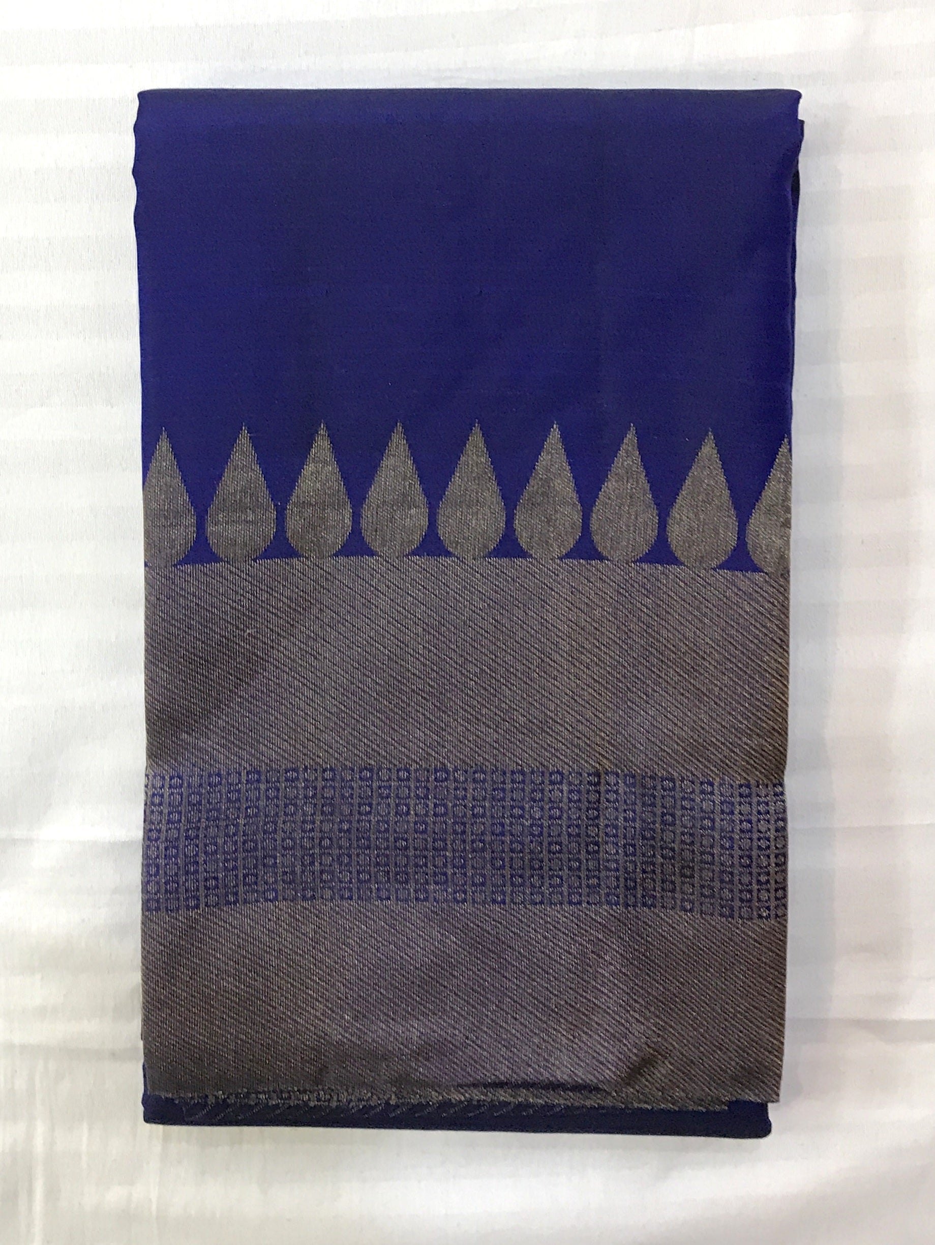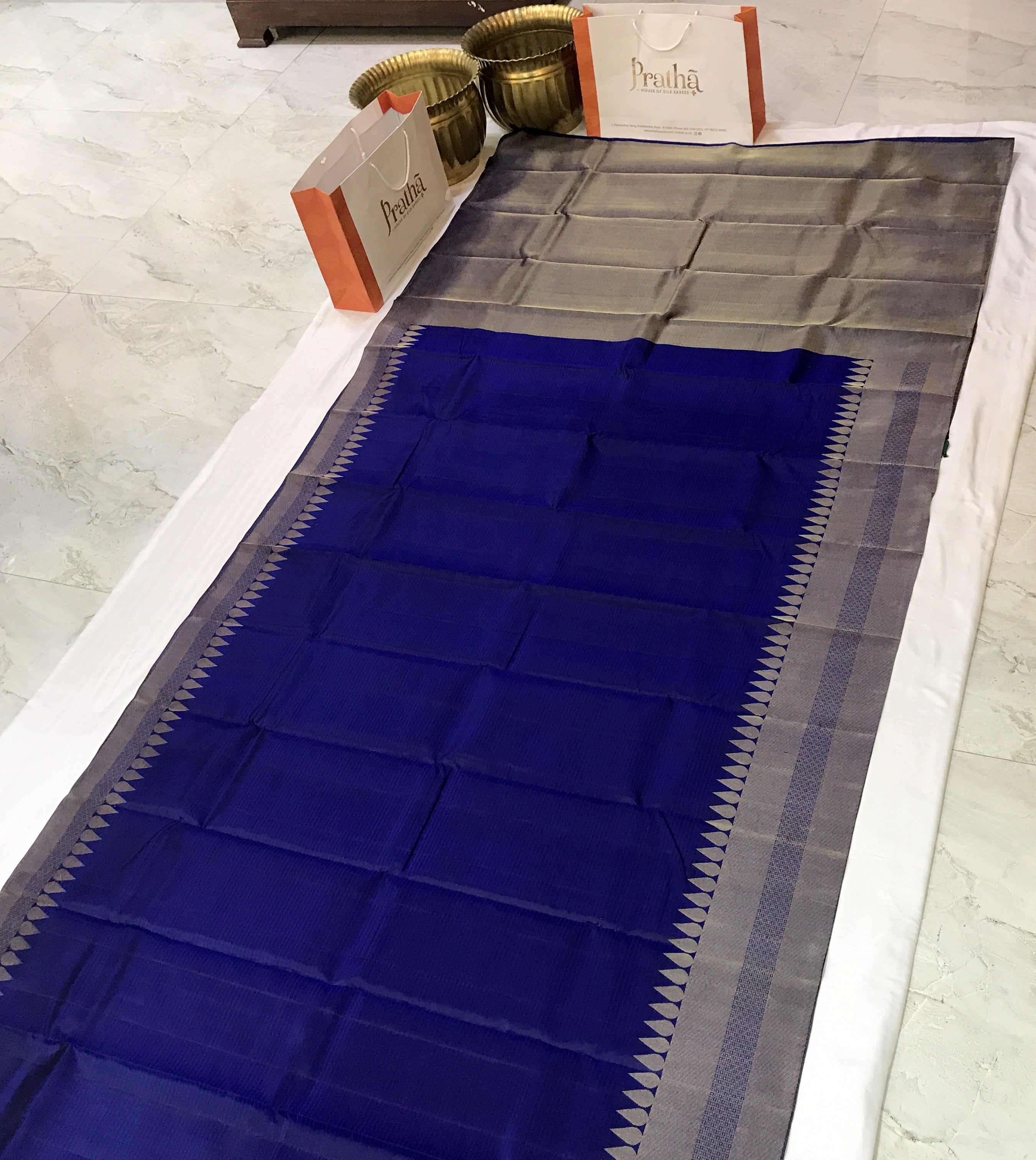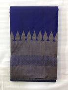 This elegant blue Kanchi silk saree with a striking mix golden-silver zari border exudes sophistication. Whether you're attending a casual gathering, a party, or a small function, this saree is perfect for making a stylish statement wherever you go.