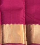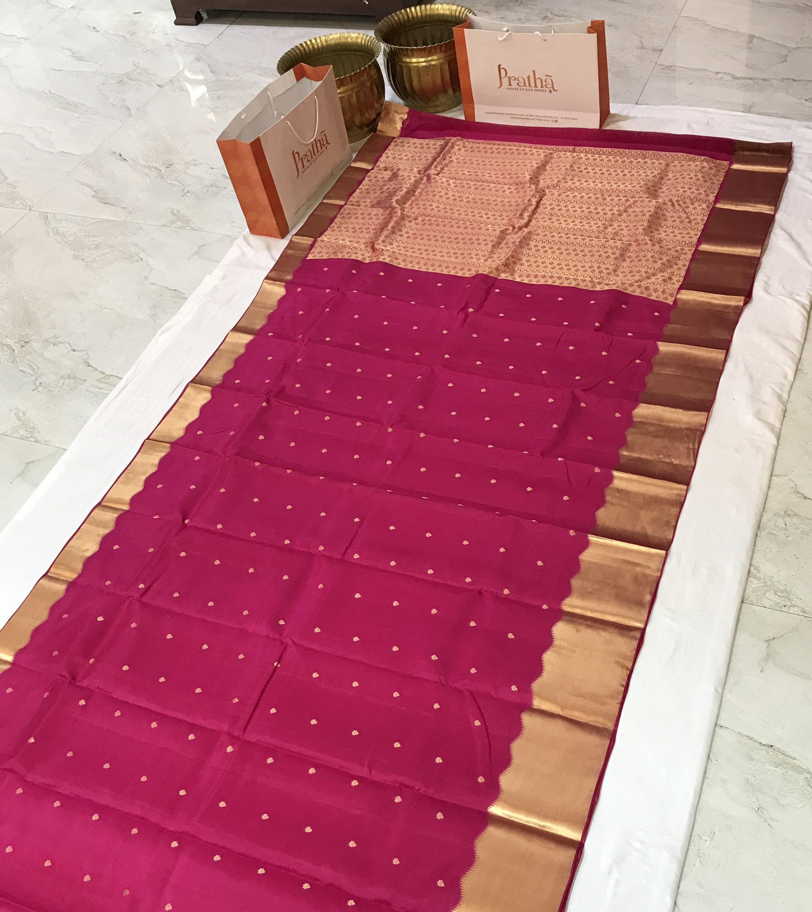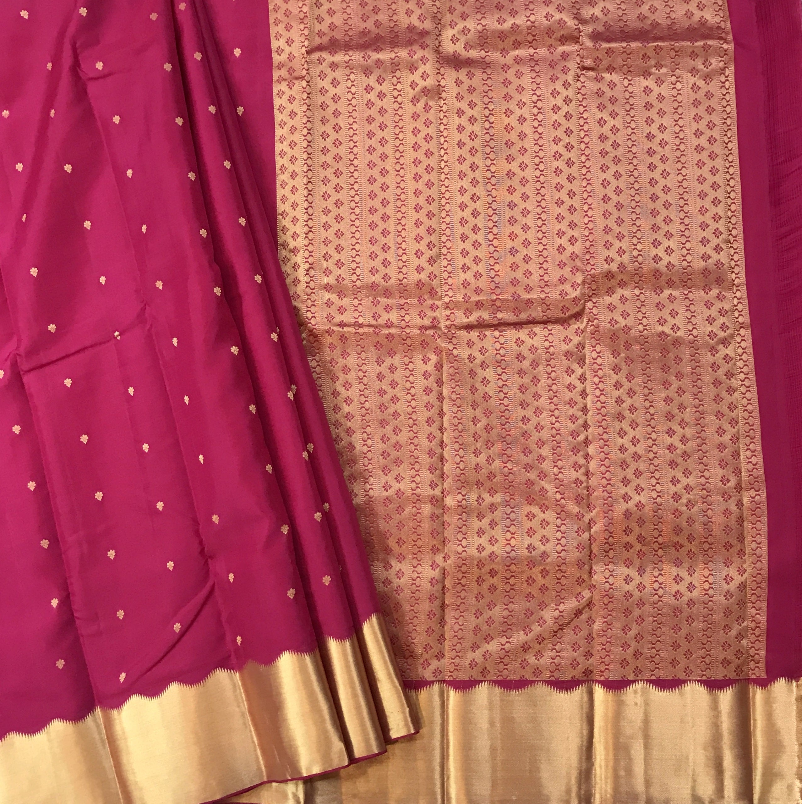 A rich and elegant pink Kanjeevaram saree adorned with delicate golden buttis all over the body, this drape exudes timeless charm. The contrast of the lustrous golden zari border enhances its regal appeal, making it perfect for festive and special occasions. The pallu stands out beautifully with intricate zari weaving in a lovely golden hue, lending a traditional look that never goes out of style. Lightweight yet grand, this saree is a wonderful addition to your heritage collection.