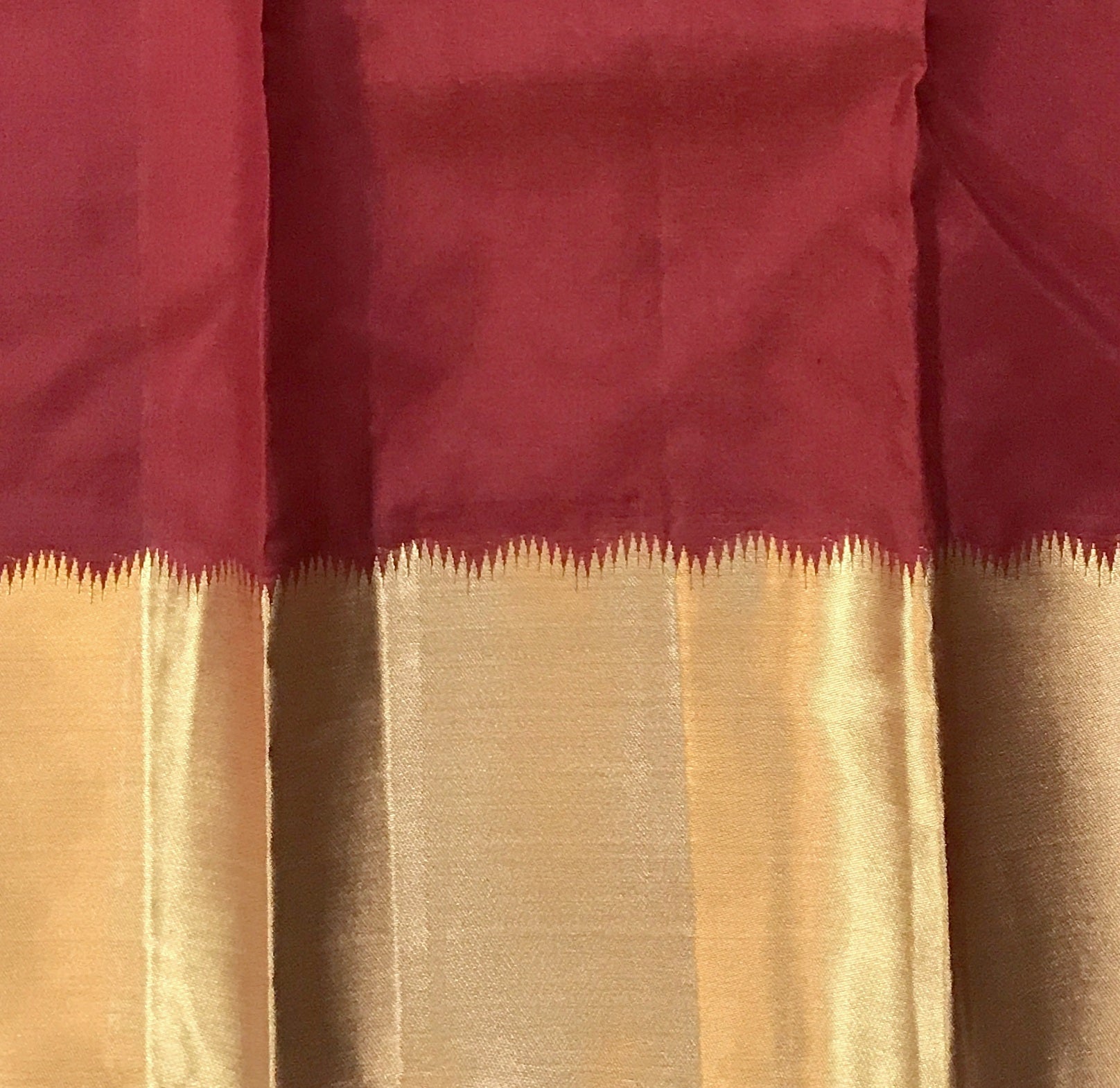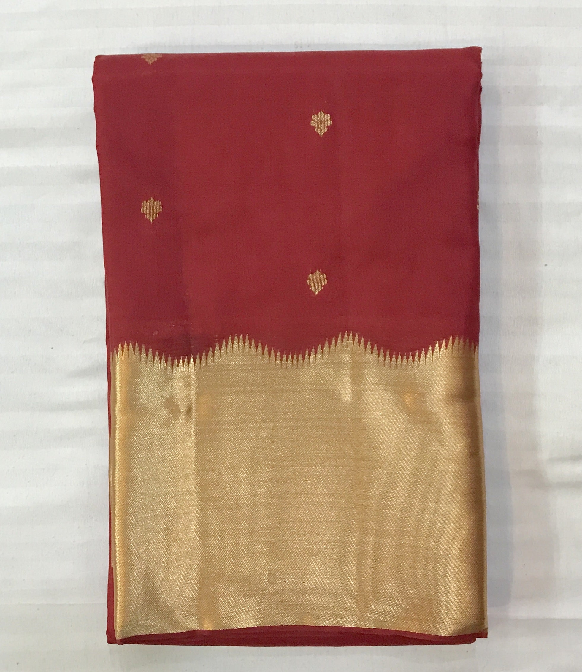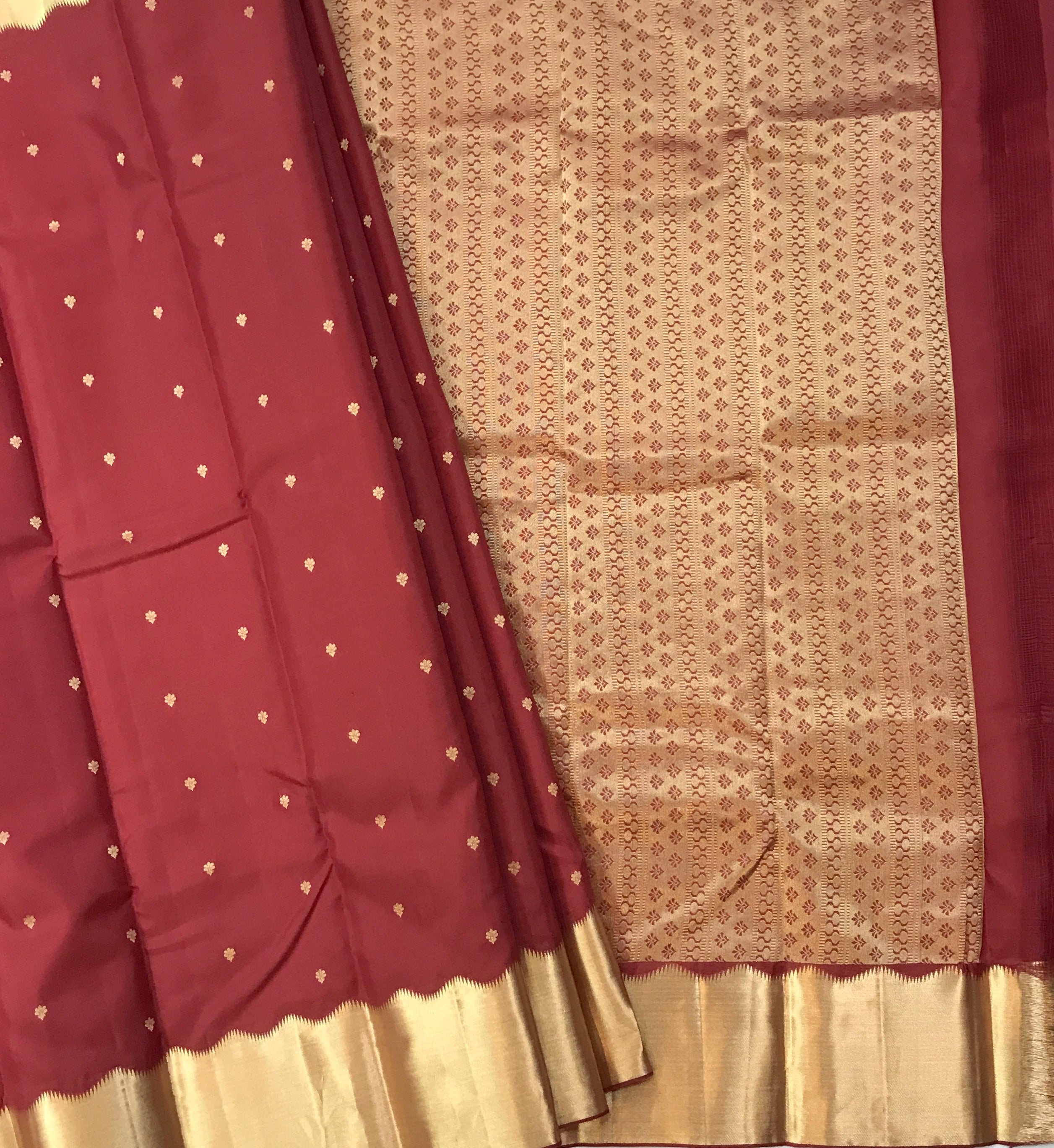 A rich and elegant red Kanjeevaram saree adorned with delicate golden buttis all over the body, this drape exudes timeless charm. The contrast of the lustrous golden zari border enhances its regal appeal, making it perfect for festive and special occasions. The pallu stands out beautifully with intricate zari weaving in a lovely golden hue, lending a traditional look that never goes out of style. Lightweight yet grand, this saree is a wonderful addition to your heritage collection.