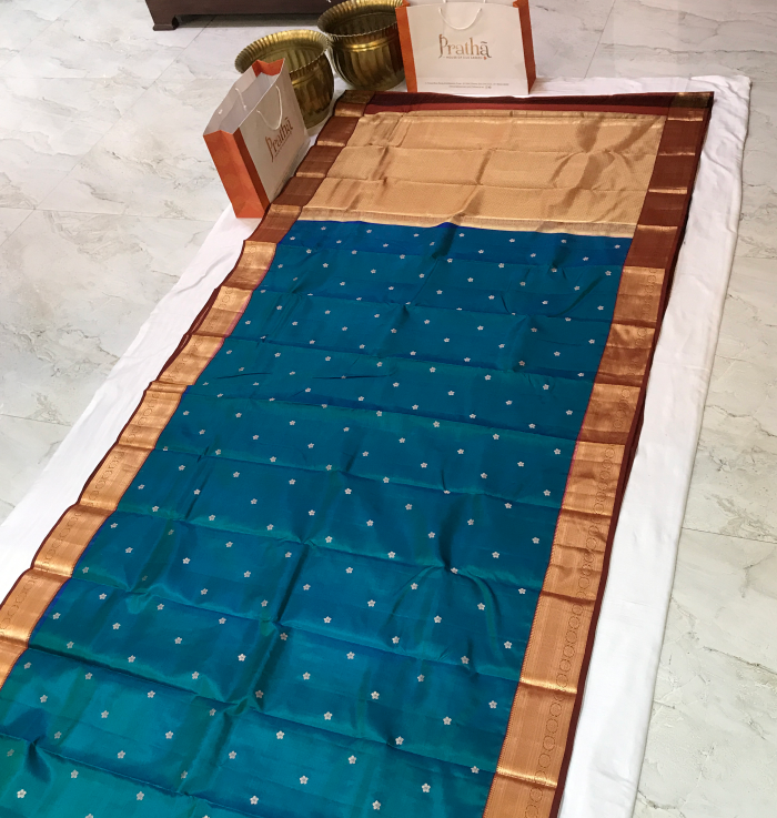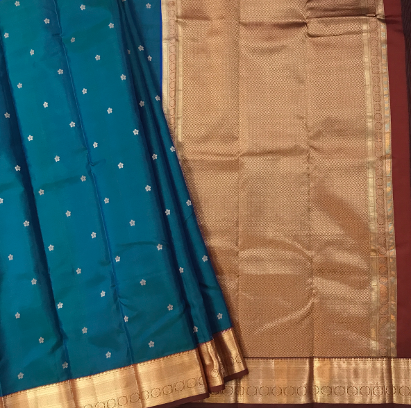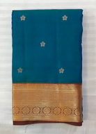 This stunning Kanjeevaram silk saree in an elegant shade of teal blue is a true classic! Adorned with dainty golden zari buttas across the body, it exudes rich traditional charm. The highlight of this saree is its magnificent pallu in antique gold zari, woven intricately with traditional motifs, giving it a luxurious and graceful appeal. The broad golden border adds richness, enhancing the beauty of this timeless drape. Perfect for weddings, festive occasions, and celebrations — this saree promises to make you look regal and elegant!