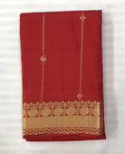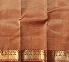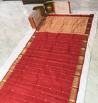 A very beautiful brick-red Kanjeevaram with elegant fine golden zari buttis all over the body and a rich golden zari border looks absolutely ravishing. The saree has a subtle yet classy pallu in a lighter shade with intricate brocade-style weaving, adding grace and grandeur. Whether it is a casual gathering, a festive celebration, or a small function, this saree will make you stand out effortlessly.