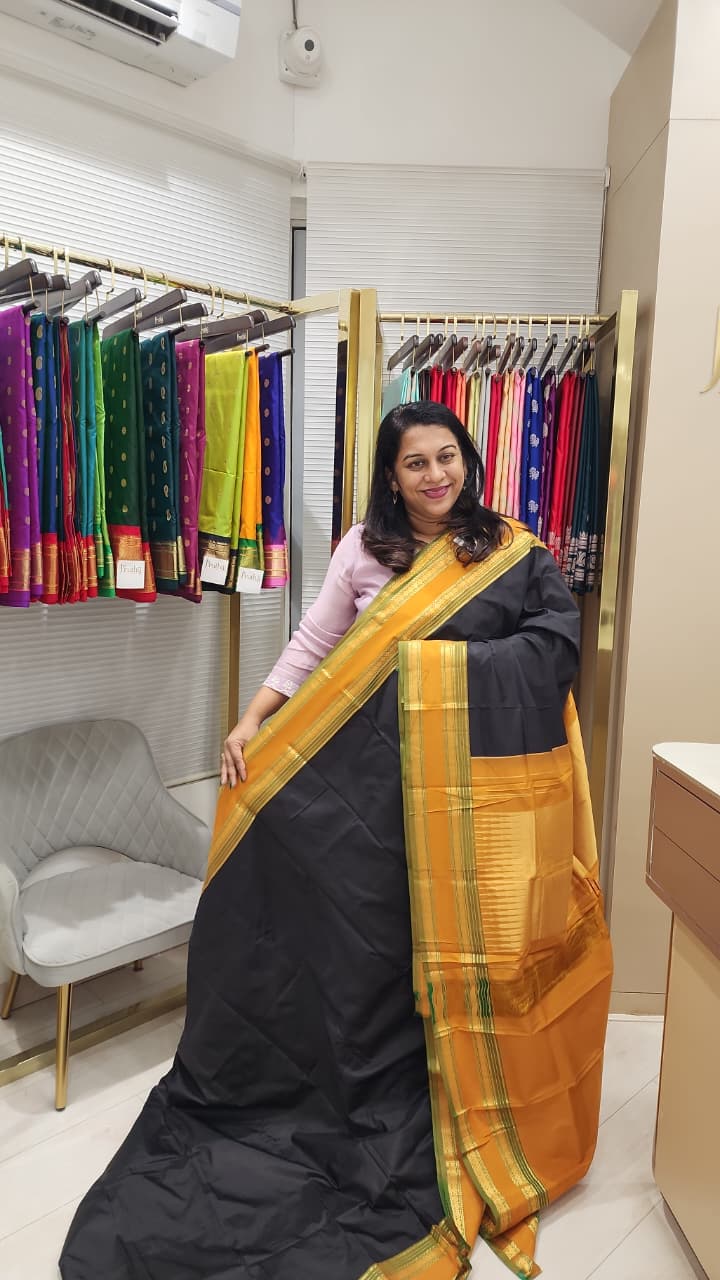 This exquisite Kanjeevaram saree in a black hue features a delicate golden zari border, exuding elegance and charm. Perfect for any occasion, whether it's a casual gathering, a party, or a small function, this saree will make you stand out effortlessly.