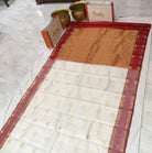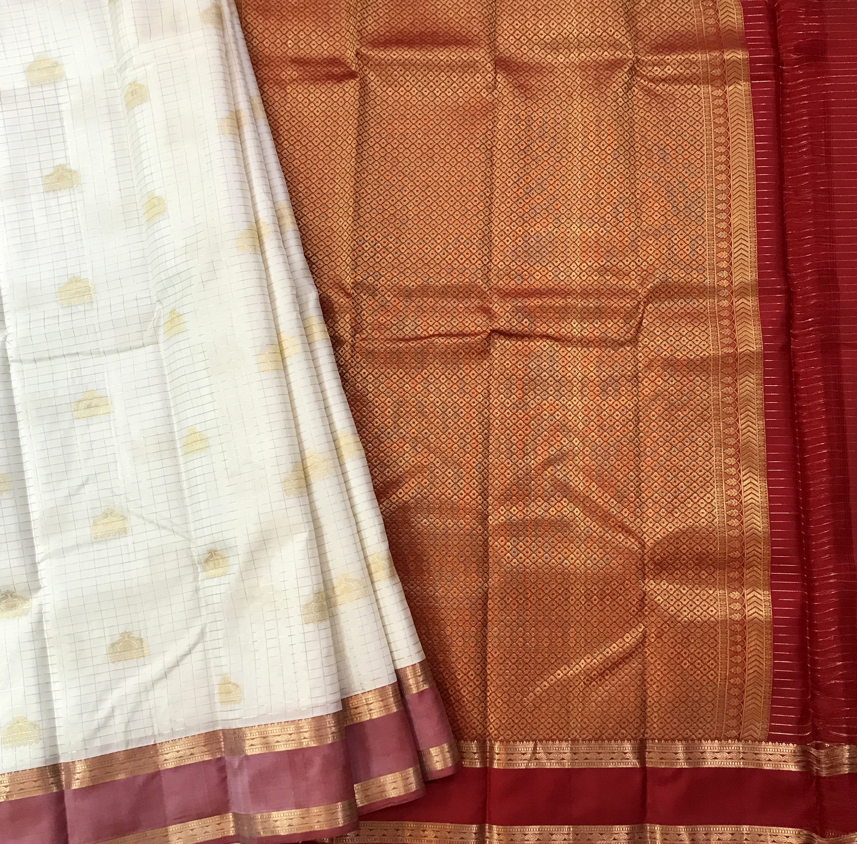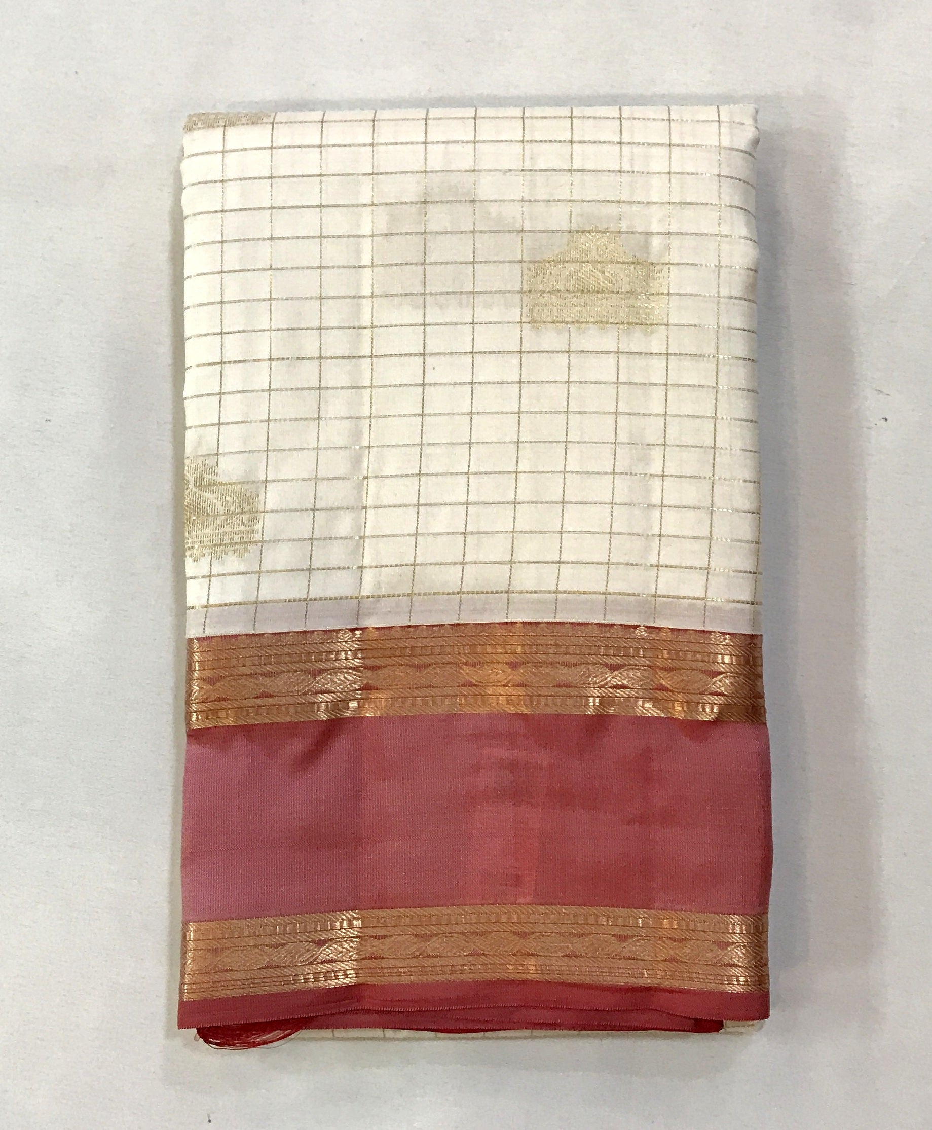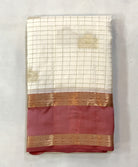 This beautiful shade of white pure silk handwoven Kanjeevaram, this one is perfectly traditional. The delicate butti designs with checks design and golden zari border with richly woven Pallu make this weave a classic! Thanks to its beautiful colour with the combination of gold, this Kanjeevaram will look great in the day as well as at night! Do not miss that, this saree has a very beautiful red coloured golden zari border looks outstanding when we wear.