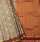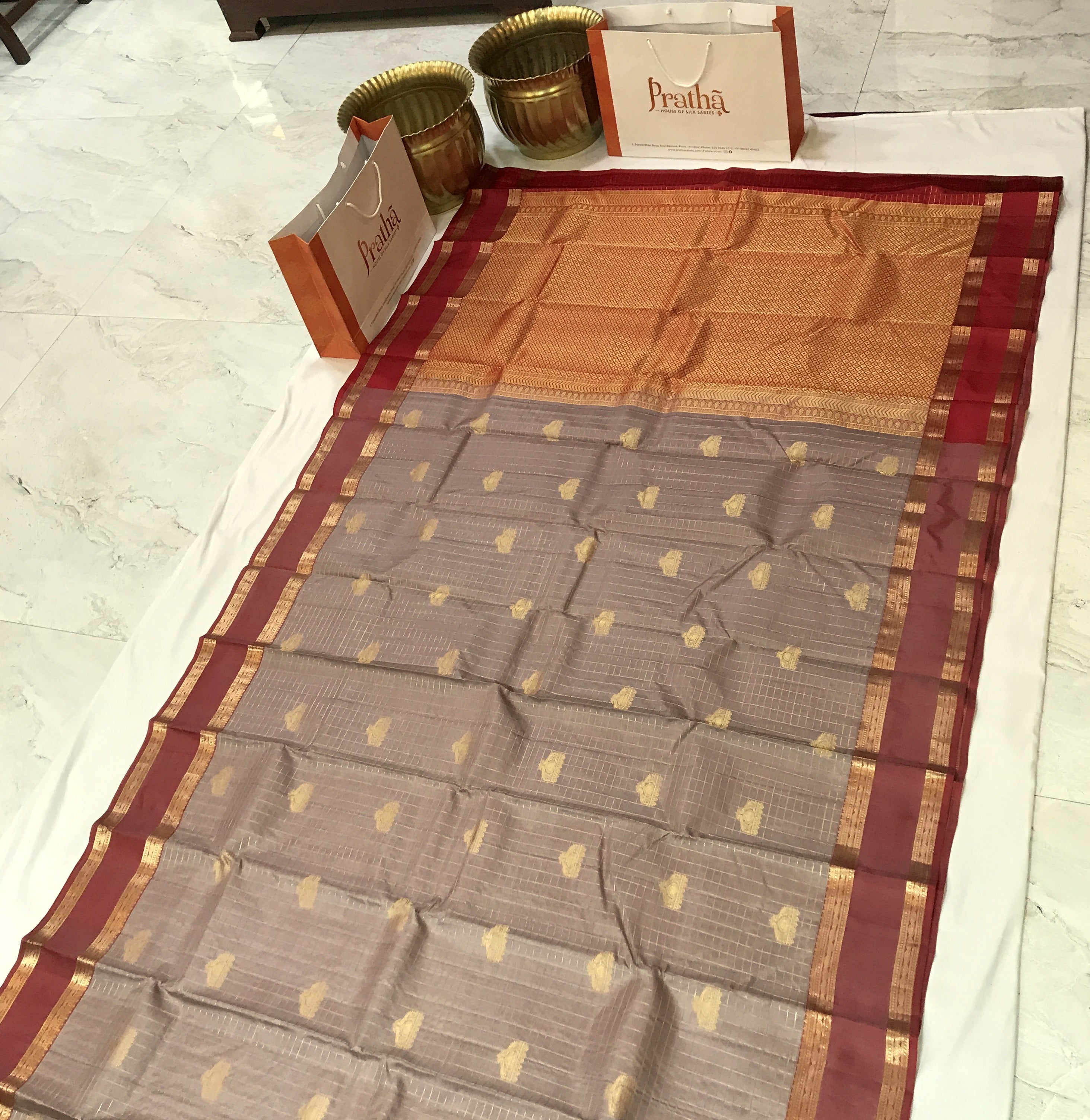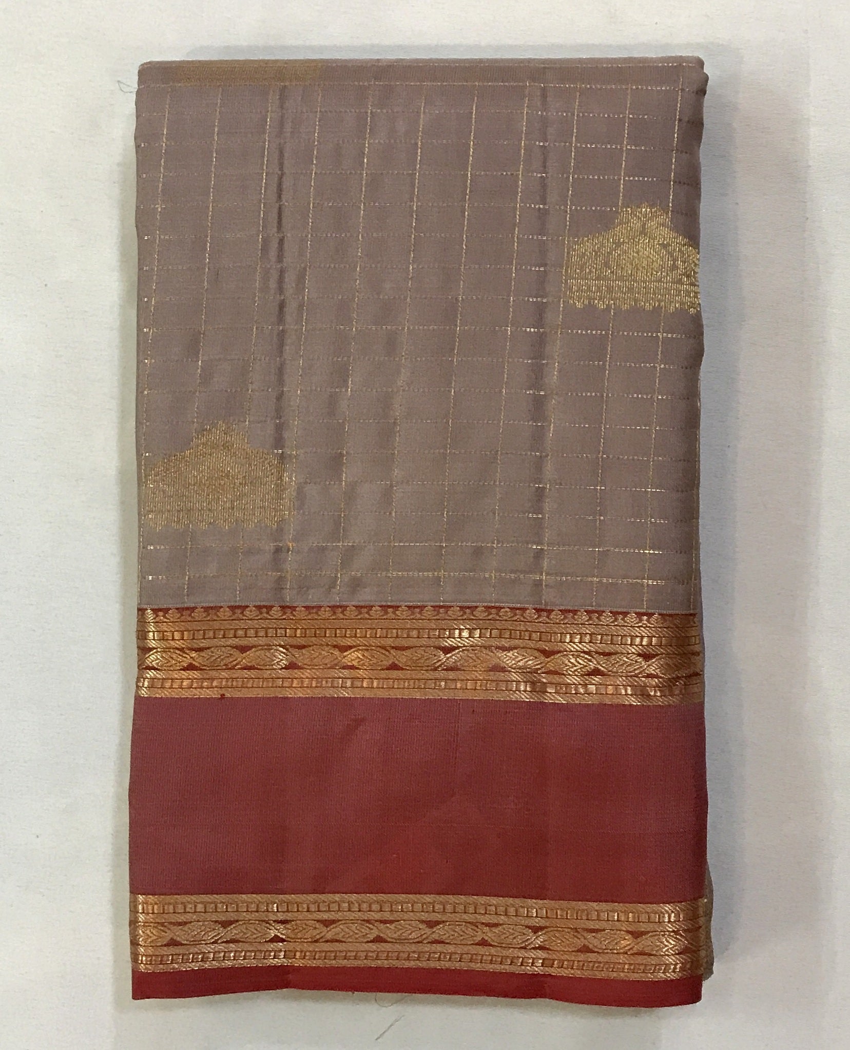 This beautiful shade of greyish-pink pure silk handwoven Kanjeevaram, this one is perfectly traditional. The delicate butti designs with checks design and golden zari border with richly woven Pallu make this weave a classic! Thanks to its beautiful colour with the combination of gold, this Kanjeevaram will look great in the day as well as at night! Do not miss that, this saree has a very beautiful red coloured golden zari border looks outstanding when we wear.