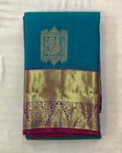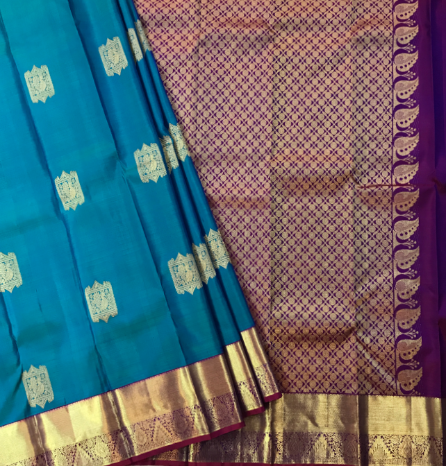 This phenomenal shade of blue pure silk handwoven Kanjeevaram, this one is perfectly traditional. The delicate butti designs, golden zari border and richly woven Pallu make this weave a classic! Thanks to its beautiful colour with the combination of gold, this Kanjeevaram will look great in the day as well as at night! Do not miss that, this saree has a very beautiful golden zari border looks outstanding when we wear.