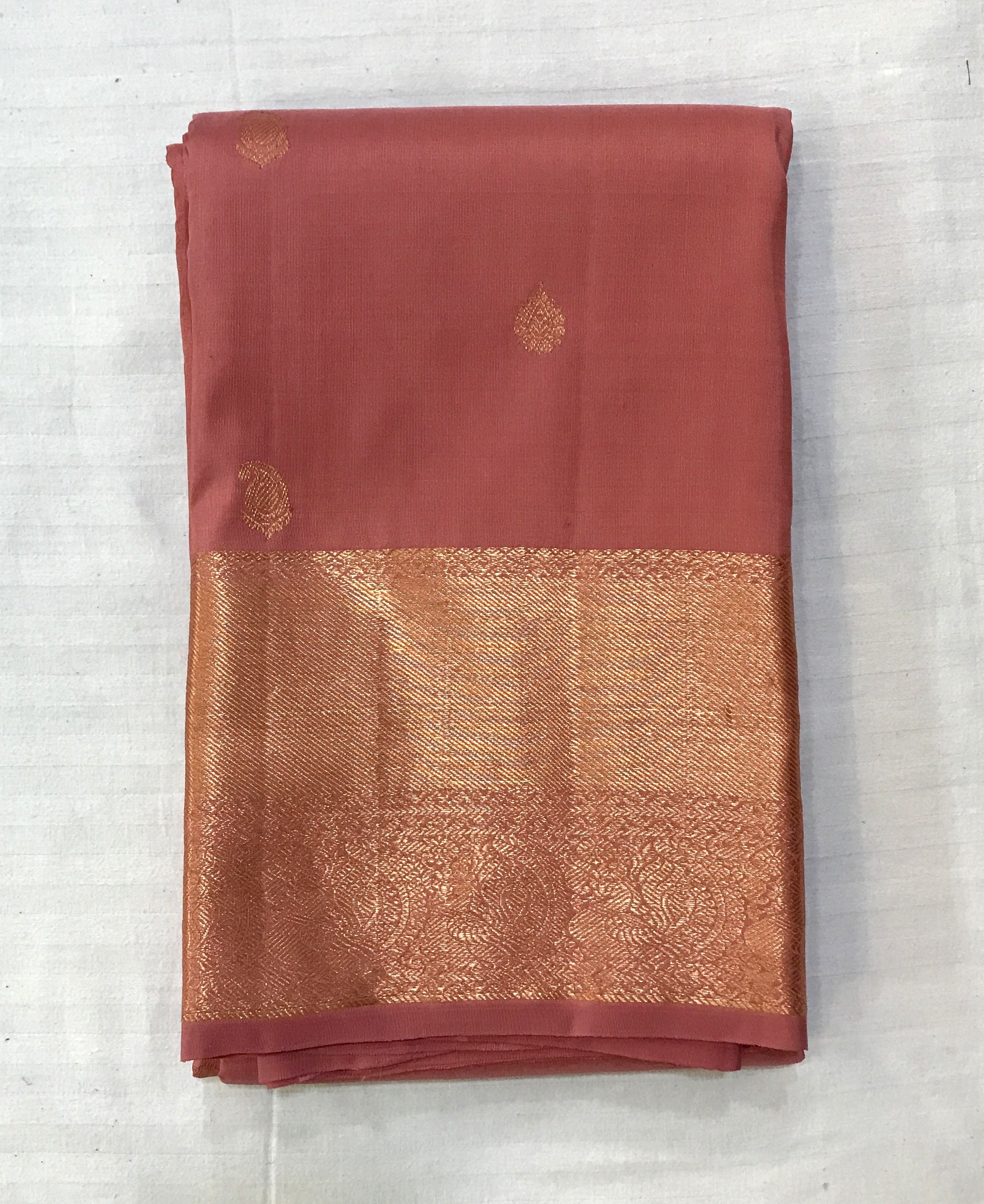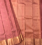 This stunning Kanjeevaram saree in pure silk showcases a vibrant peach-pink , handwoven to exude traditional charm. The saree features intricate and uncommon floral and koyari alternate butti designs, beautifully highlighted by a golden zari border. The richly woven pallu enhances its classic appeal, making it a timeless piece. The elegant color combination ensures it will look splendid both day and night. The border combines the traditional Kanjeevaram design, adding a designer touch. Paired with a self-colored blouse adorned with a broad zari border, this saree epitomizes traditional elegance with a modern twist.