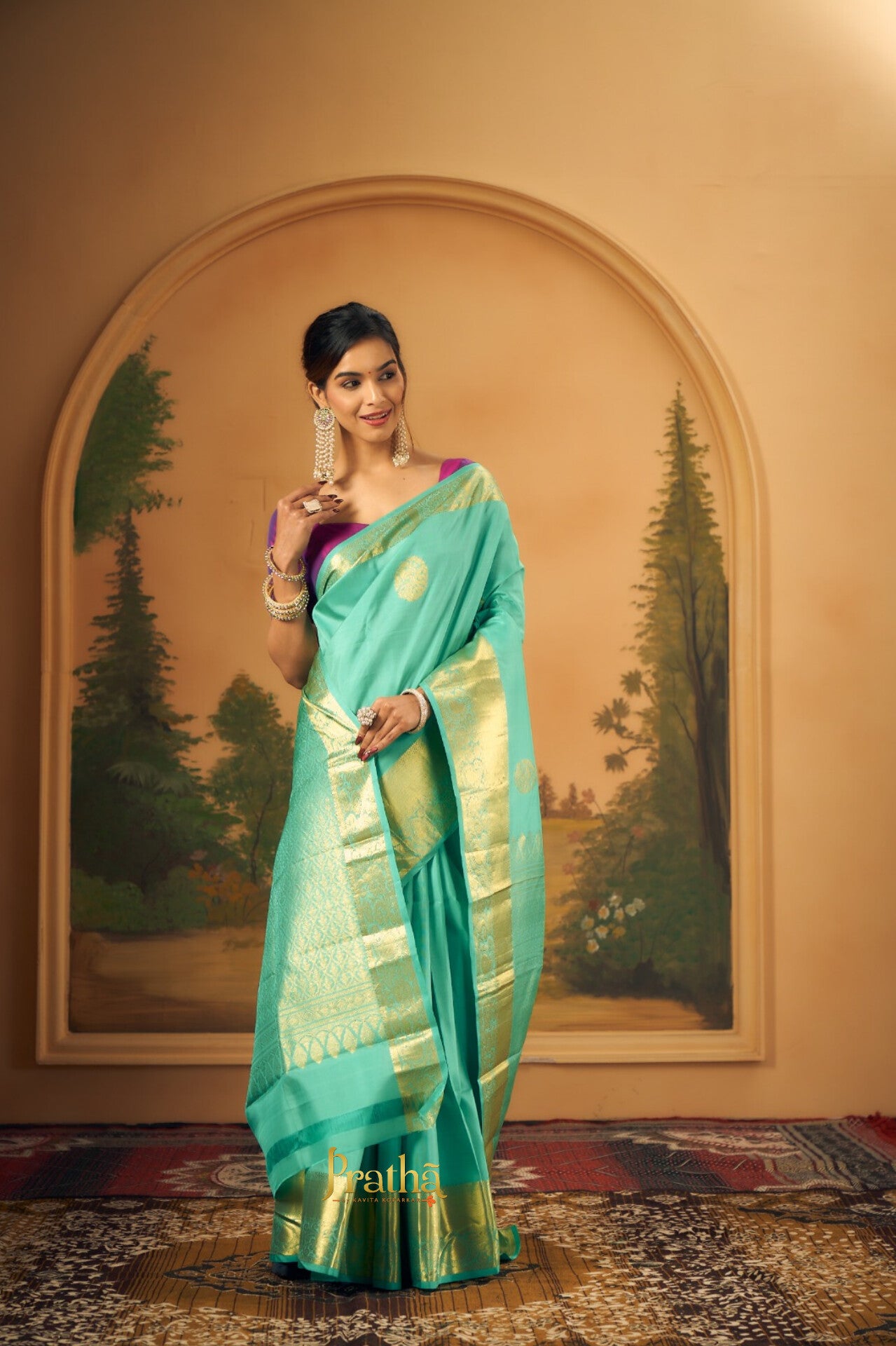 This perfect combination of pista-green with broad golden zari border, there is a balance of colour in this Pratha Kanjeevaram. The intricate big leaf shaped butti in golden zari and the equally intricate golden zari design on the border and a very beautiful zari pallu makes this saree an attractive one!