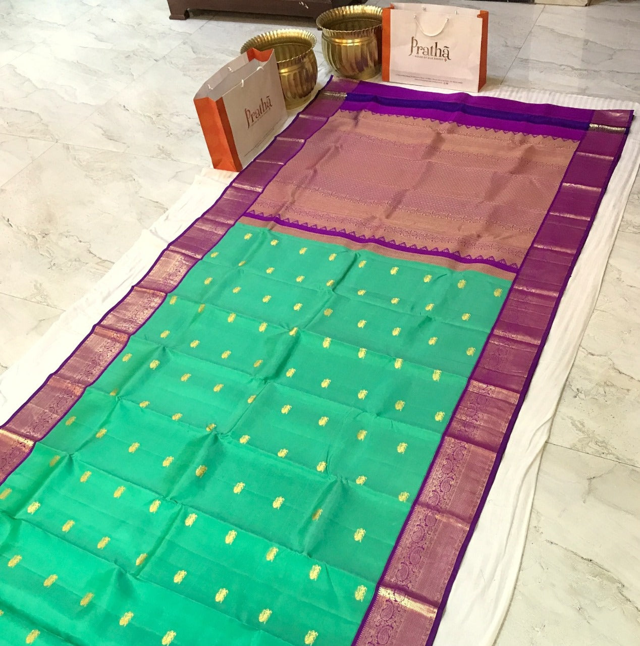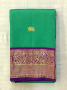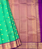 This unique combination of parrot green pure silk handwoven Kanjeevaram, this one is perfectly traditional. The delicate butti designs, golden zari border and richly woven Pallu make this weave a classic! Thanks to its beautiful colour with the combination of gold, this Kanjeevaram will look great in the day as well as at night! Do not miss that, this saree has a very beautiful golden zari border looks outstanding when we wear.