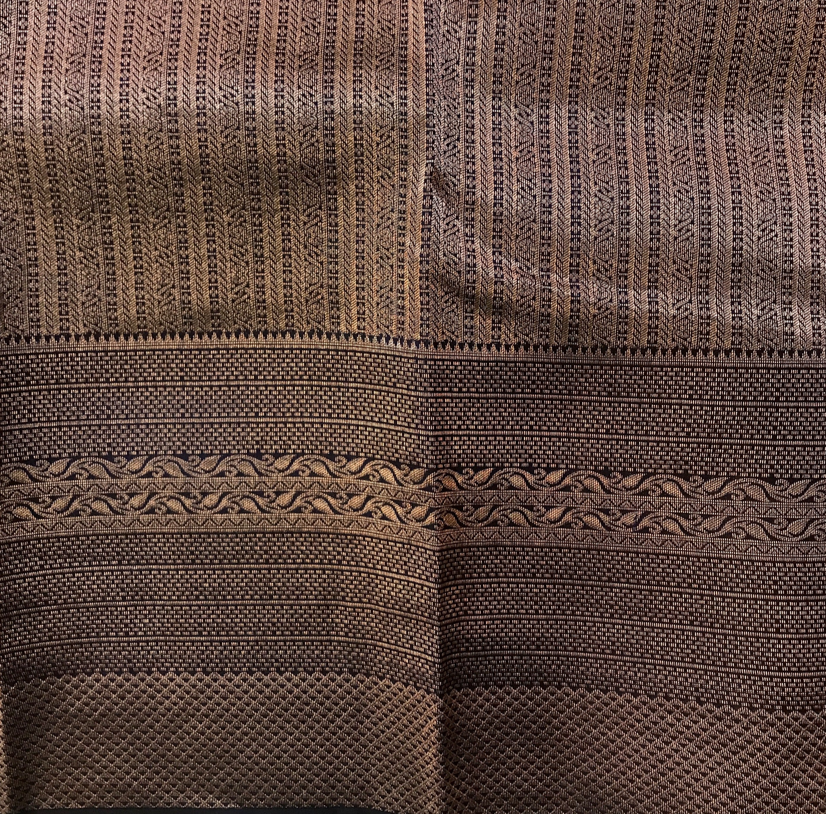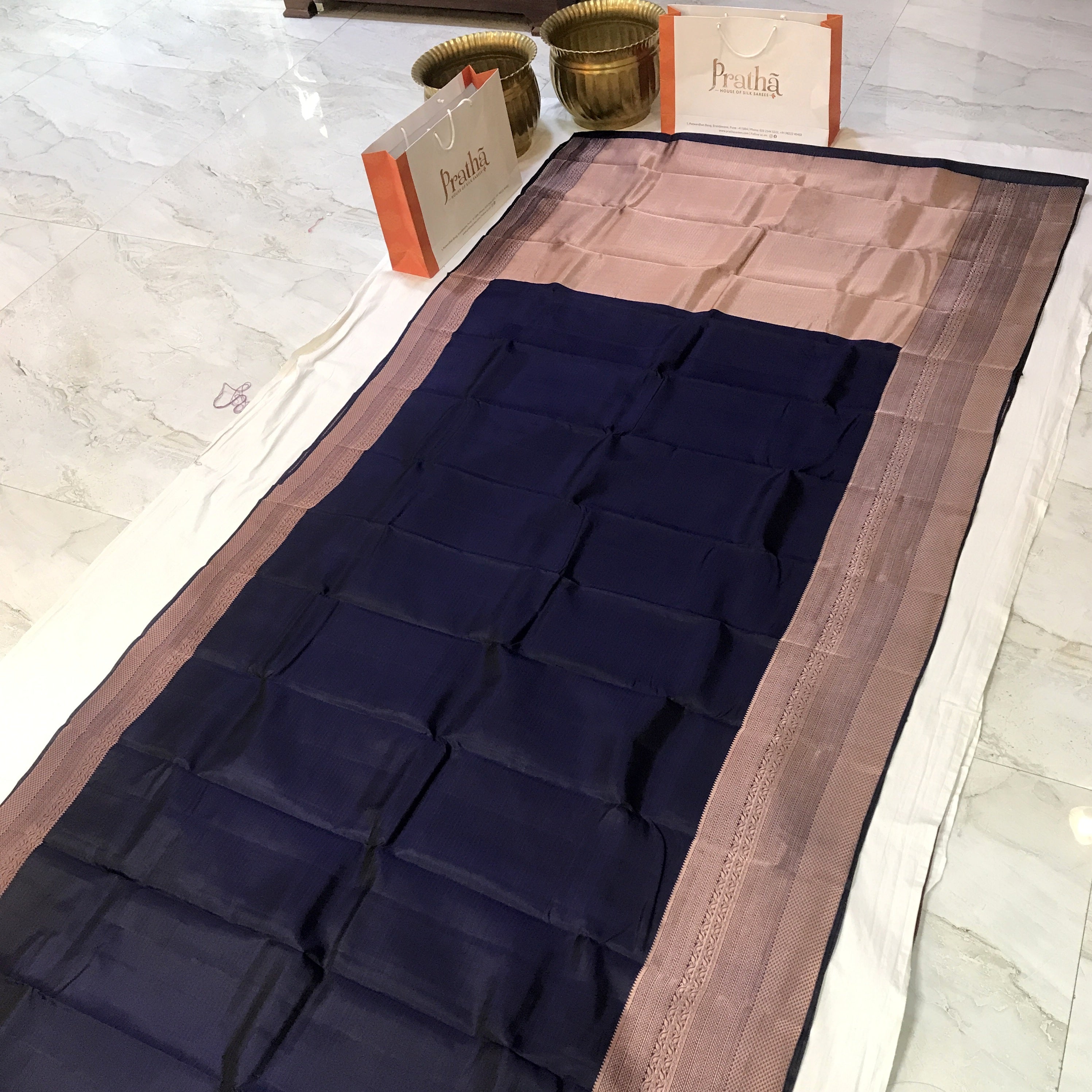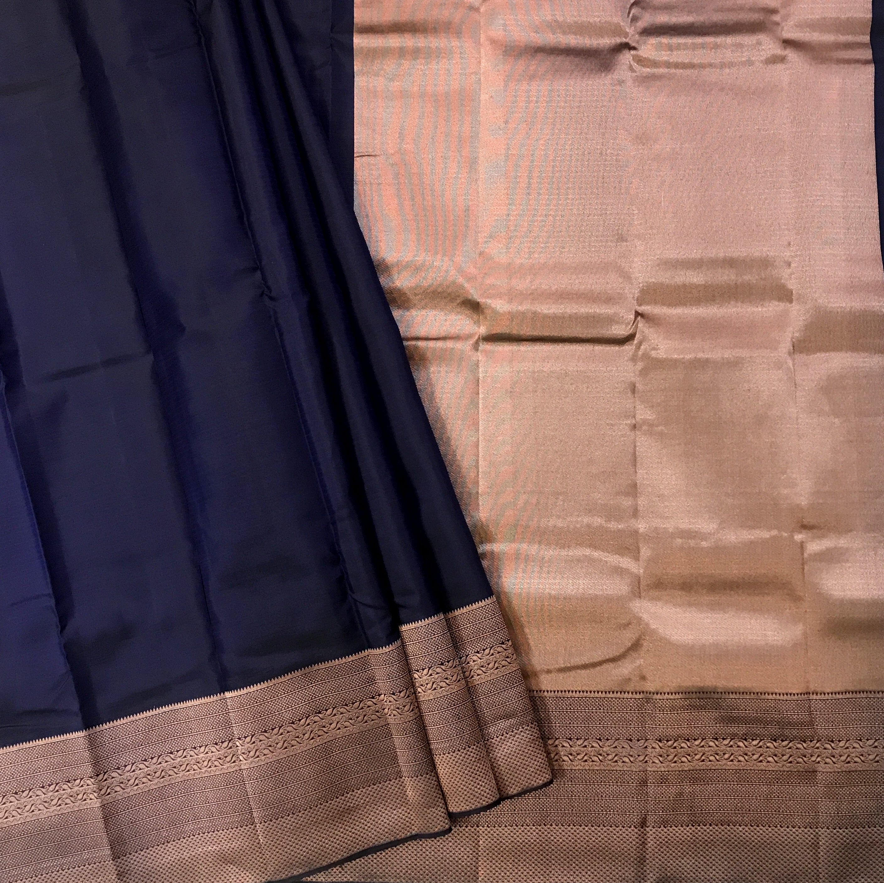 A very beautiful navy blue plain Kanjeevaram with very beautiful broad copperish zari border looks ravishing. May you be casual or at a party, or a small function, you can flaunt it at anywhere.
