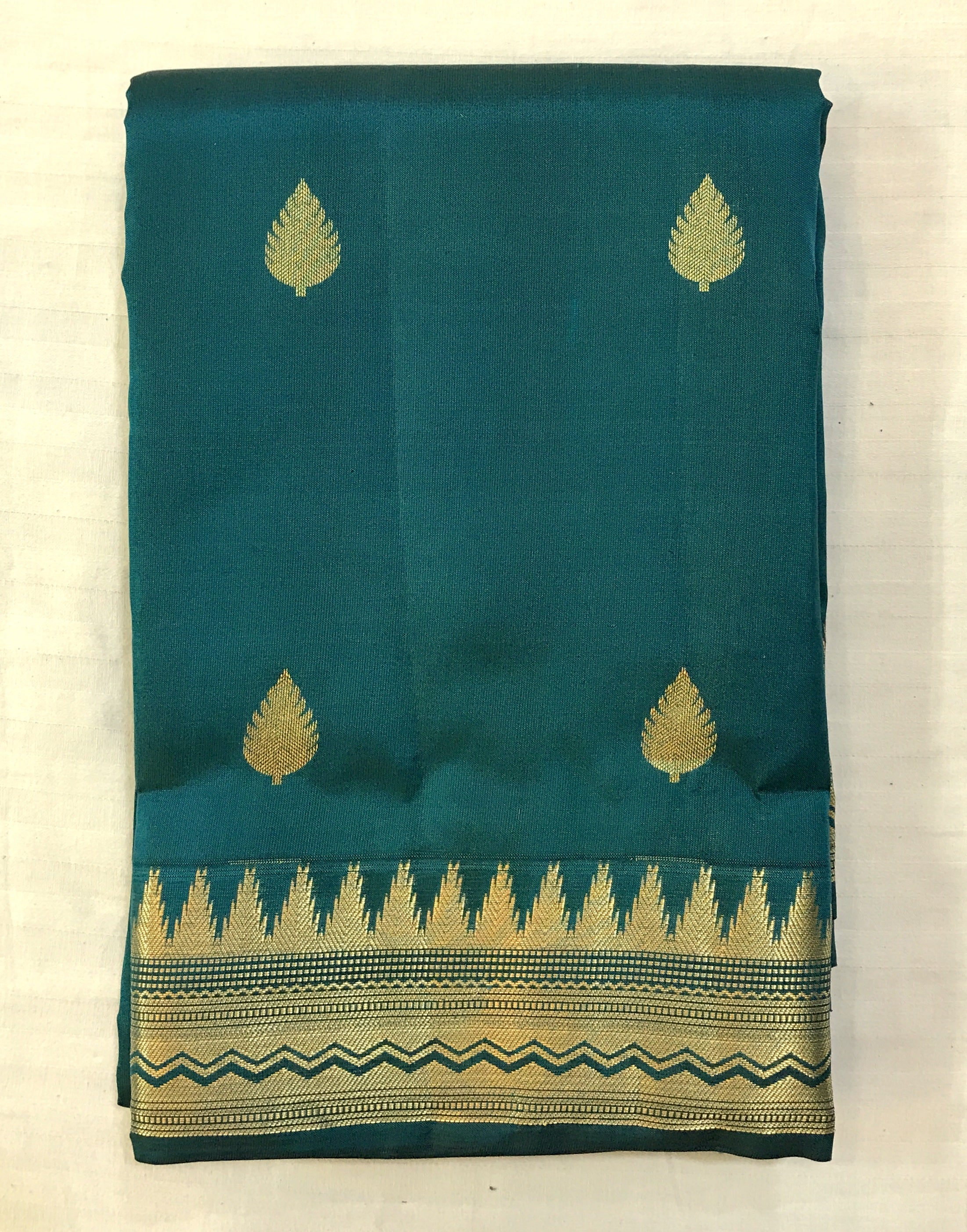 A lovely shade of peacock green, this shade of power loom Kanjeevaram kanchi silk saree always wins hearts, especially when it teams up with a small temple design golden zari at its border and pallu. This Kanjeevaram has an elaborate small leaf zari design butti add to the grace of this weave. The traditional zari pallu gives this saree festive touch.