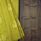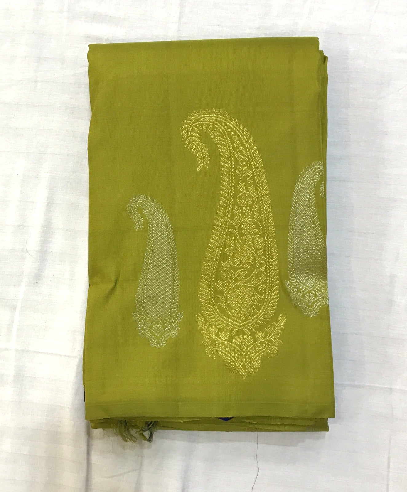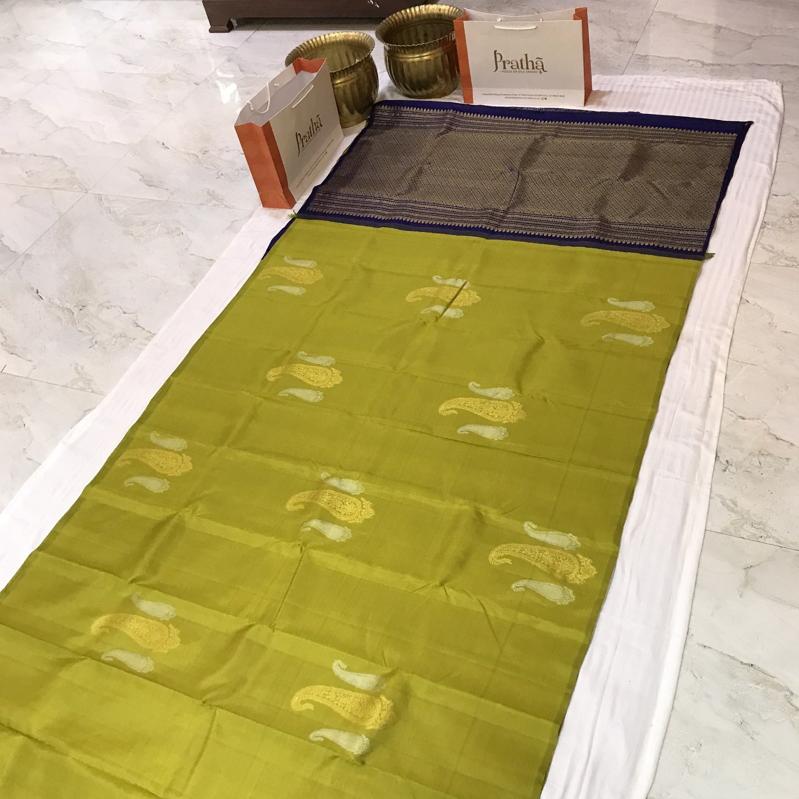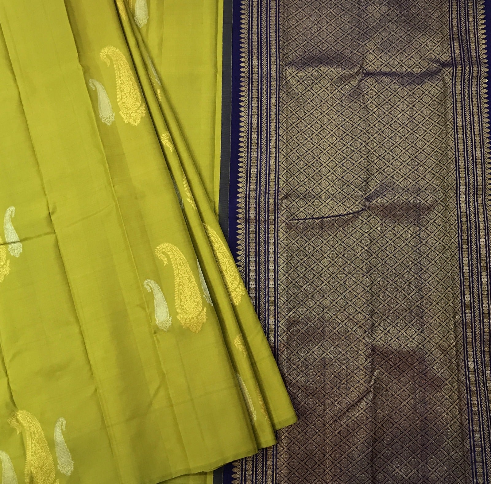 This beautiful shade of green pure silk handwoven Kanjeevaram, this one is perfectly traditional. The delicate koyari butti with golden-silver butti designs with richly woven Pallu make this weave a classic! Thanks to its beautiful colour this Kanjeevaram will look great in the day as well as at night!