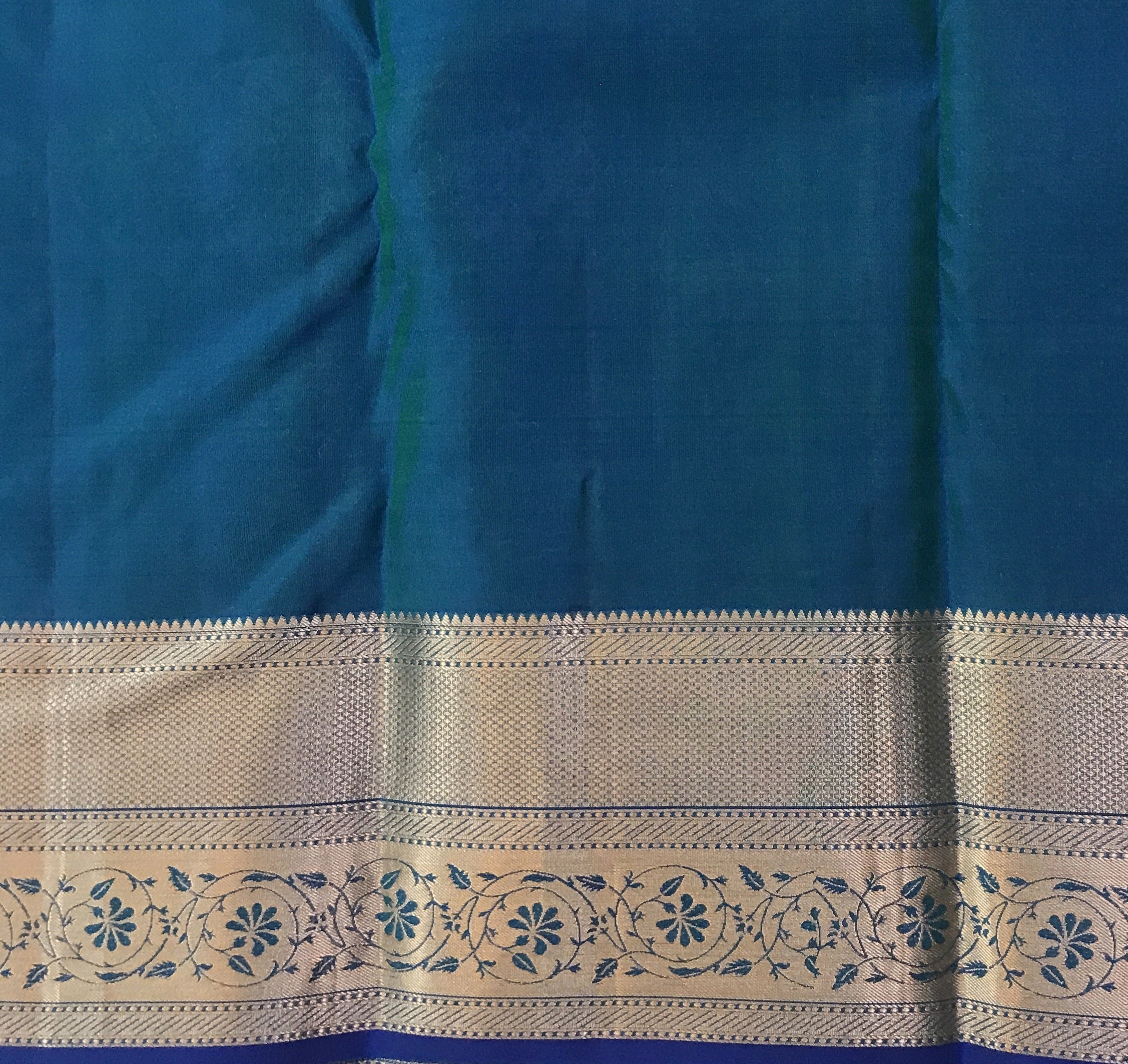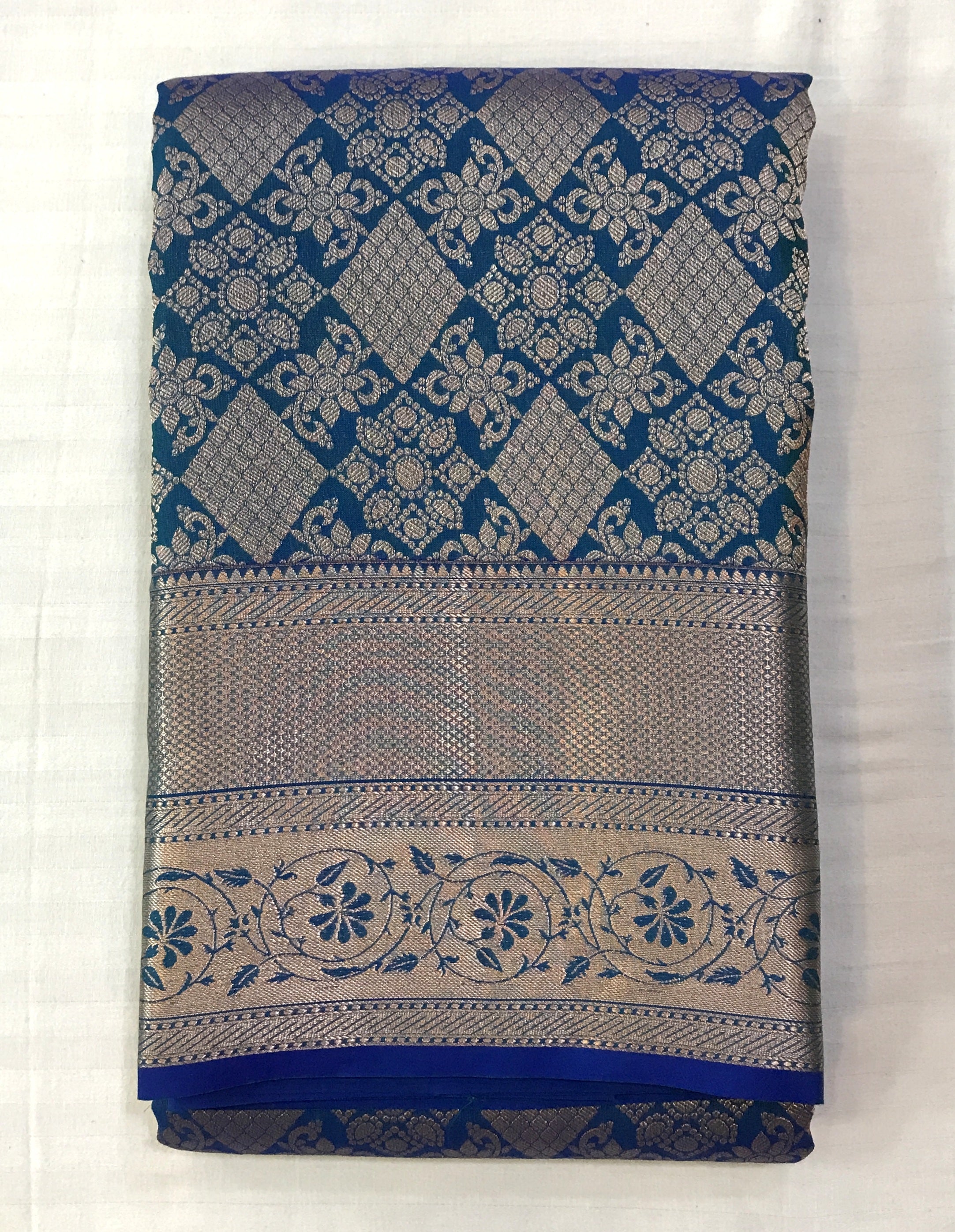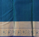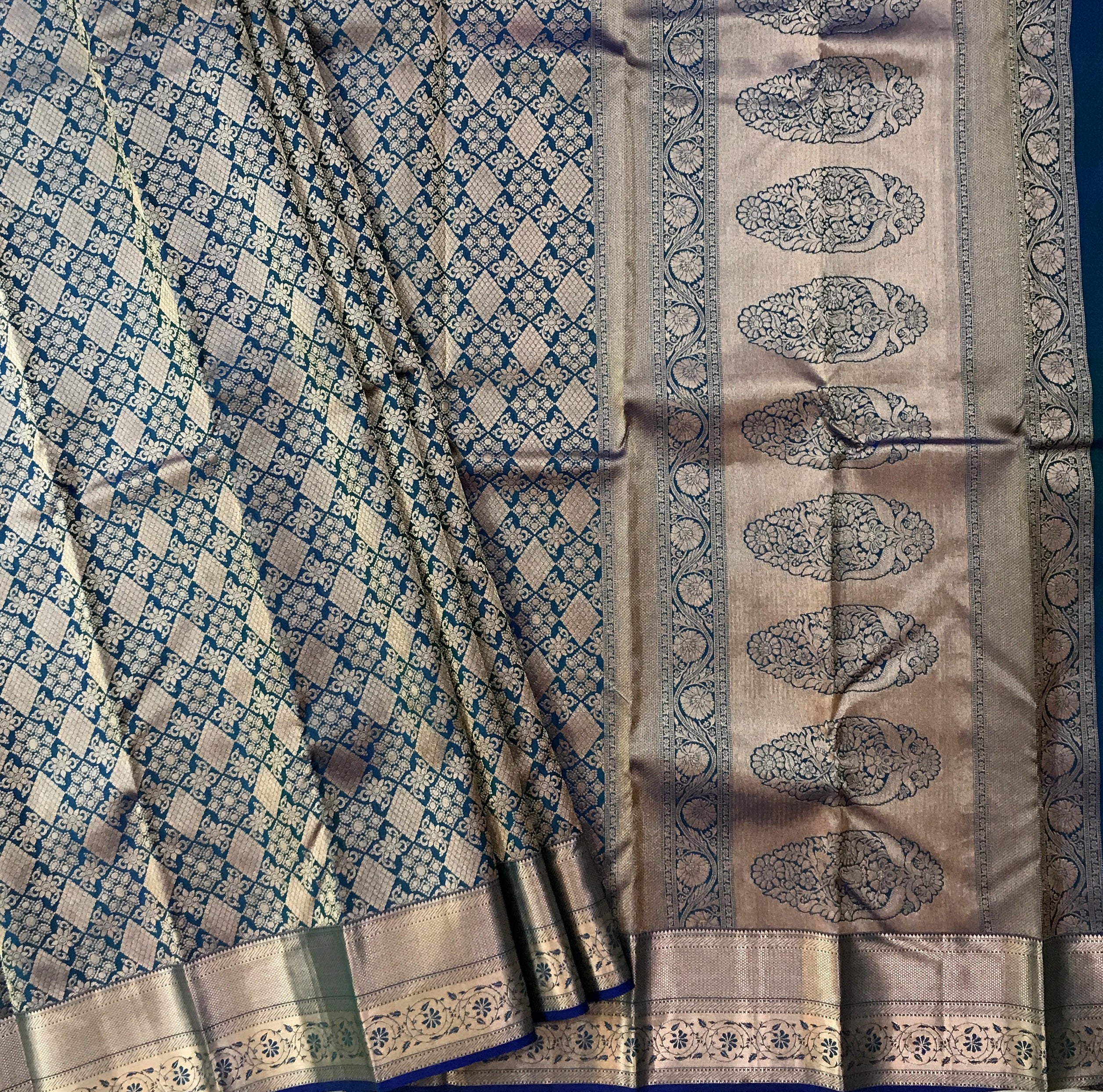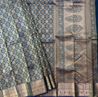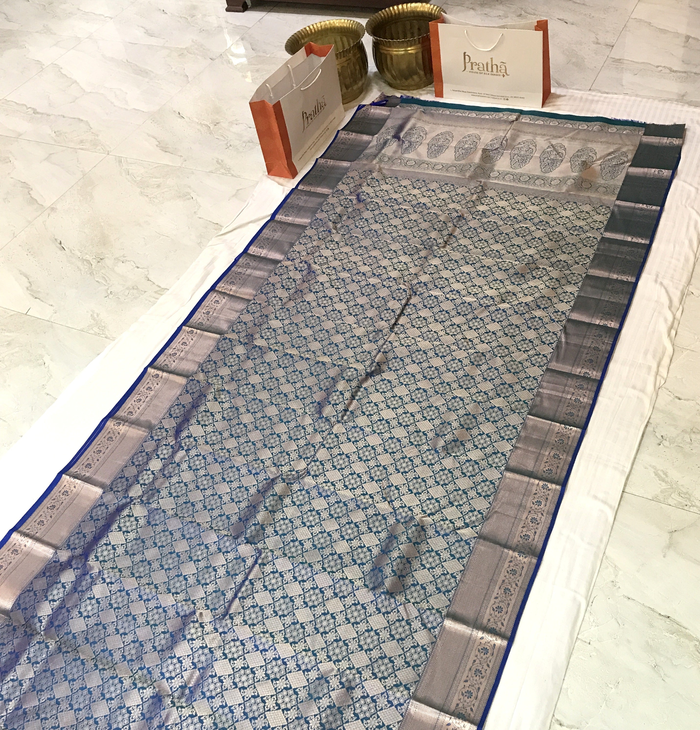 This sophisticated handwoven Kanjeevaram saree features a serene silver–blue palette, beautifully elevated by intricate geometric floral motifs woven across the body. The delicate interplay of silver zari with deep blue creates a refined, shimmering effect that adds understated opulence to the weave. The pallu stands out with its richly detailed traditional motifs arranged in vertical panels, showcasing exceptional craftsmanship. Finished with an elegant silver zari border adorned with fine floral patterns, this saree is a perfect choice for those who appreciate subtle grandeur and timeless traditional artistry.