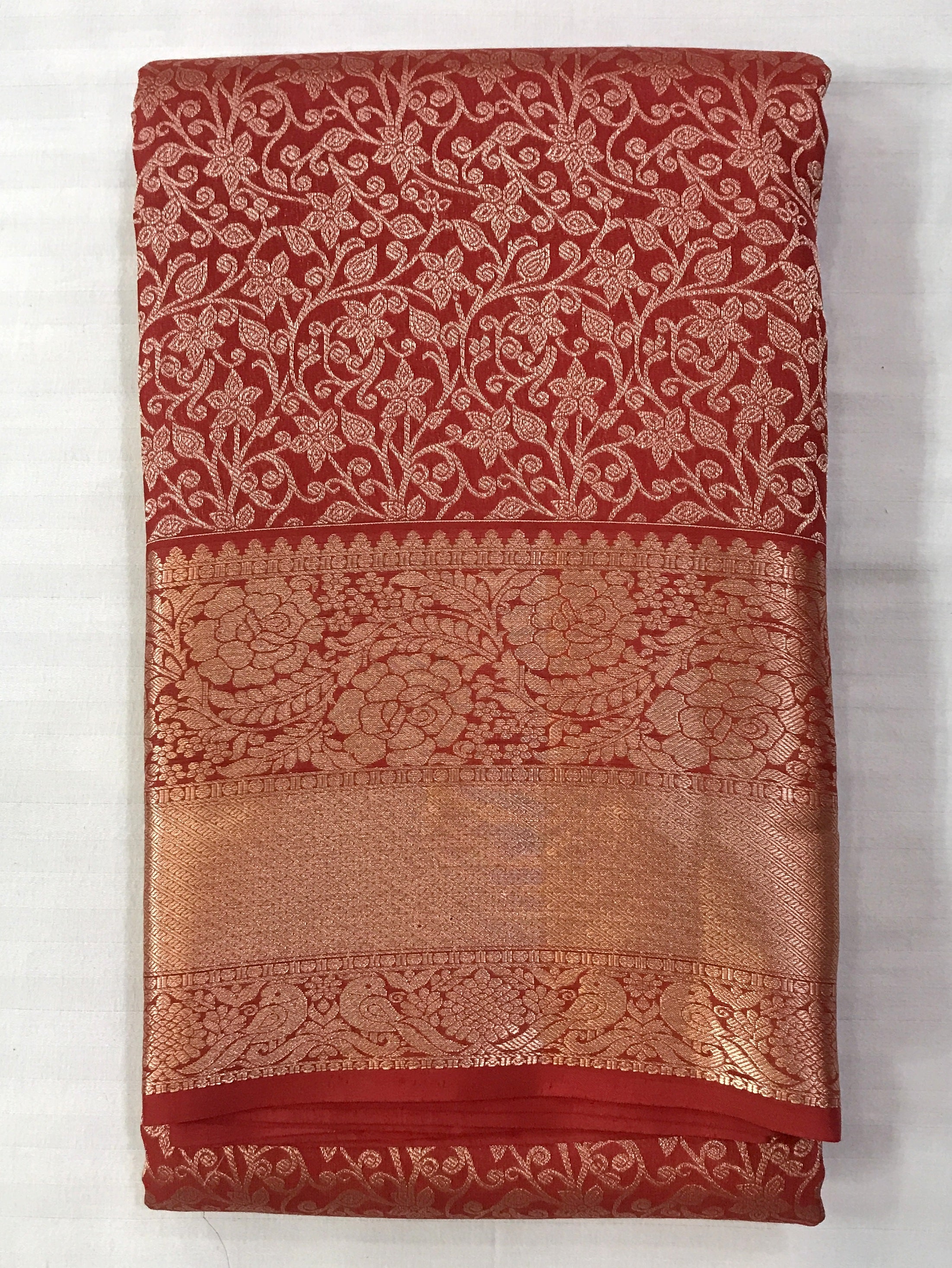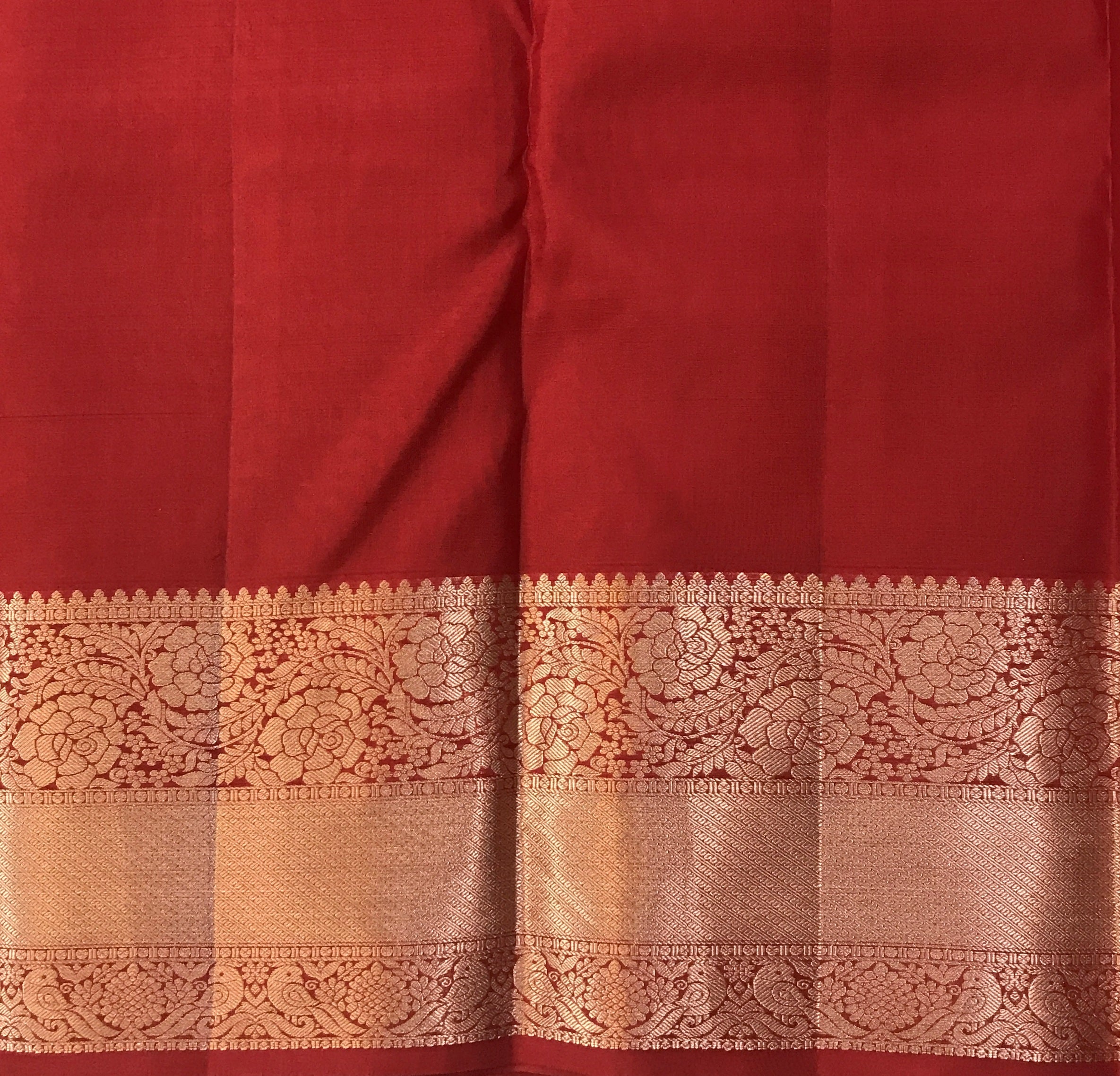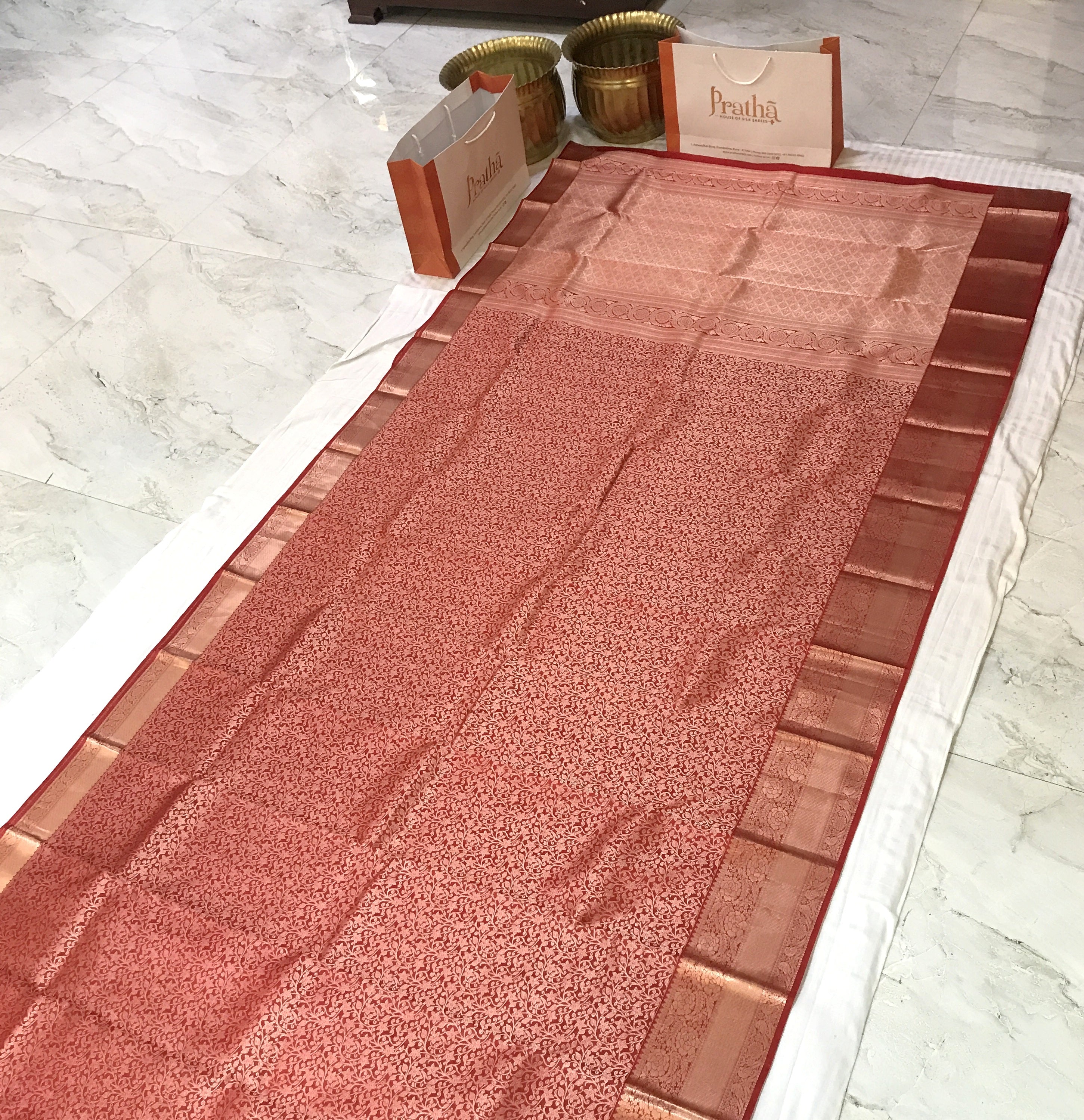 For those who adore red in all its glory, this exquisite power loom Kanjeevaram saree is a perfect choice. Showcasing a captivating shade of red it features an elegant Copperish zari brocade pattern woven with finesse, making it an extraordinary piece. The saree is accentuated by a self-colored border adorned with intricate zari work, seamlessly blending tradition and modernity. Paired with a matching blouse in the same red and zari border, this saree boasts a luxurious finish and impeccable craftsmanship, ensuring it stands out as a true masterpiece.