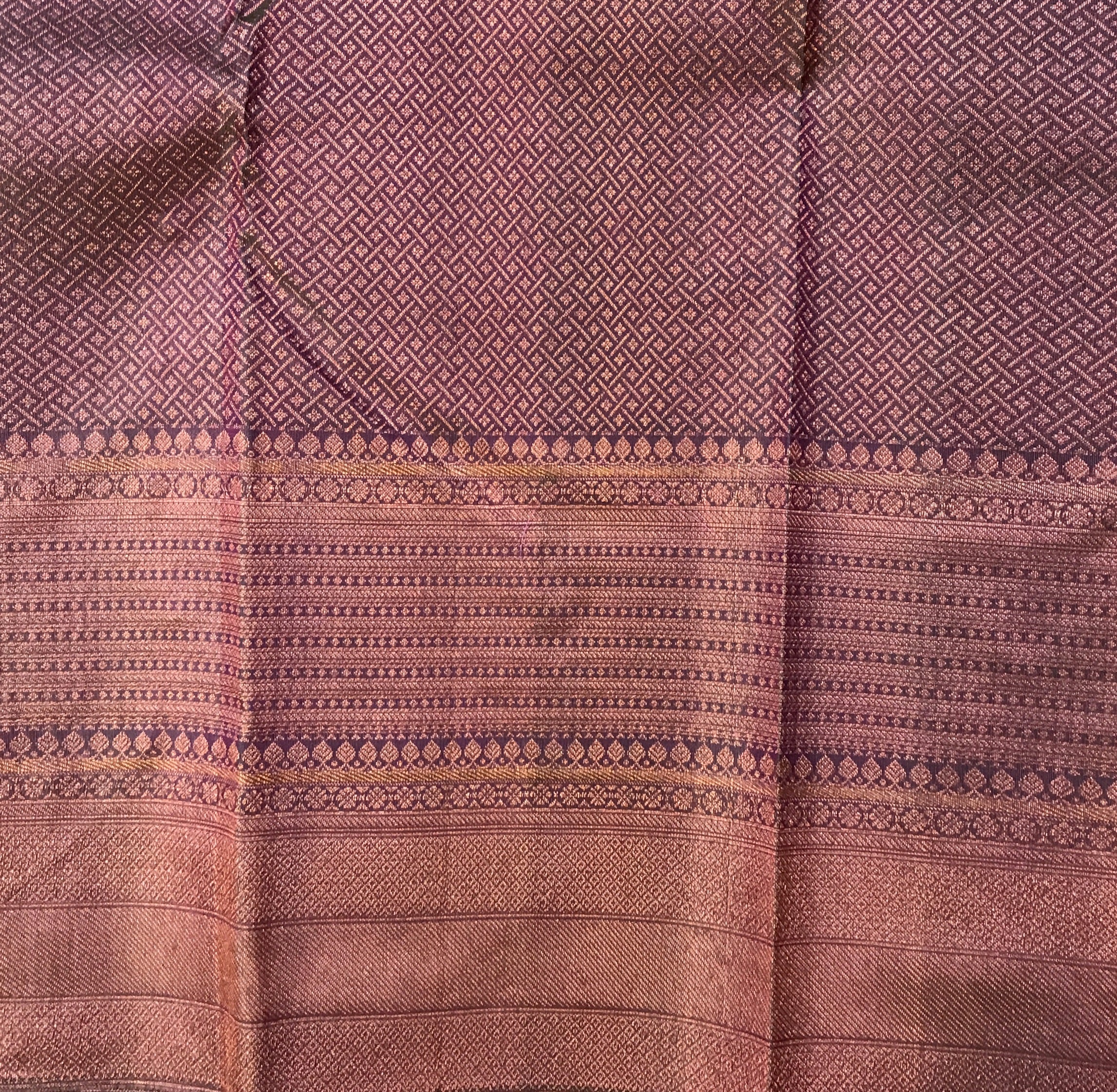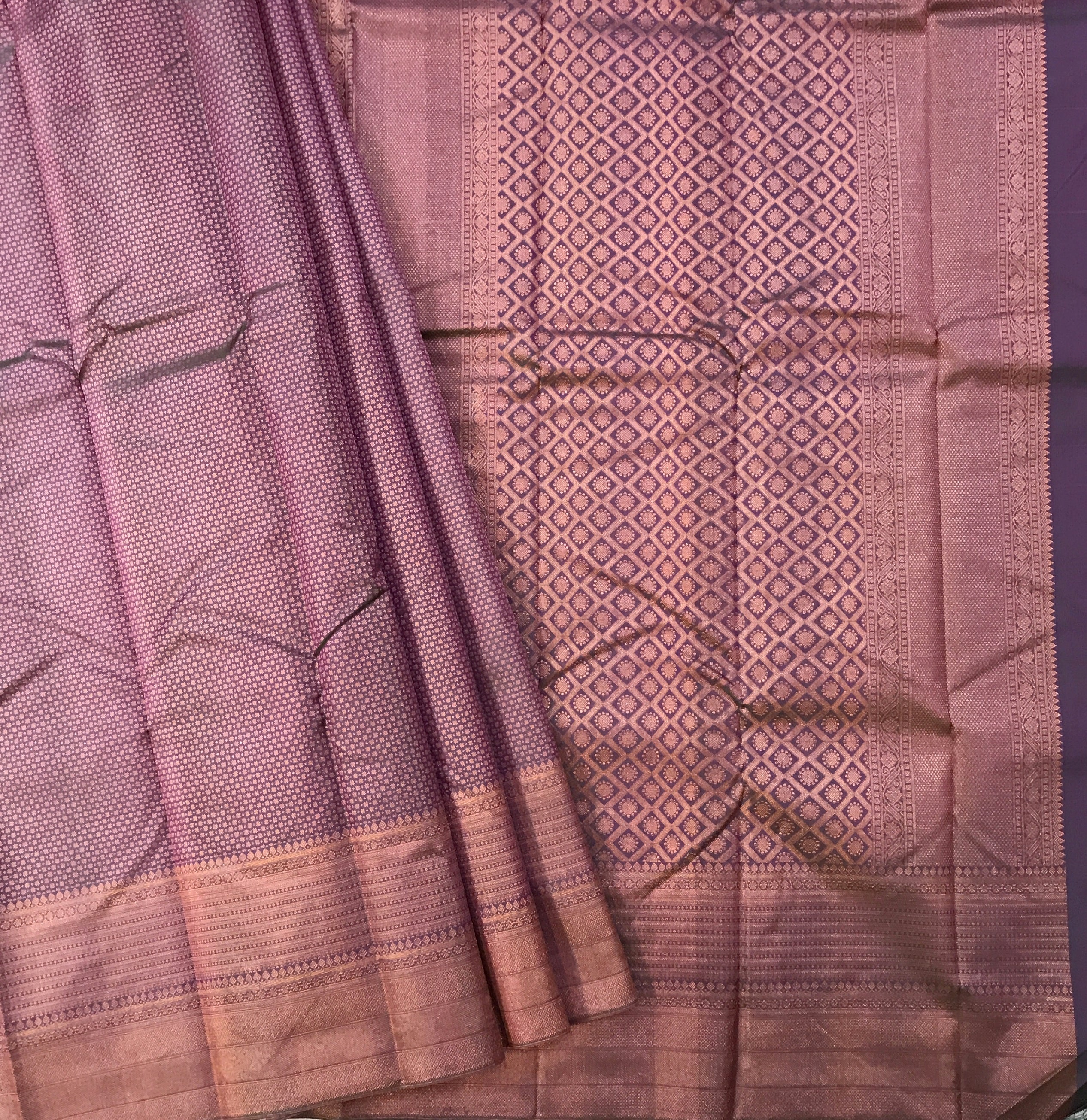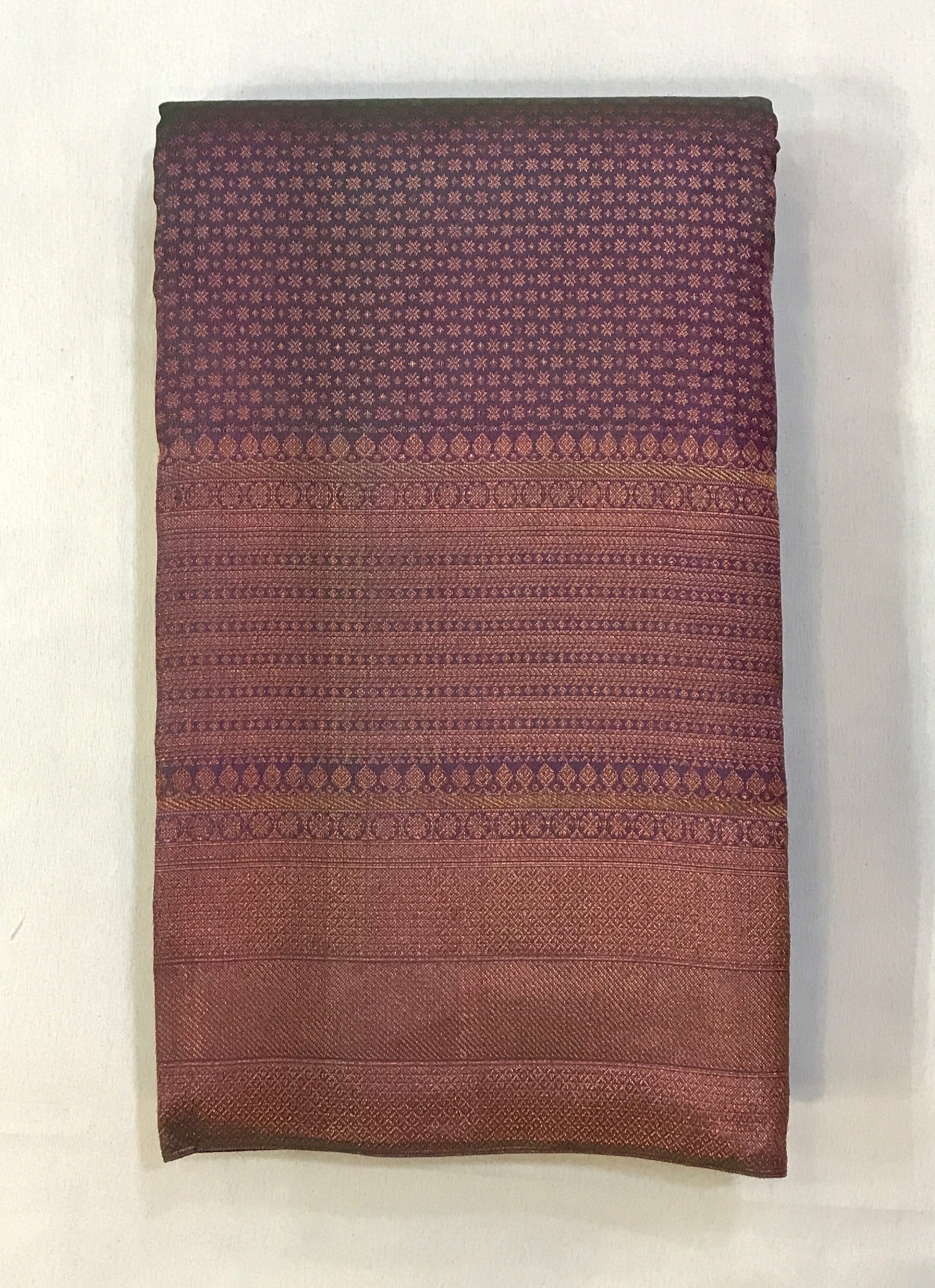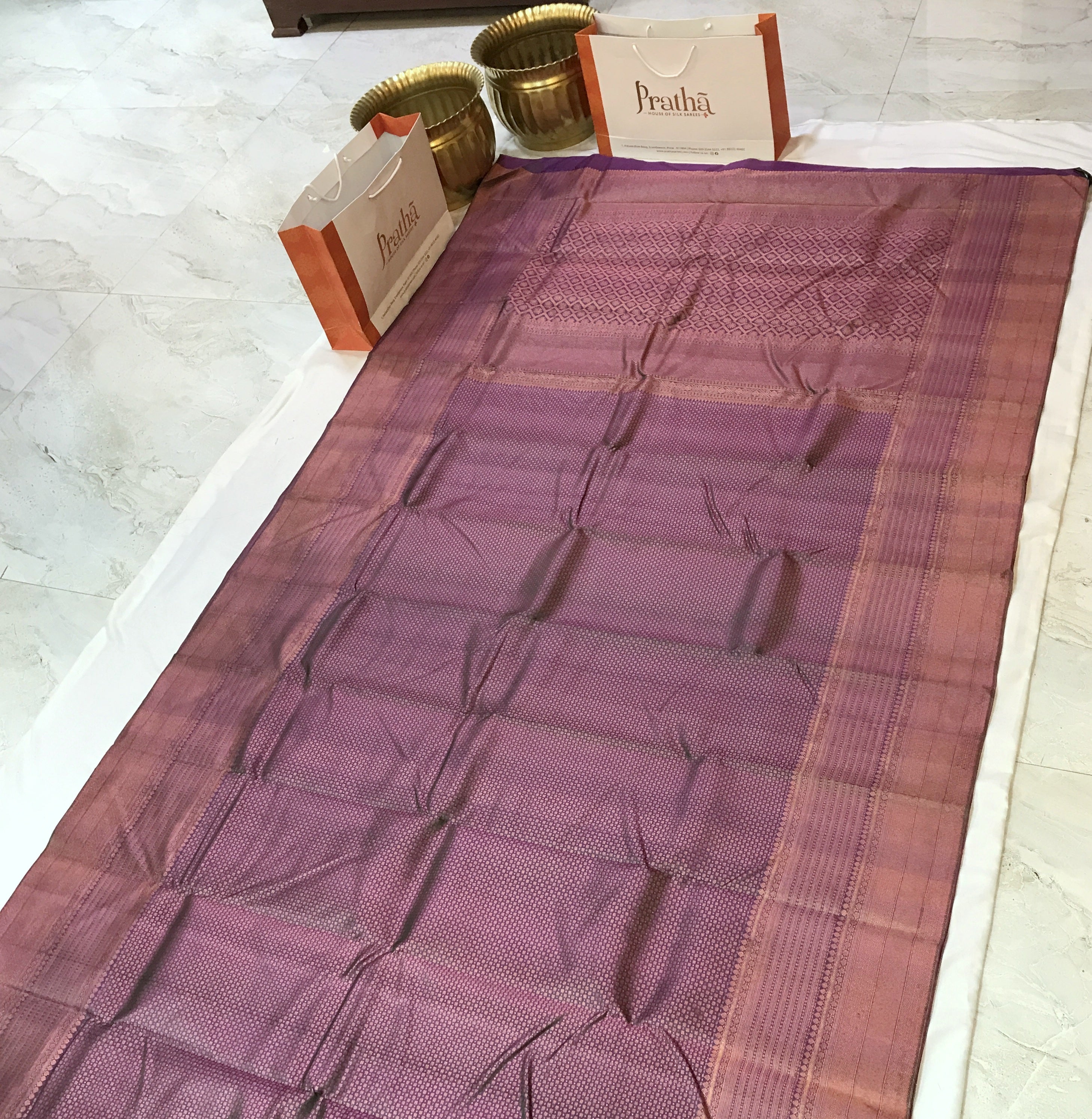 For those who adore Purple in all its glory, this exquisite power loom Kanjeevaram saree is a perfect choice. Showcasing a captivating shade of purple it features an elegant copperish zari brocade pattern woven with finesse, making it an extraordinary piece. The saree is accentuated by a self-colored border adorned with intricate zari work, seamlessly blending tradition and modernity. Paired with a matching blouse in the same purple and zari border, this saree boasts a luxurious finish and impeccable craftsmanship, ensuring it stands out as a true masterpiece.