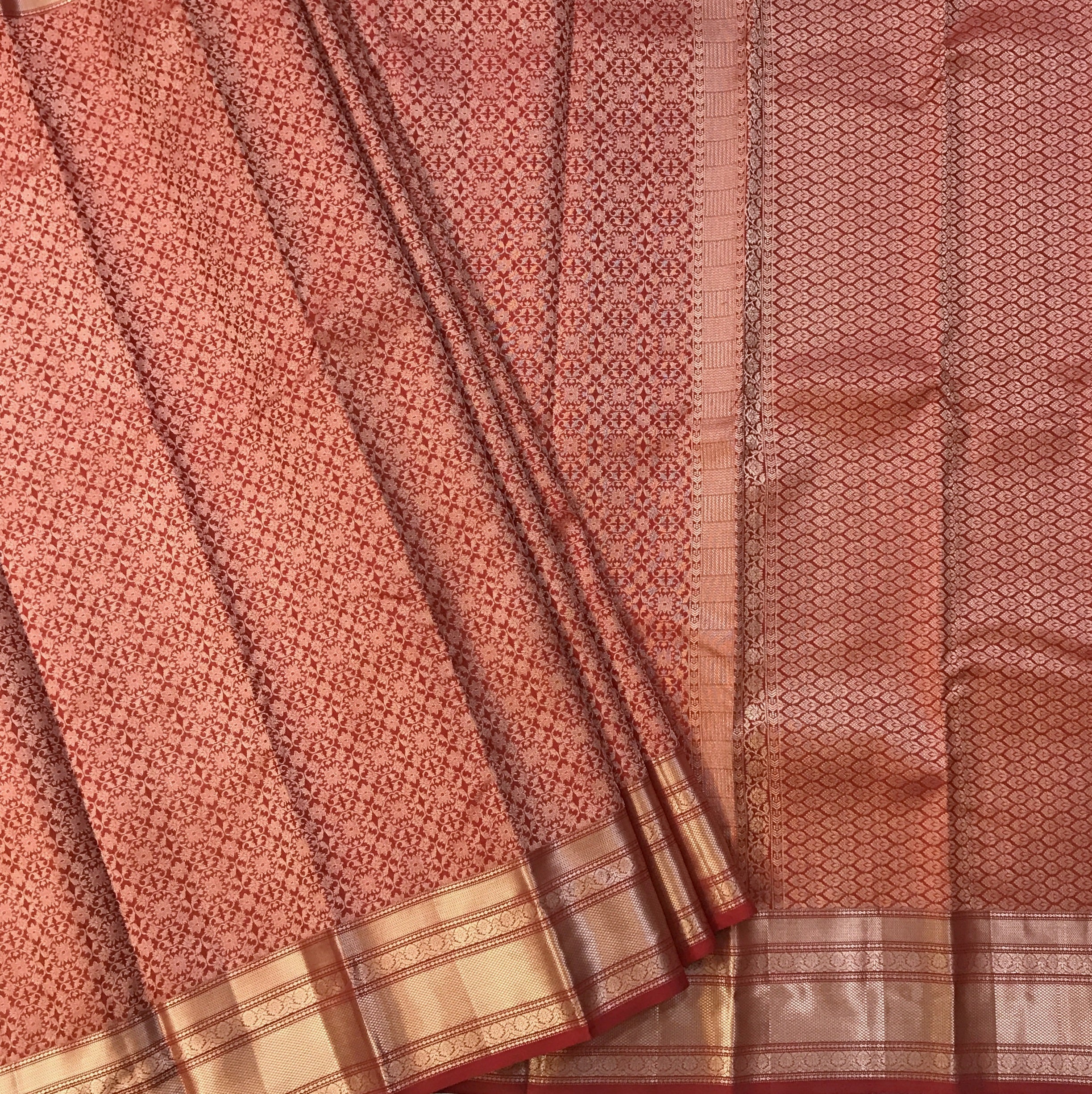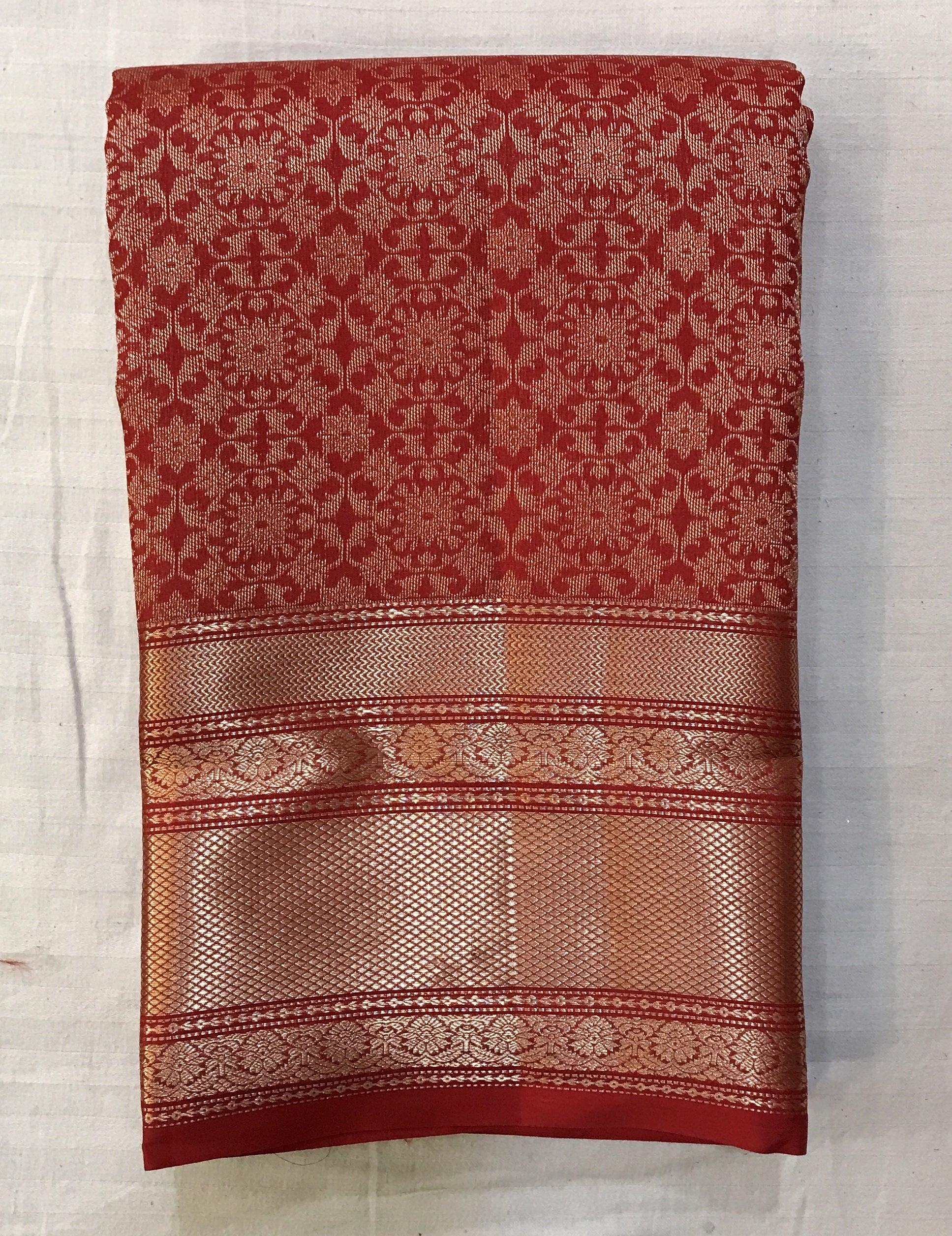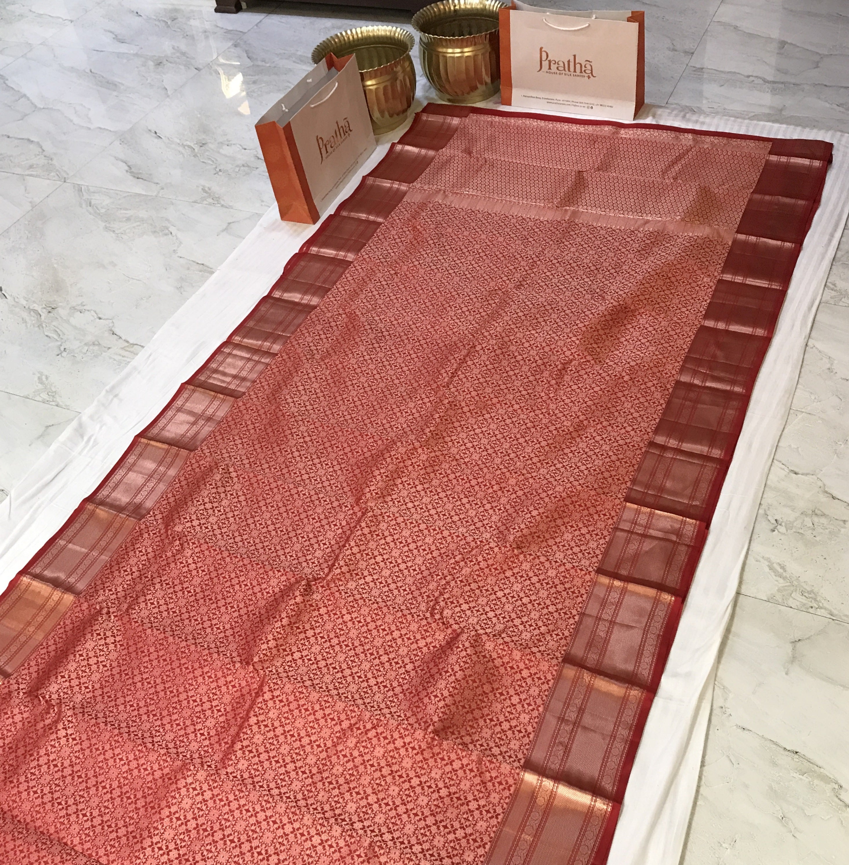 Drape yourself in timeless elegance with this stunning red power loom Kanjeevaram saree. Rendered in a mesmerizing shade of red, the saree is enriched with a graceful copper-hued zari brocade, skillfully woven to create a refined and opulent texture. The self-colored border, embellished with detailed zari motifs, beautifully bridges classic artistry and contemporary charm. Completing the look is a coordinated blouse in the same rich colour, enhanced with a zari-bordered finish. With its luxurious appeal and flawless craftsmanship, this saree is a striking choice for any special occasion.