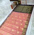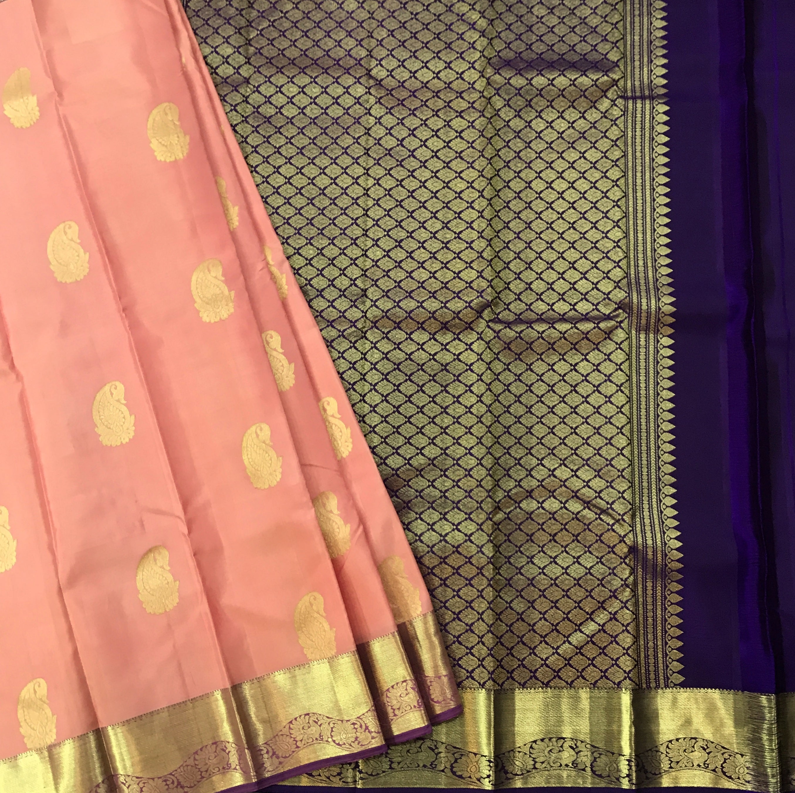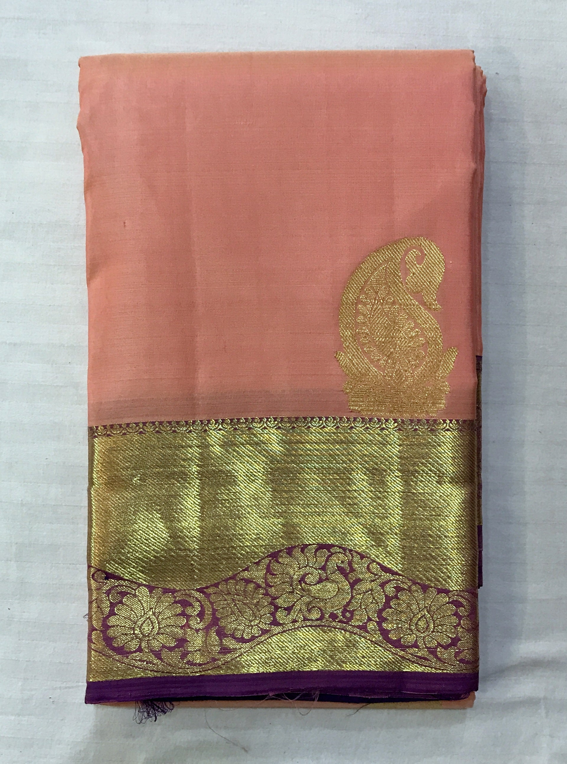A peach colour saree with a golden zari border looks incredible! This pure silk Kanjeevaram is a unique one. Apart from its combination of colours, the golden zari border with delicate koyri butti design are also beautiful as compared to the traditional Kanjeevaram designs . Do not miss the butti highlighted with golden zari thread! This is simply beautiful.