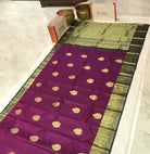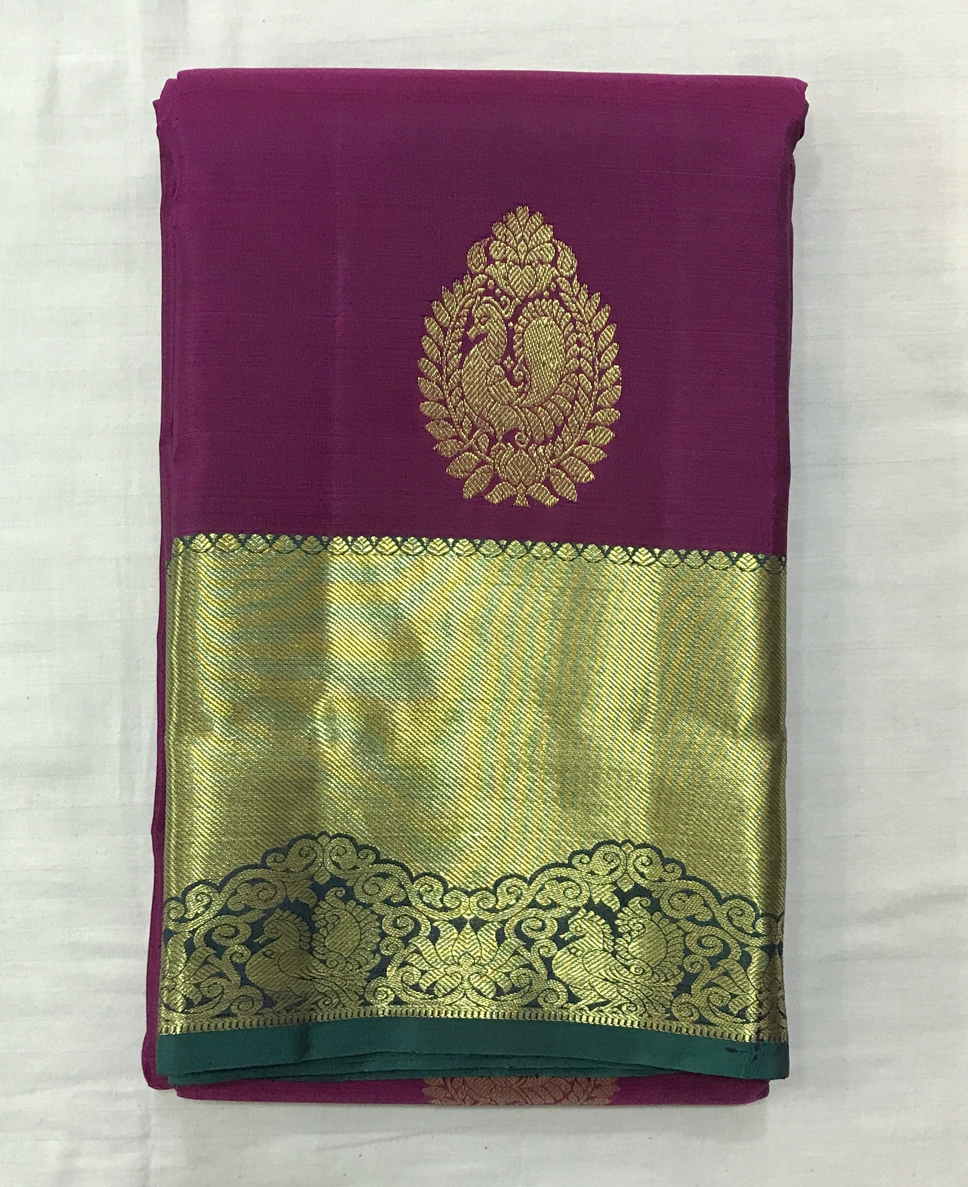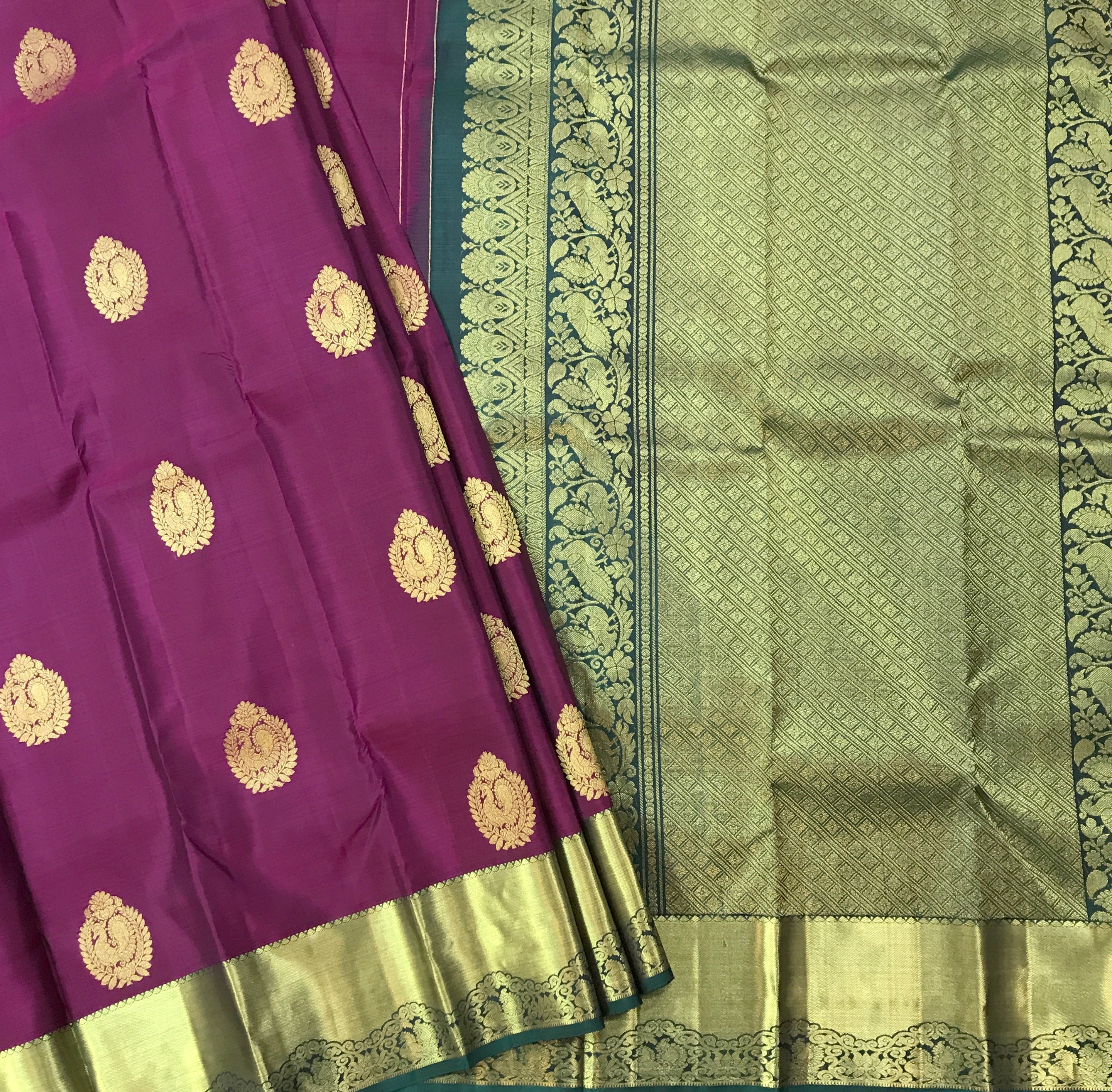 A pure magnta colour saree with a golden zari border looks incredible! This pure silk Kanjeevaram is a unique one. Apart from its combination of colours, the golden zari border with delicate unique butti design are also beautiful as compared to the traditional Kanjeevaram designs . Do not miss the butti highlighted with golden zari thread! This is simply beautiful.