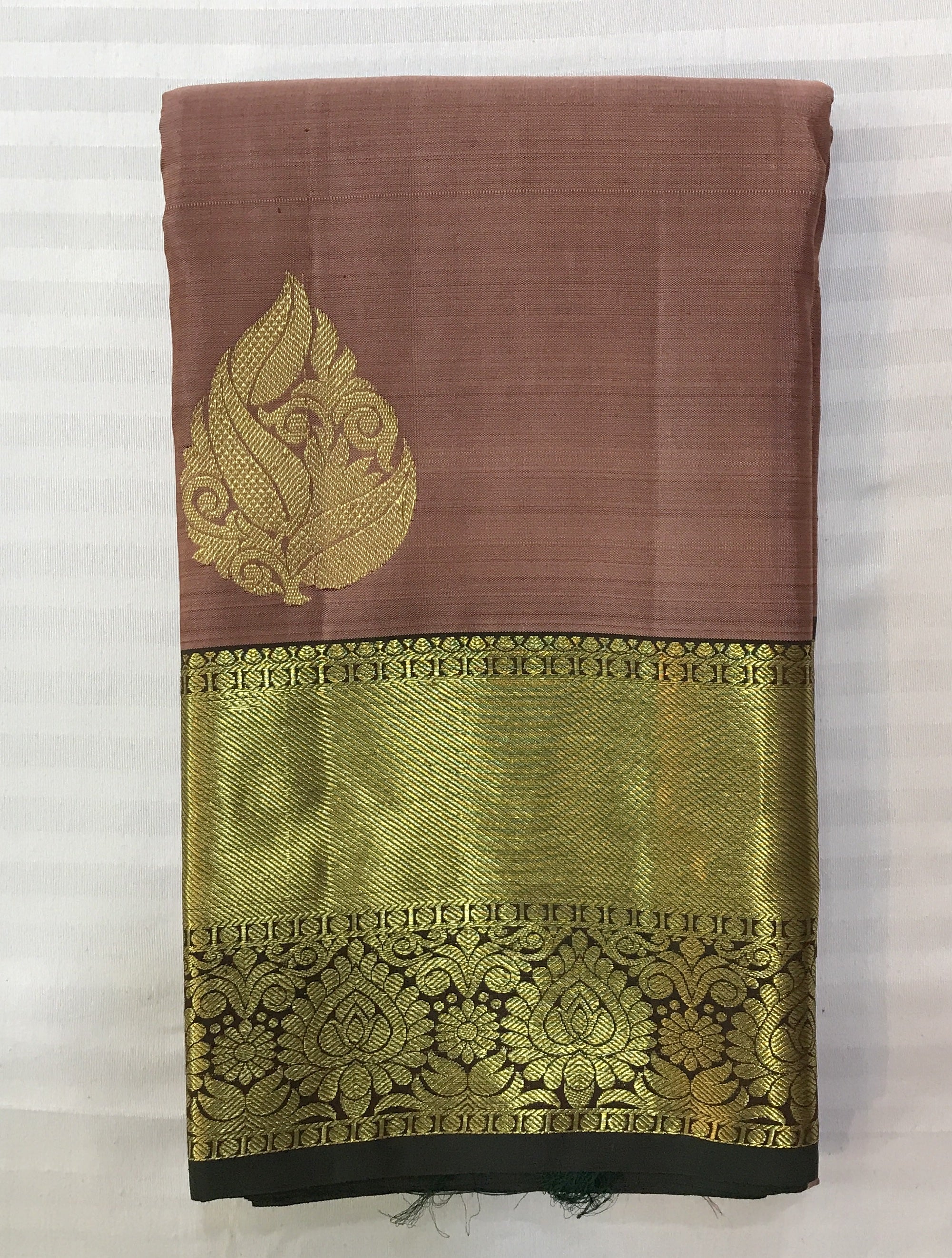 This phenomenal shade of pink pure silk handwoven Kanjeevaram, this one is perfectly traditional. The floral butti designs, contrast green golden zari border and richly woven Pallu make this weave a classic! Thanks to its beautiful colour with the combination of gold, this Kanjeevaram will look great in the day as well as at night! Do not miss that, this saree has a very beautiful golden zari border looks outstanding when we wear.