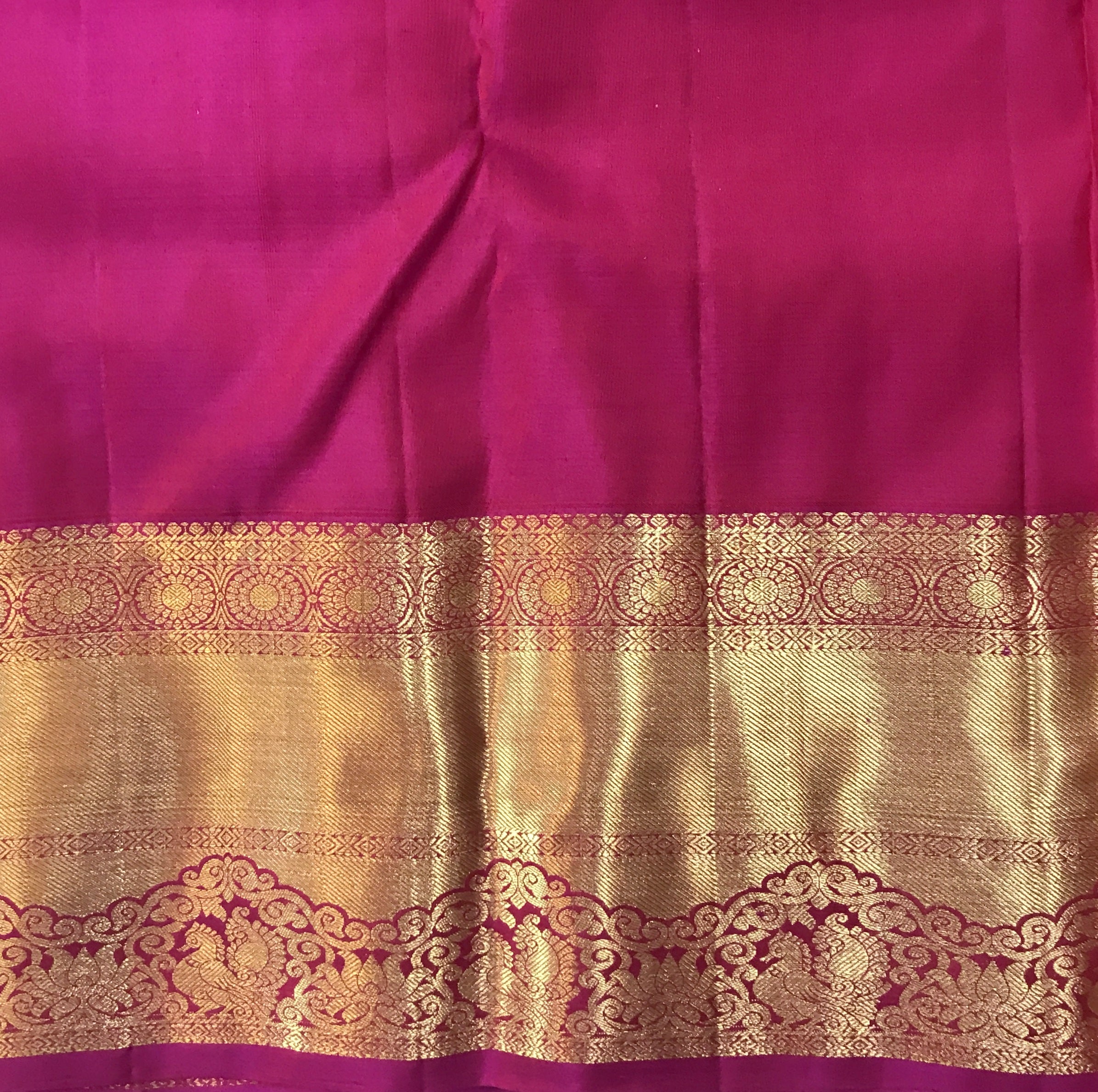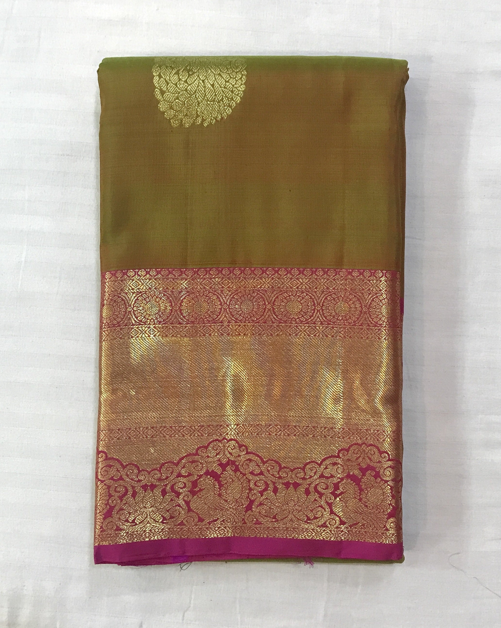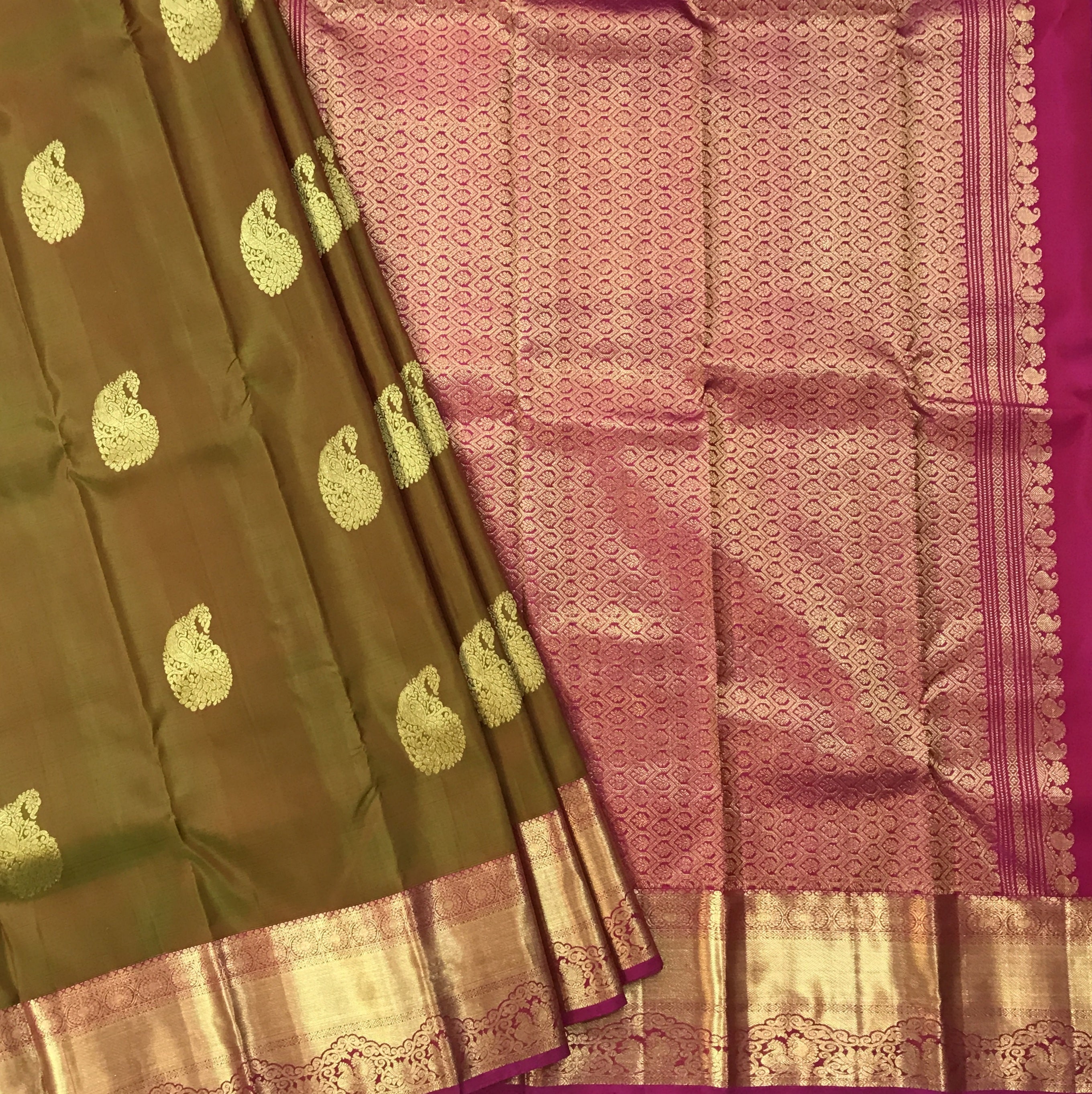 A beautiful shade of olive green and contrast pink coloured golden zari border pure silk handwoven Kanjeevaram looks great, this one is lustrous and perfectly traditional. The intricate peacock shaped butti woven in golden zari and golden zari border with richly woven zari pallu make this weave a classic! This Kanjeevaram will look great in the day as well as at night!