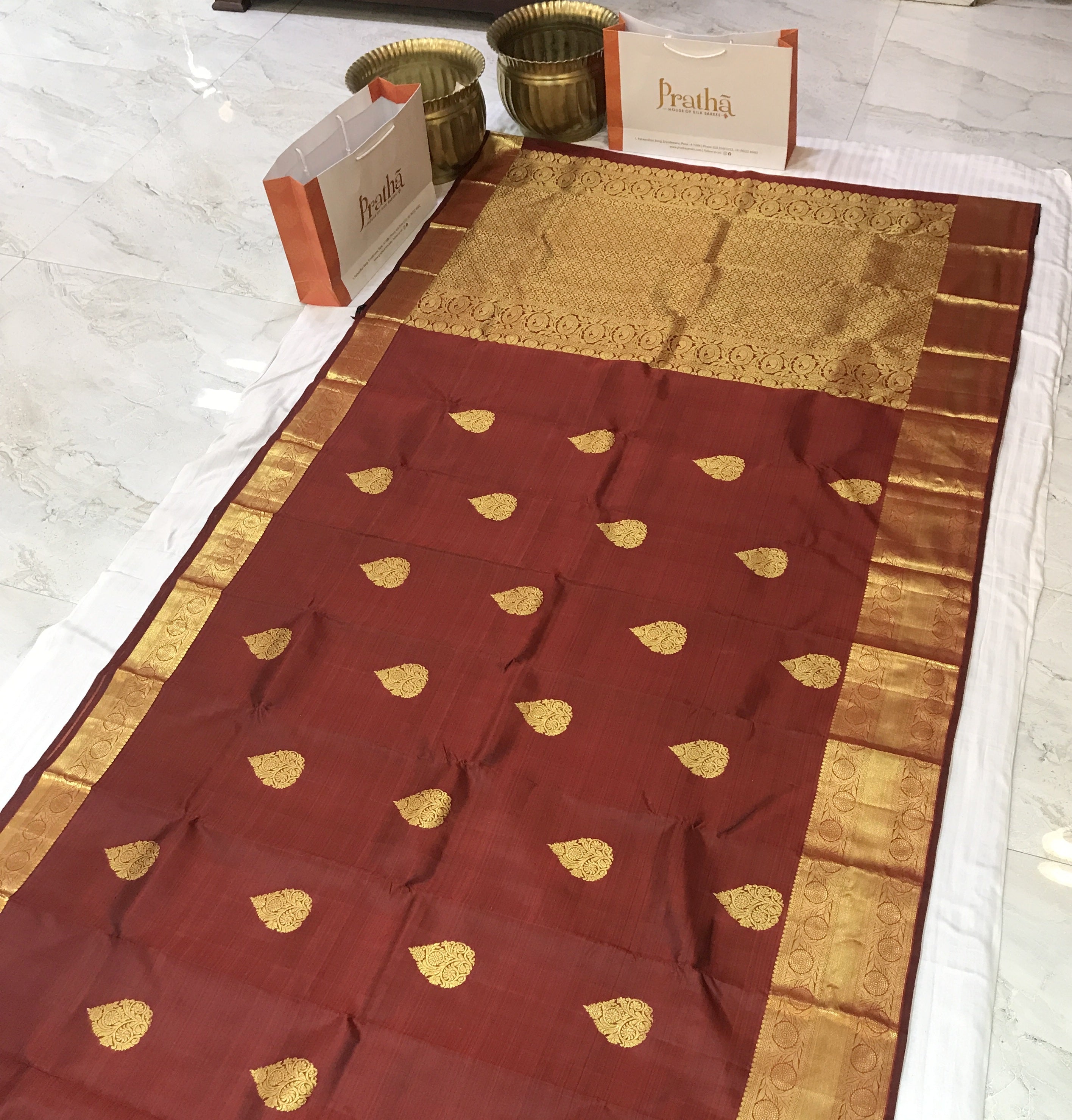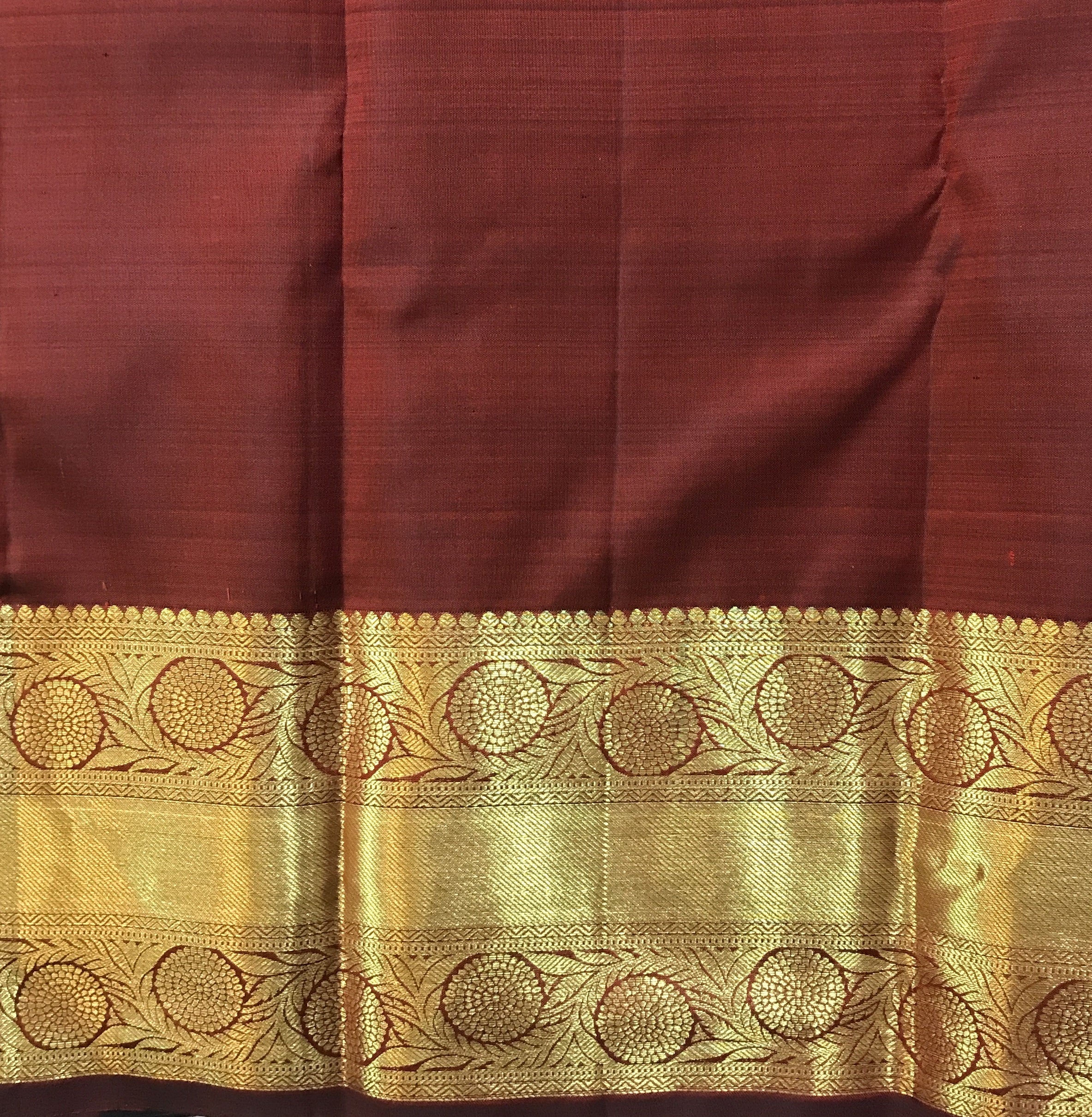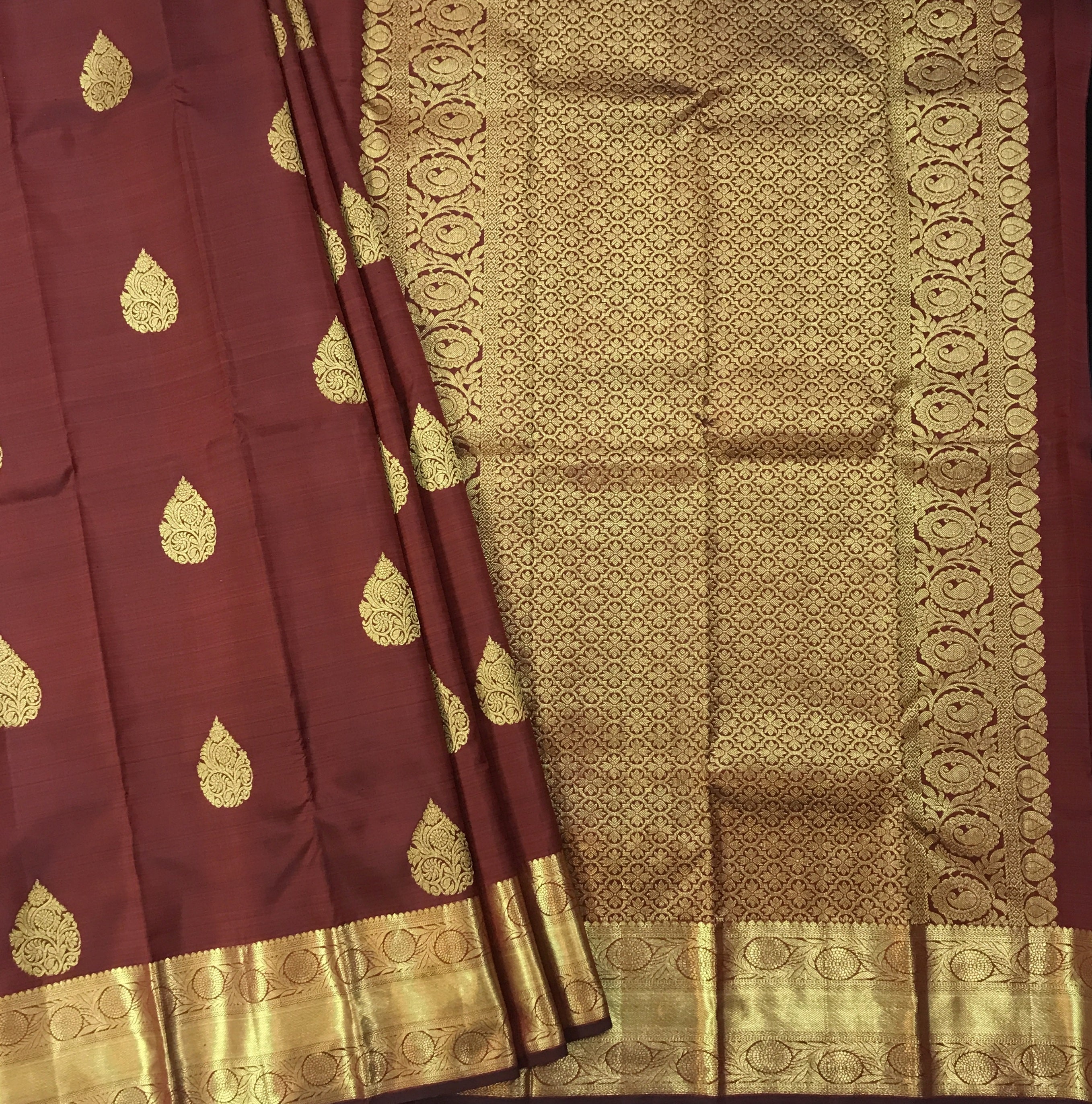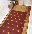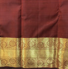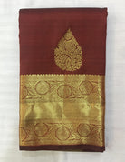 A beautiful shade of maroon and self coloured golden zari border pure silk handwoven Kanjeevaram looks great, this one is lustrous and perfectly traditional. The intricate unique shaped butti woven in golden zari and golden zari border with richly woven zari pallu make this weave a classic! This Kanjeevaram will look great in the day as well as at night!