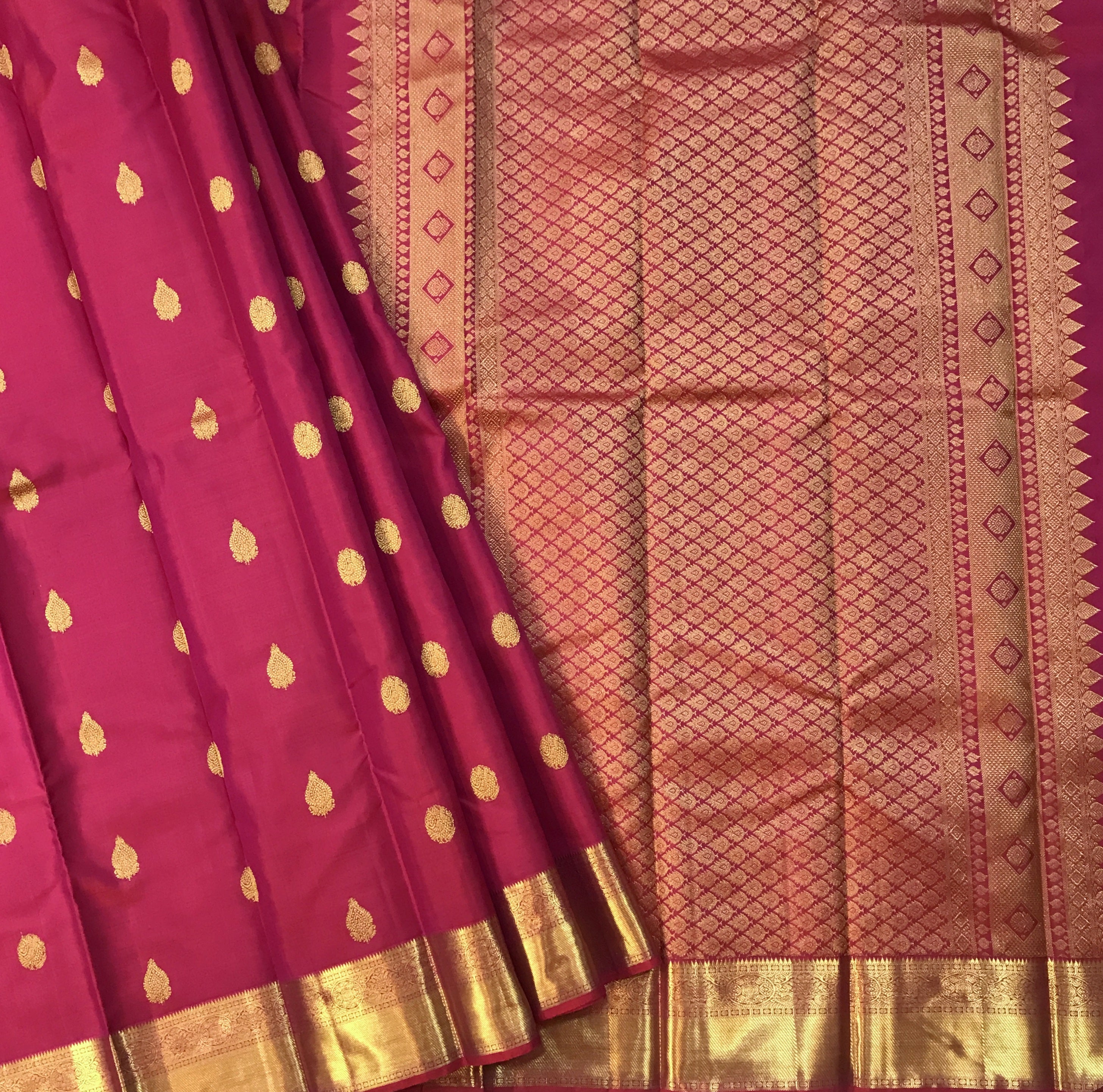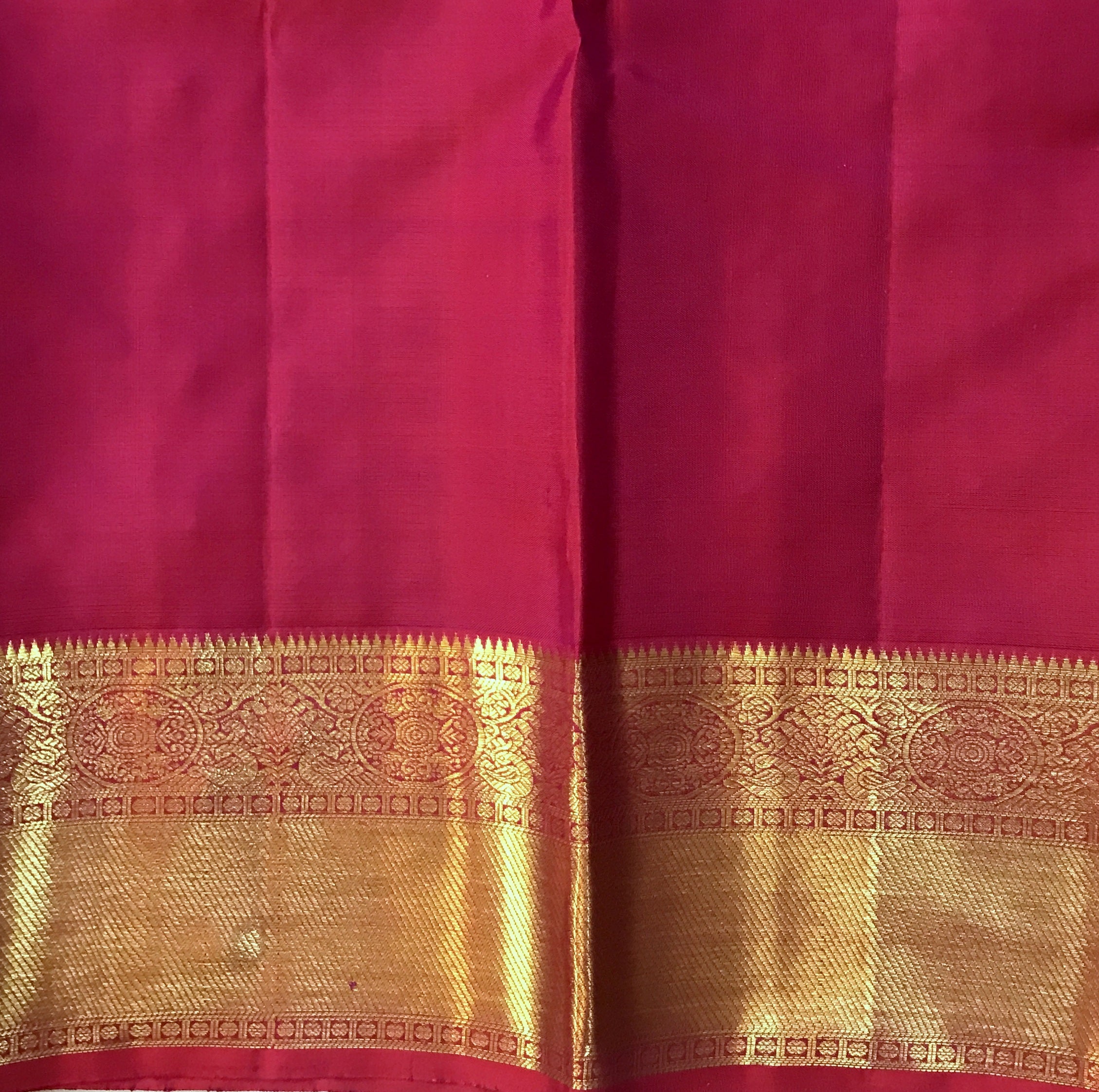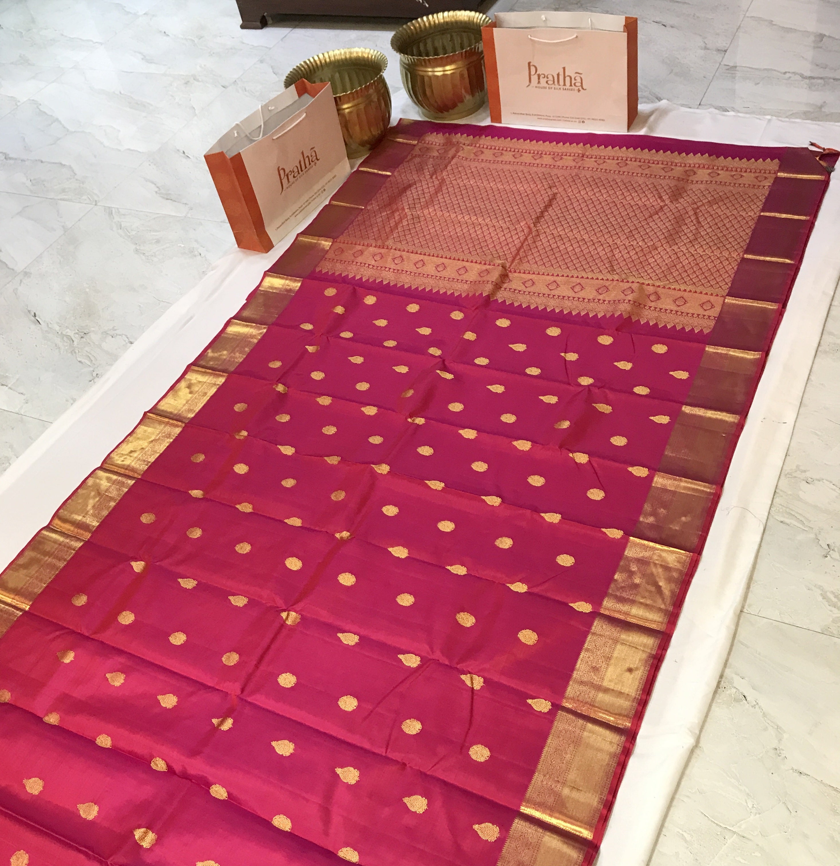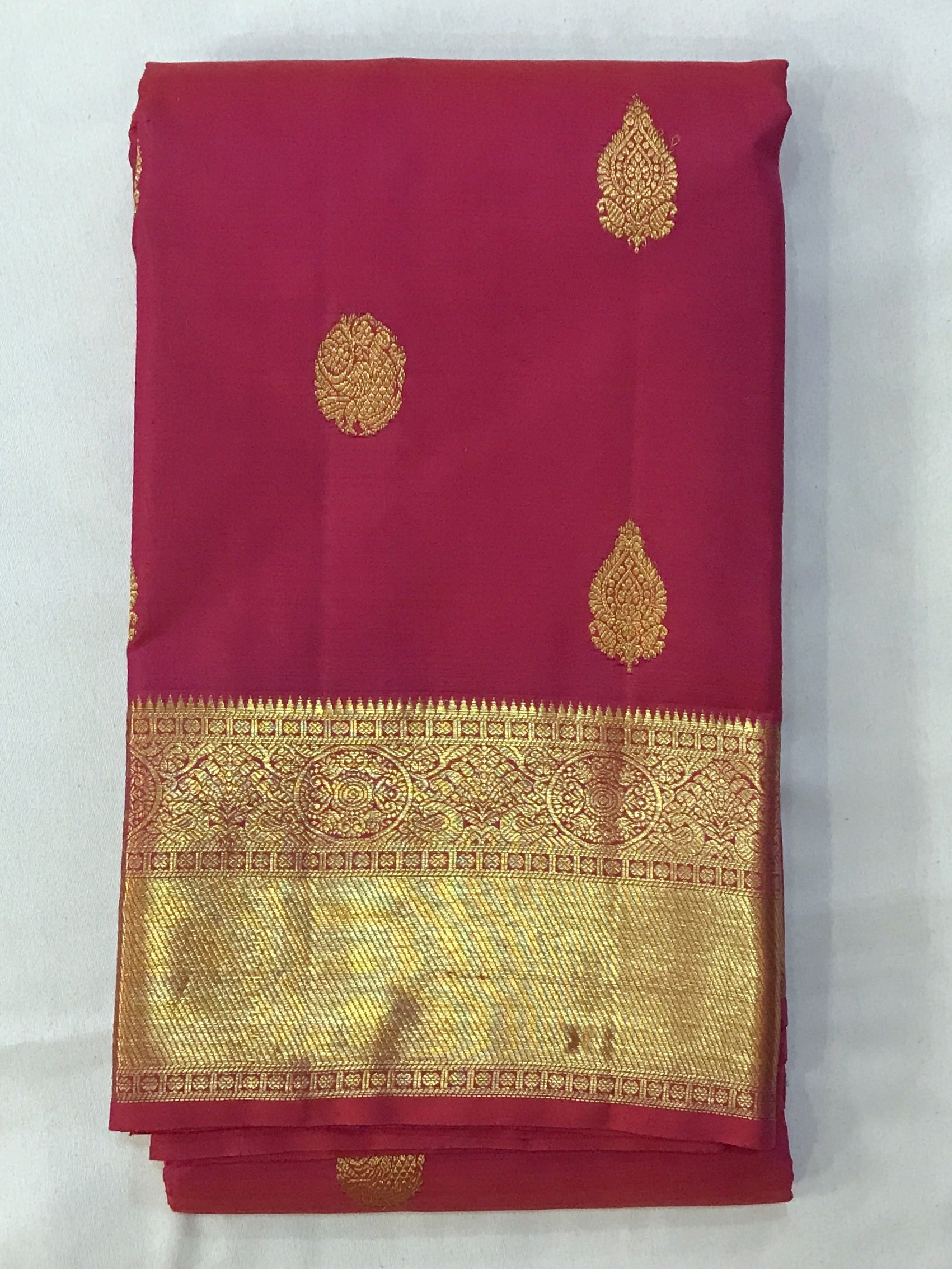 This unique combination of golden-pink pure silk handwoven Kanjeevaram, this one is perfectly traditional. The delicate leaf- and unique round shape butti designs, golden zari border and richly woven Pallu make this weave a classic! Thanks to its beautiful colour with the combination of gold, this Kanjeevaram will look great in the day as well as at night! Do not miss that, this saree has a very beautiful golden zari border looks outstanding when we wear.