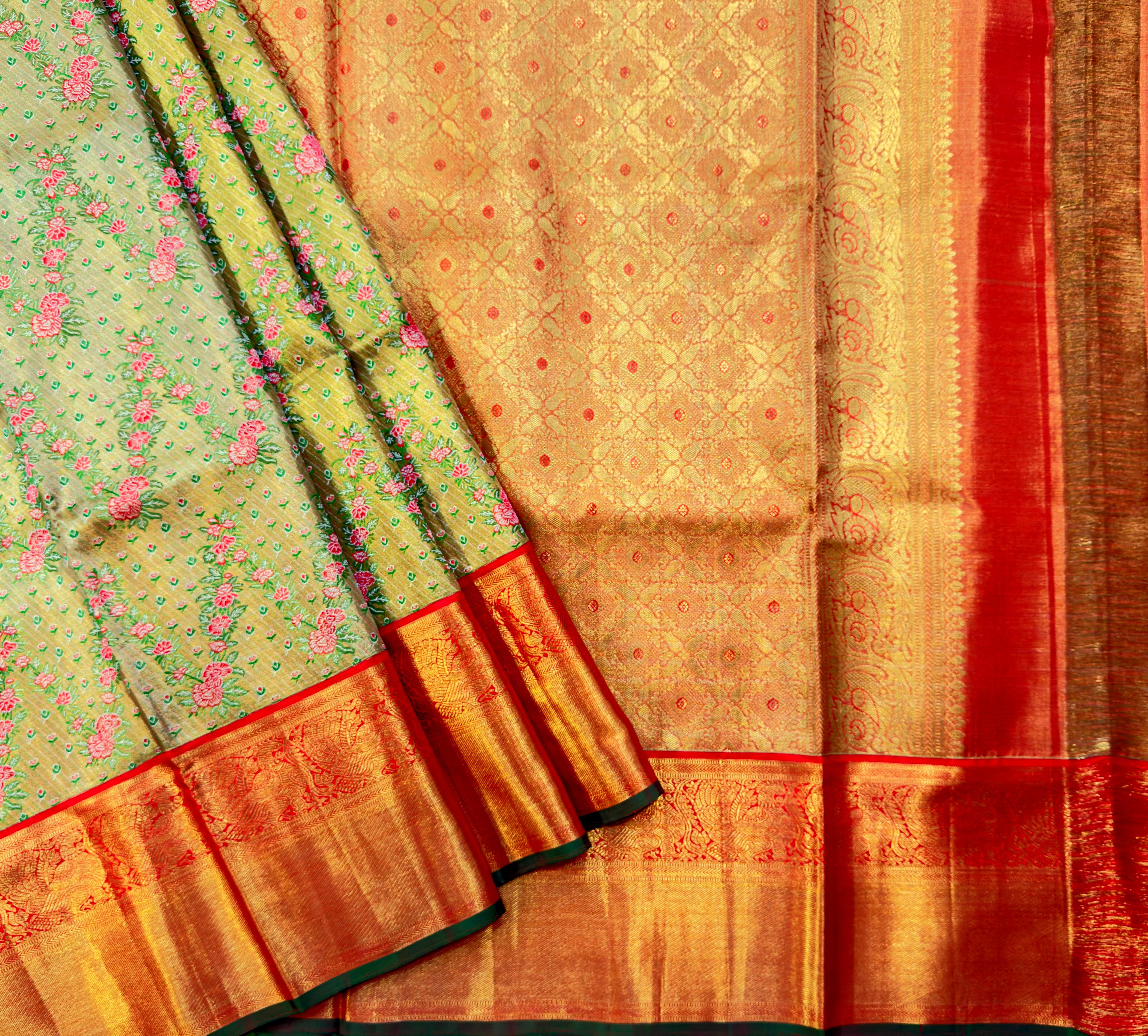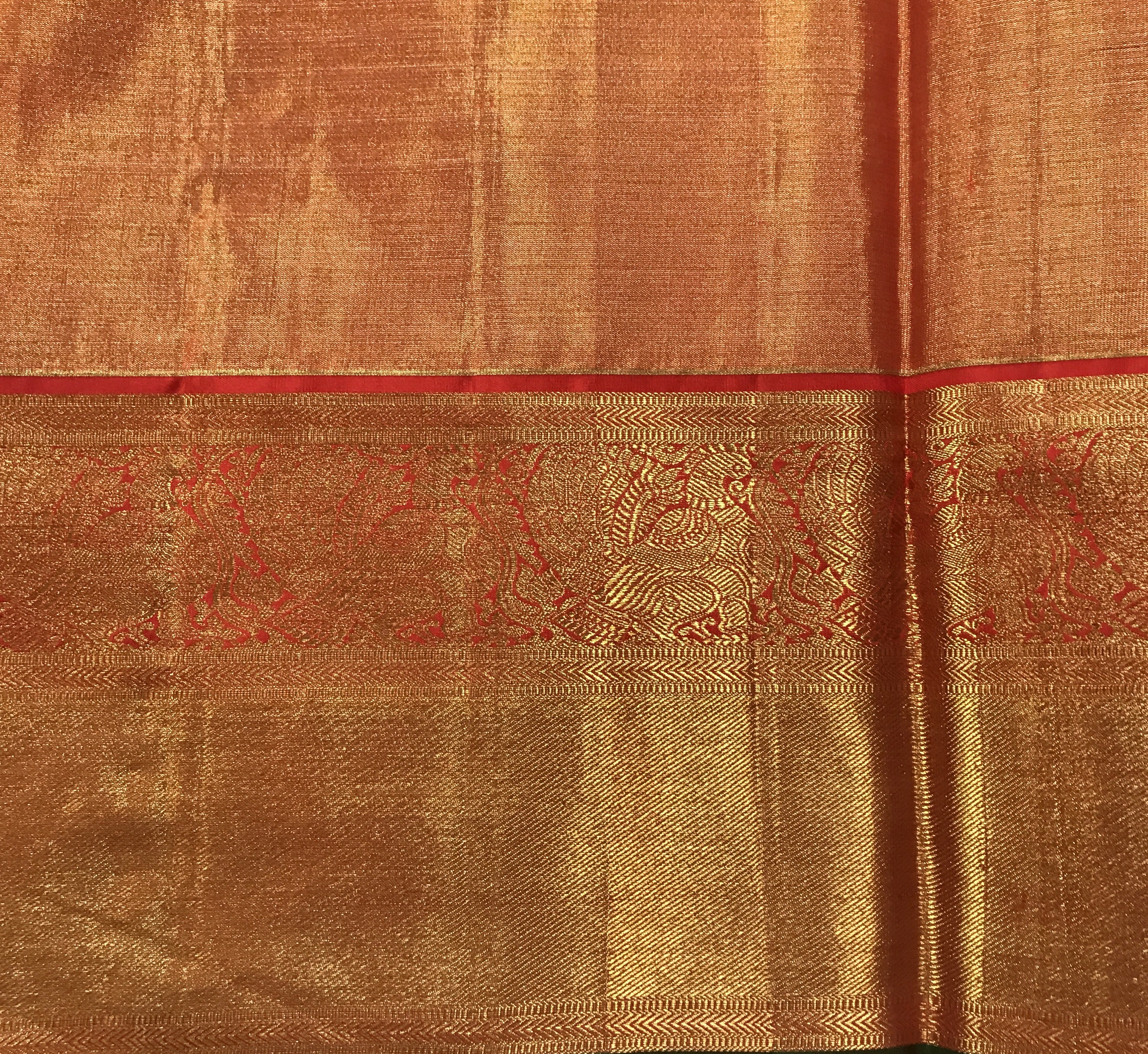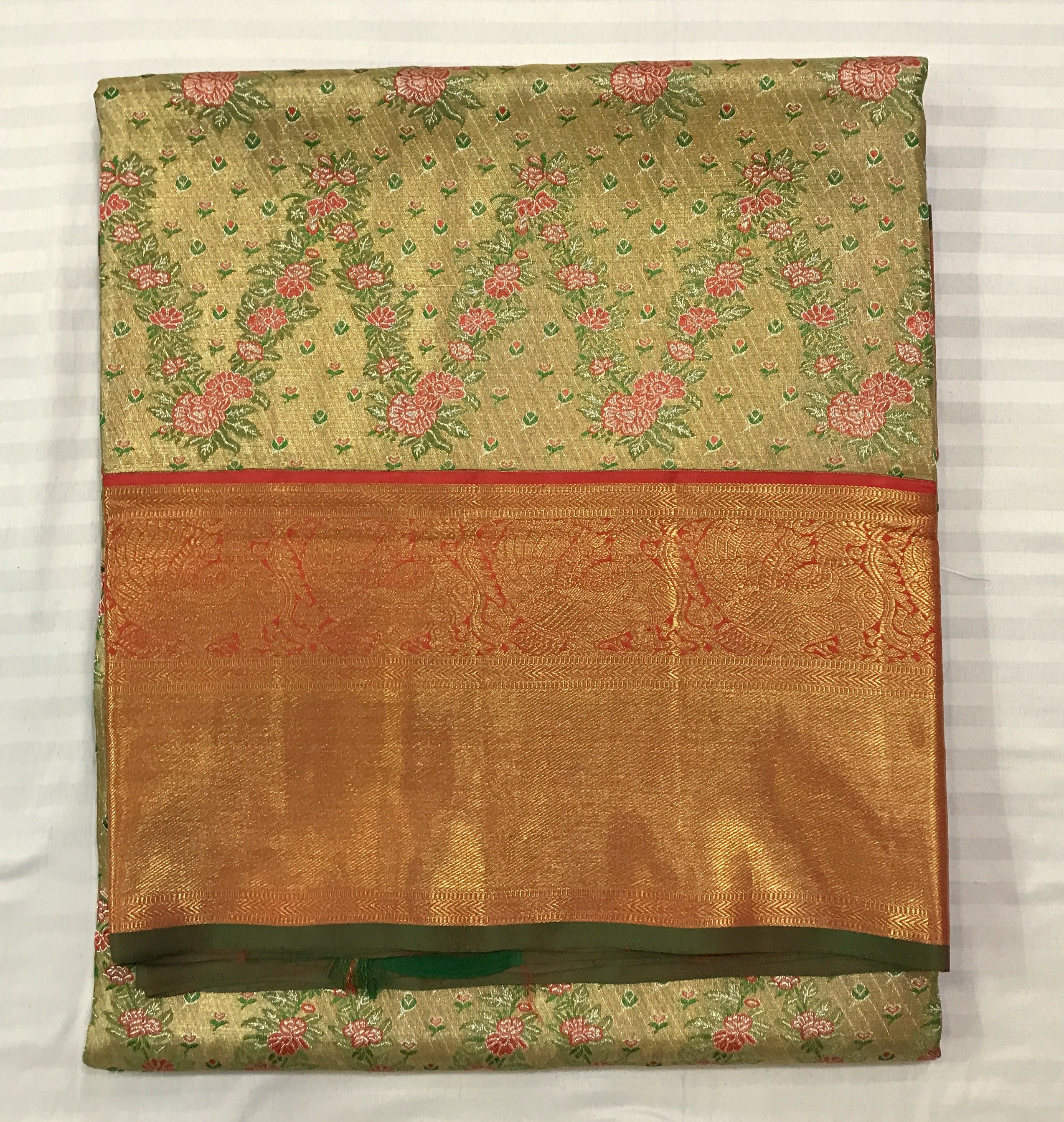 A stunning golden Kanjeevaram is a pure weave! This saree has brocade design woven in gold thread and has floral design all over that is very incredible and attractive. This one is a festive dream! This Brocade Kanjeevaram looks great on bride girl .The intricate golden brocade design with peacock running all over the saree is flawless and magnificent. This saree can be worn at any wedding ceremony which is easy to wear and sits beautifully on your body.