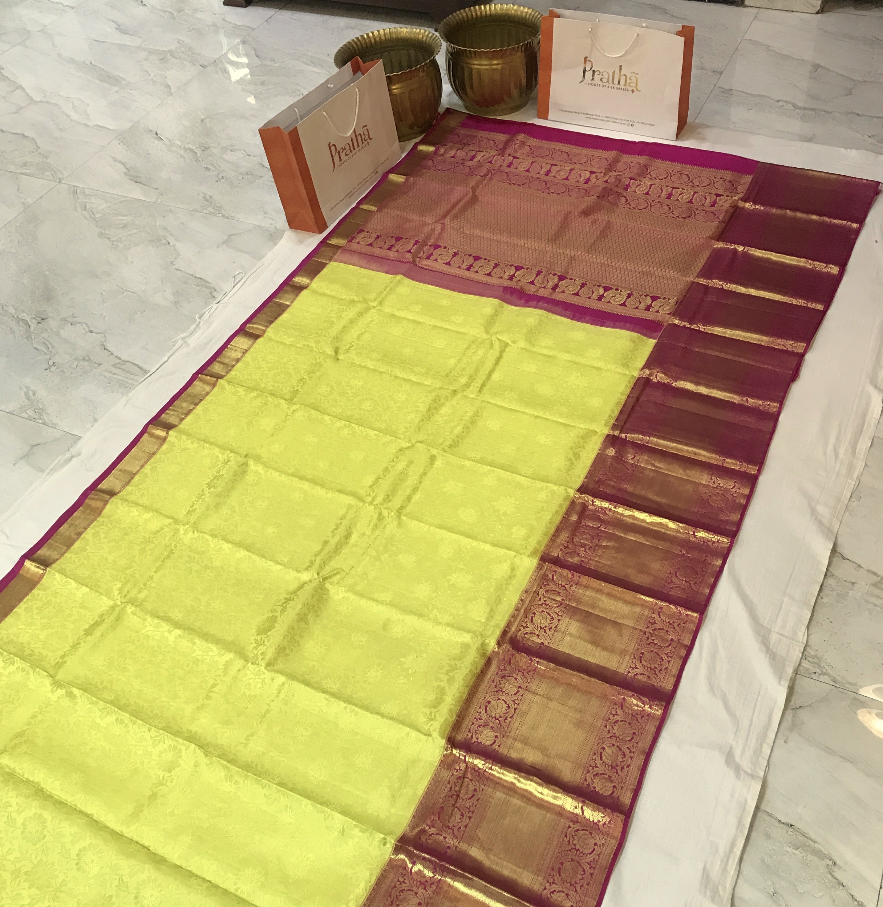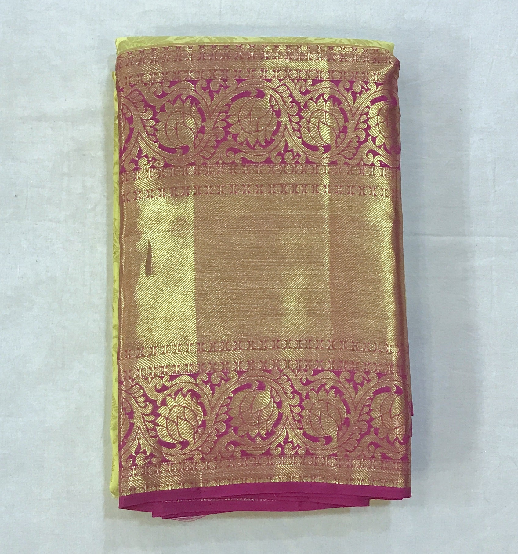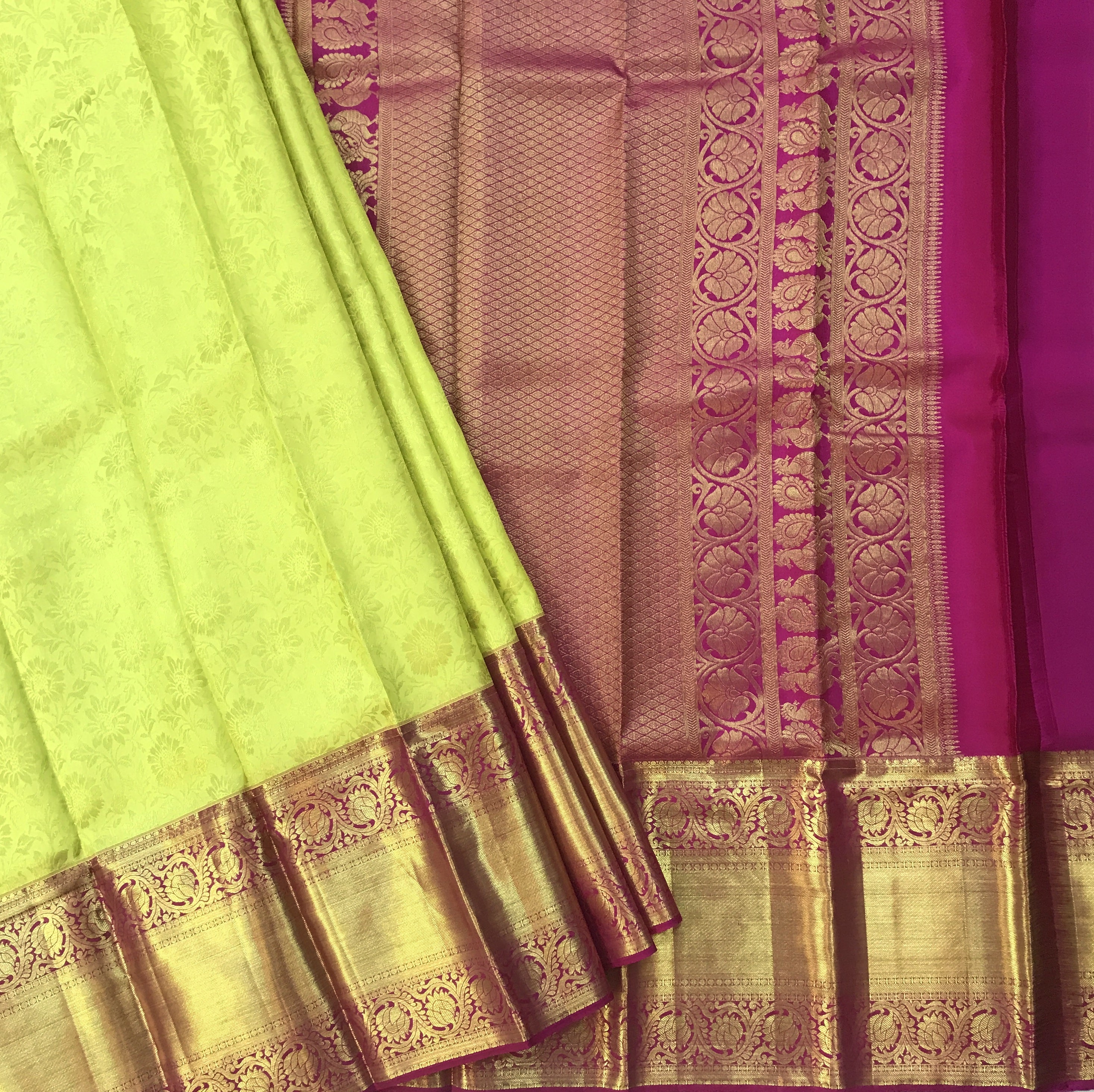 A festive 'avataar' of a traditional handwoven Kanjeevaram. The classic combination of yellowish-green with bright pink border and pallu makes this one perfect to be worn in weddings or on important festive occasions! The brocade zari work all over the saree is flawless and looks grand!
