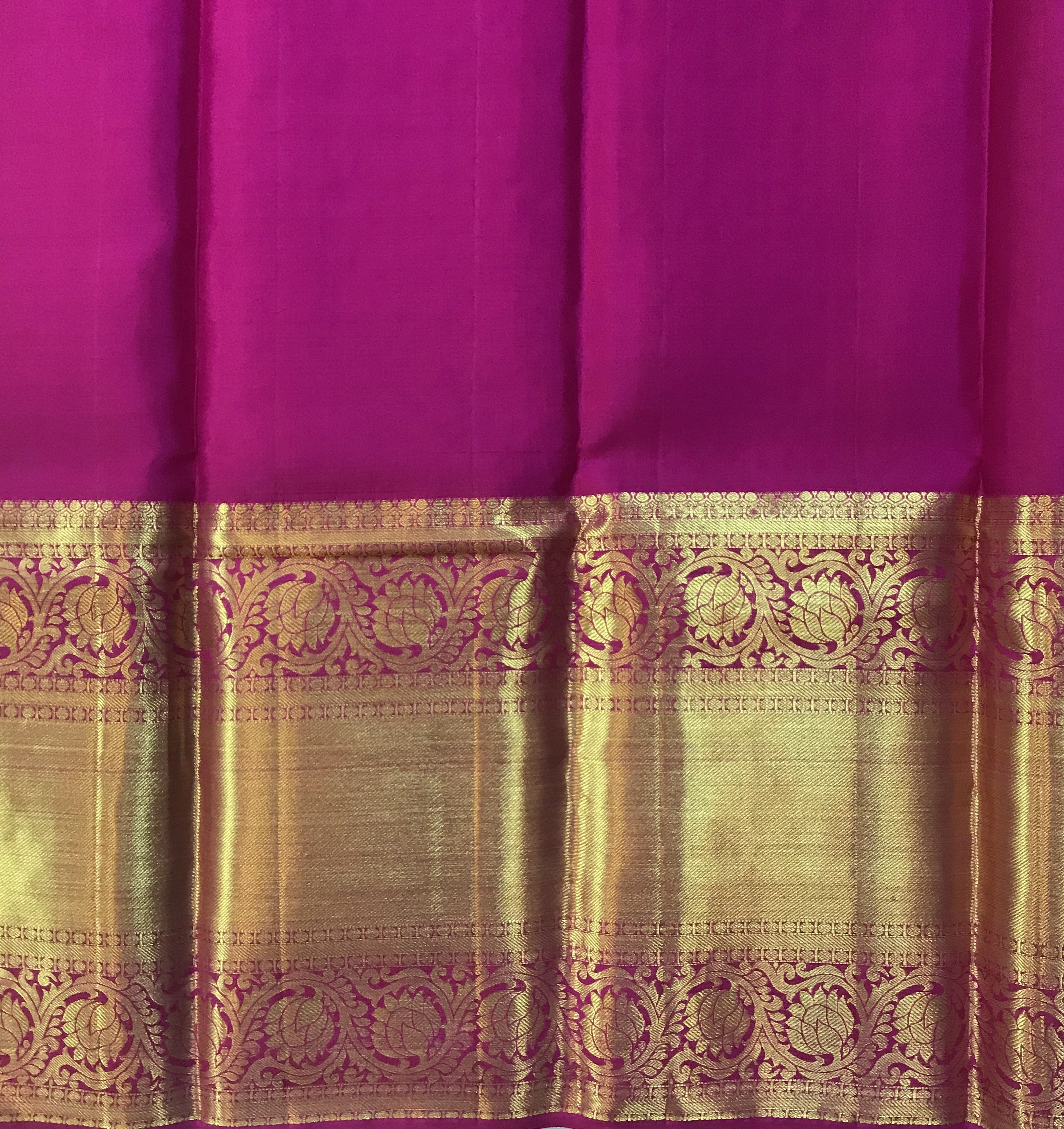 Blouse Colour: Contrast ( Bright pink with broad golden zari border )