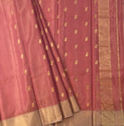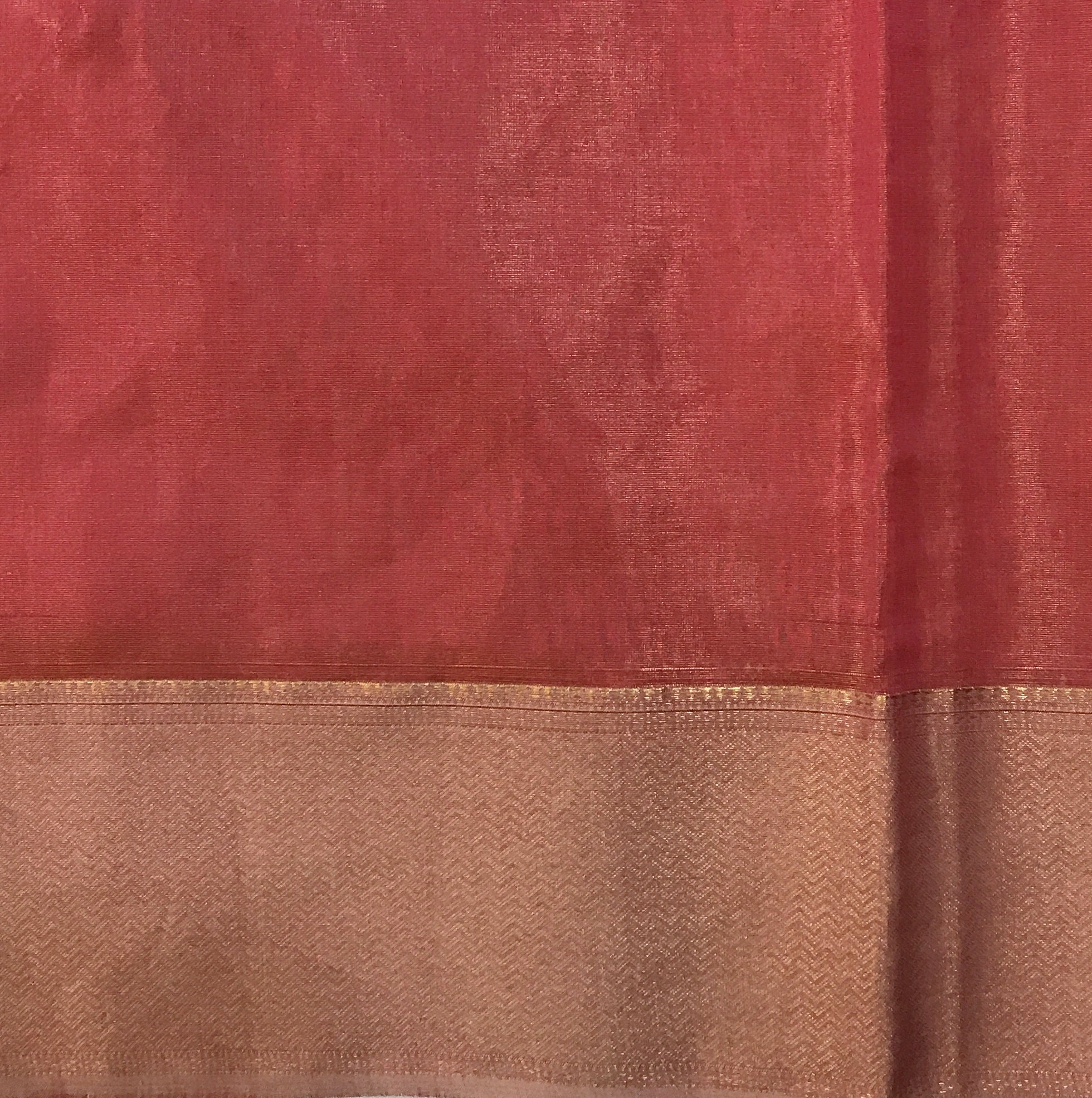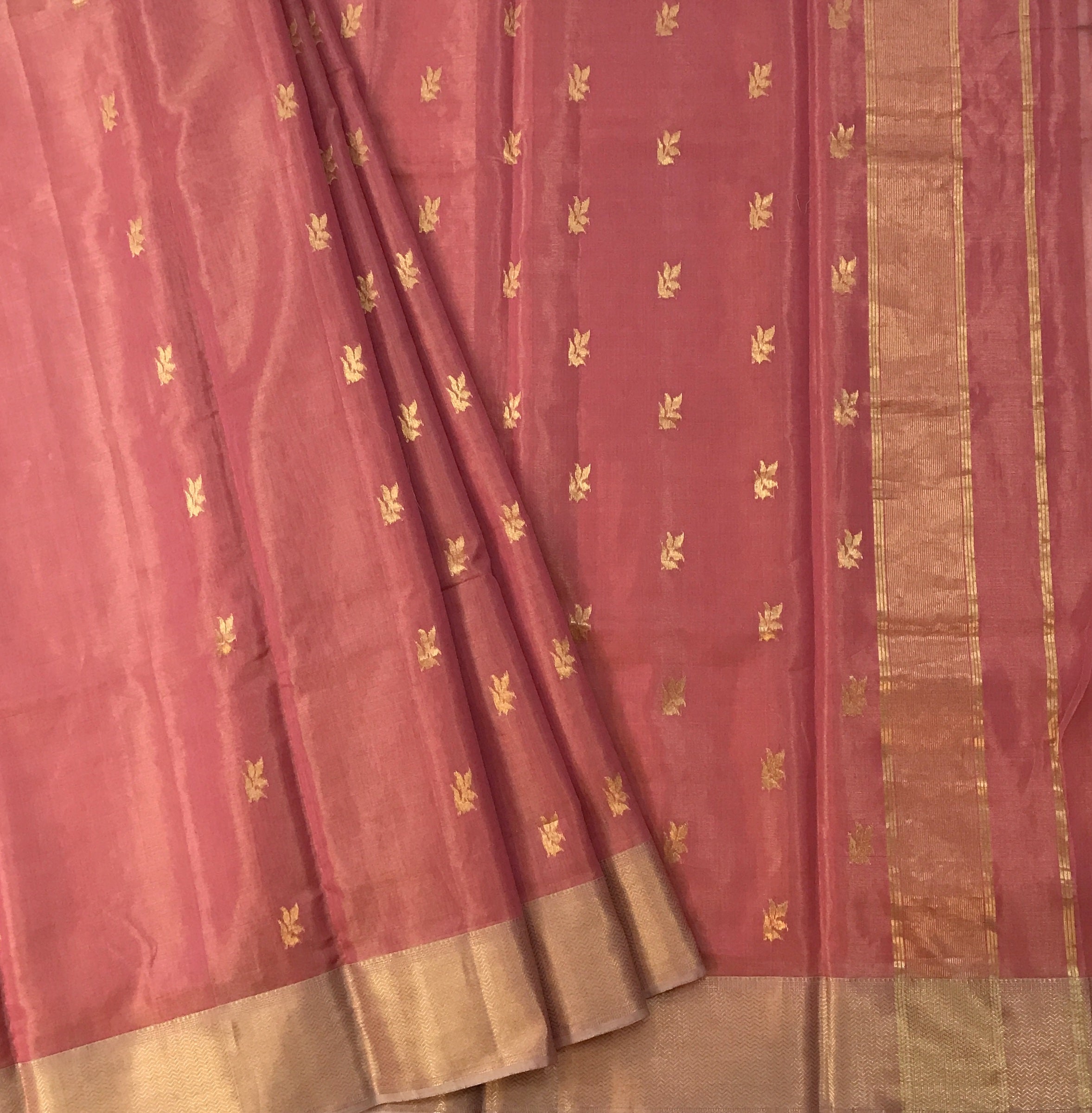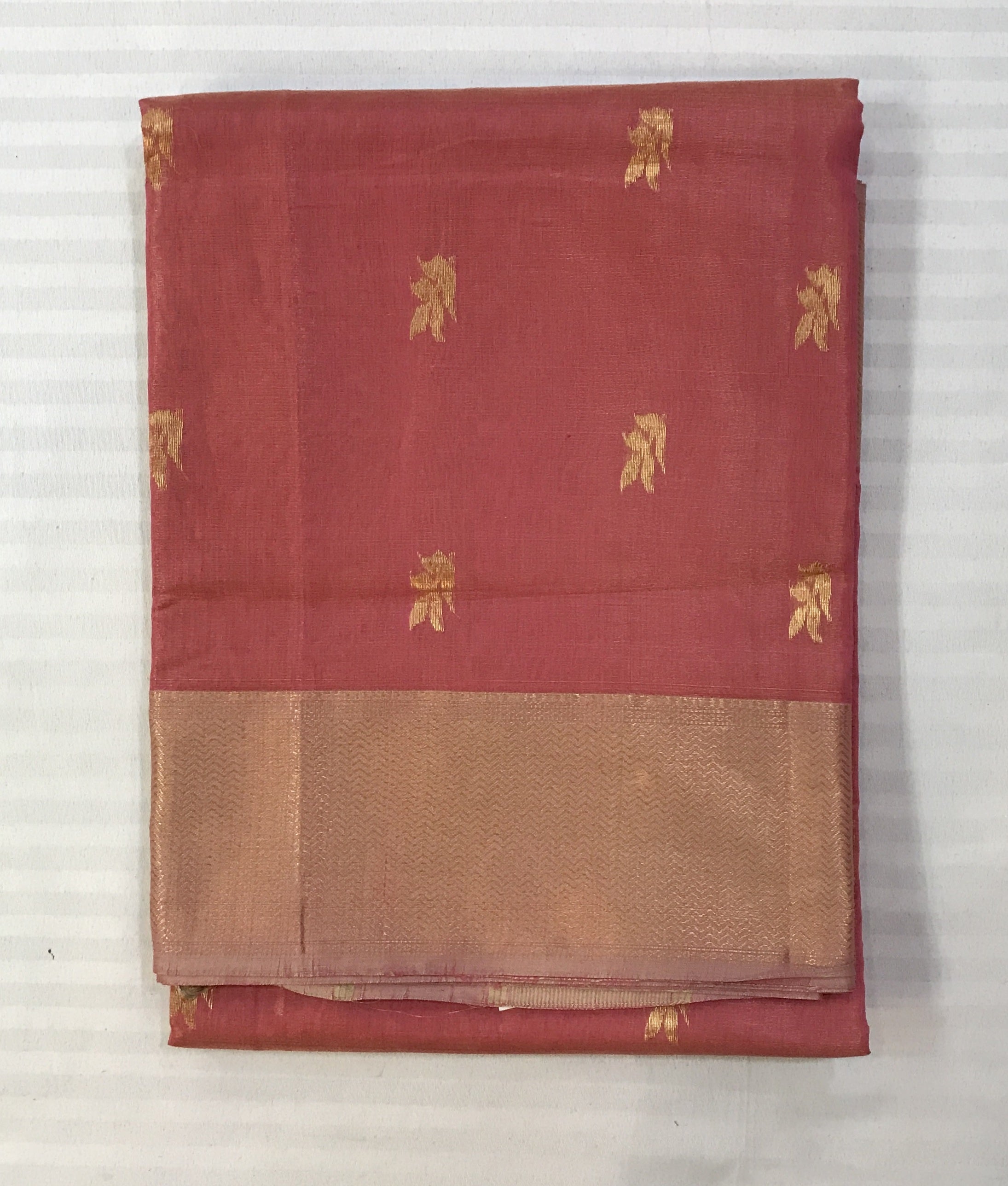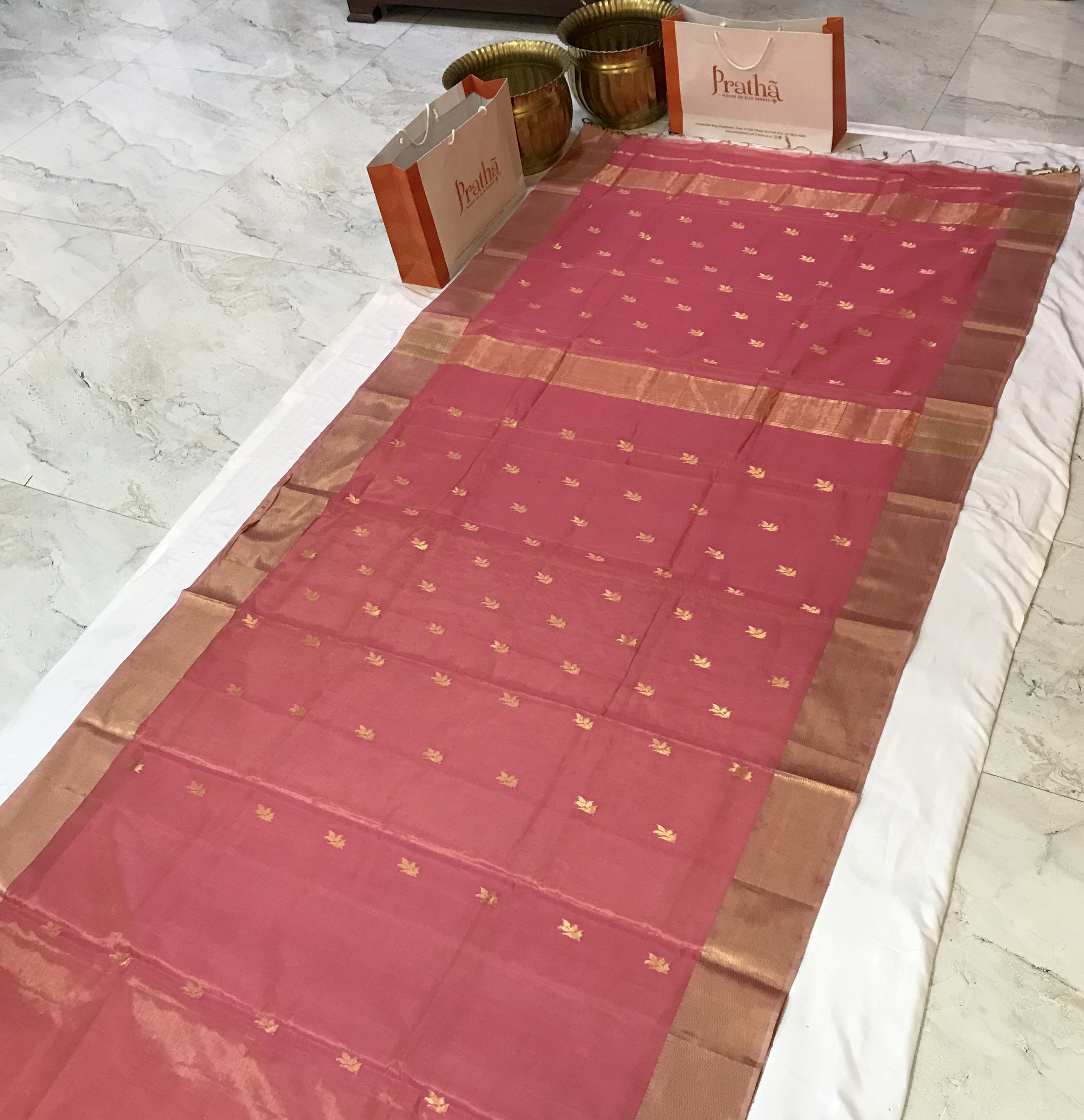 A graceful tissue Maheshwari saree that beautifully blends tradition with understated elegance. Draped in a rich pink hue, this saree is adorned with delicate gold zari floral butti spread evenly across the body, adding a subtle festive shimmer. The signature Maheshwari tissue texture lends a lightweight yet lustrous finish, making it effortless to carry. Accentuated with a refined golden zari border and a neatly woven pallu, this saree reflects classic charm with a contemporary touch. Perfect for festive gatherings, traditional functions, and elegant day occasions, this tissue Maheshwari is a timeless addition to your ethnic collection.