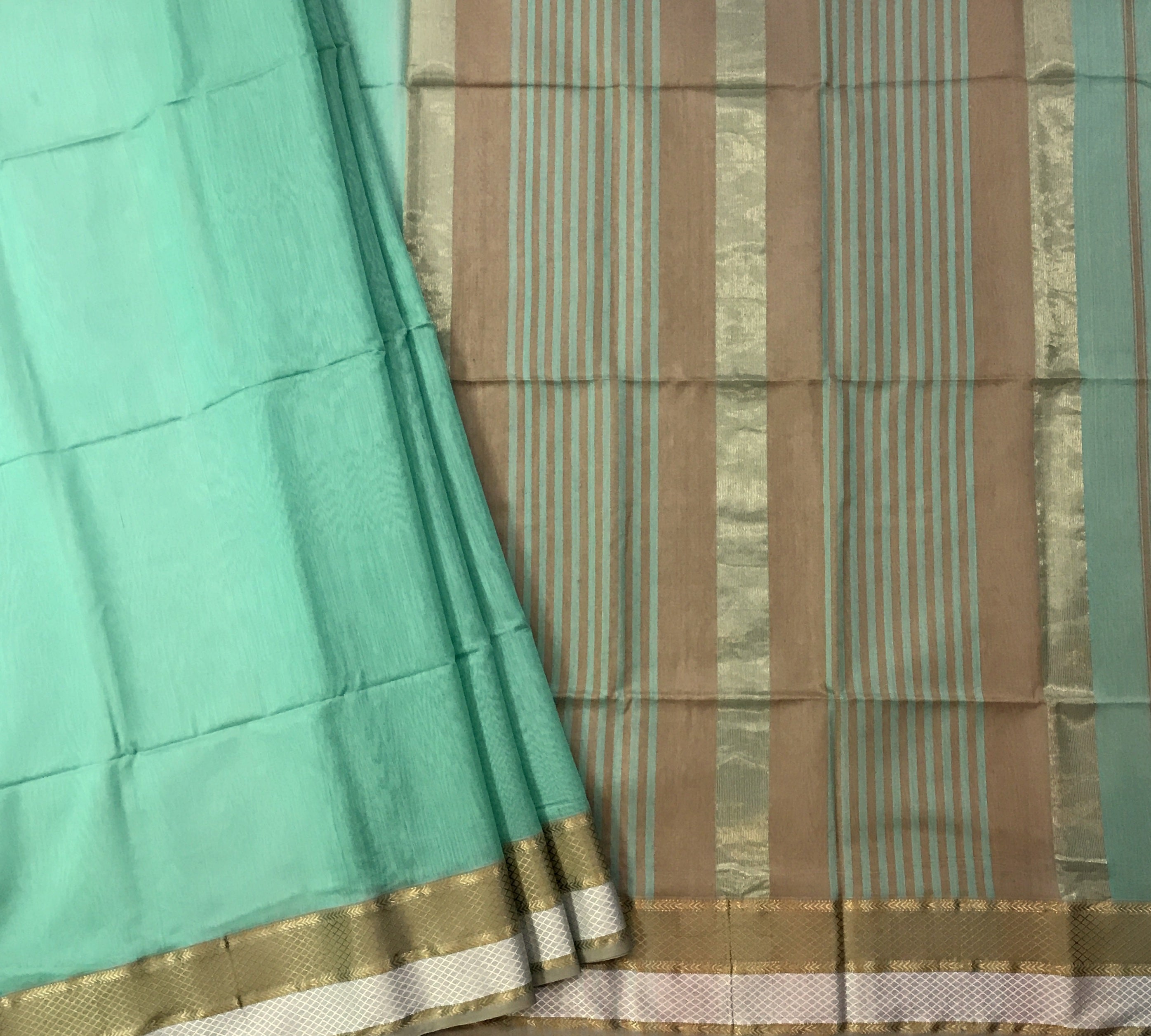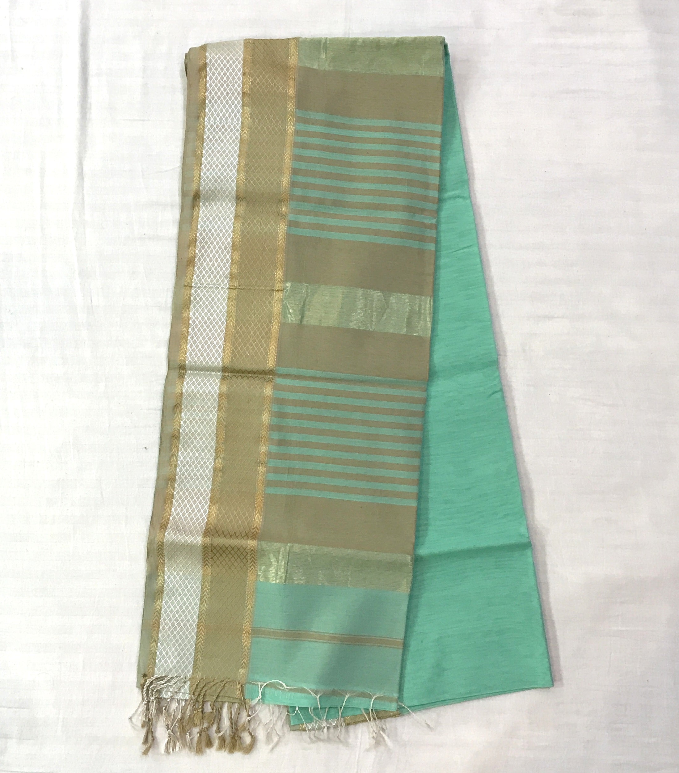 Maheshwari sarees are celebrated for their exceptional craftsmanship and deep-rooted heritage. These sarees are known for their light and airy texture, detailed designs, and vivid colors. Valued for their comfort and grace, Maheshwari sarees are perfect for any occasion, from formal events to festive gatherings. Each saree reflects India's traditional weaving techniques and artistic mastery, making it a timeless piece in any woman's collection. This beautiful plain green coloured saree with golden-silver zari border looks great .