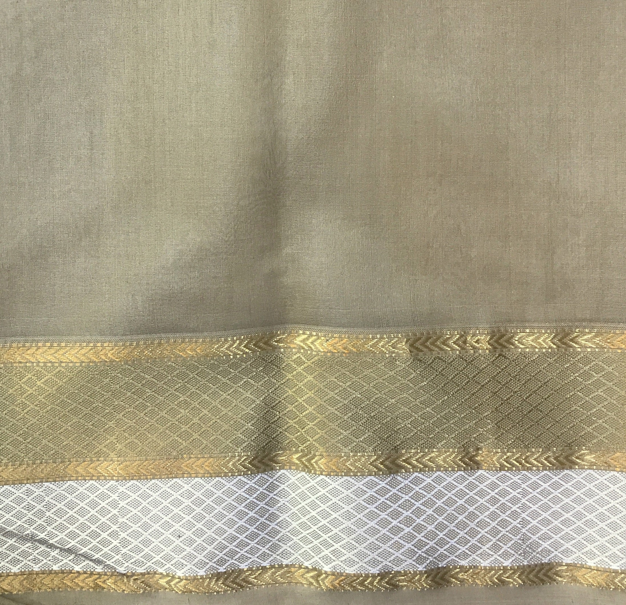 Blouse Colour: Contrast ( Beige color with small golden-silver zari border )