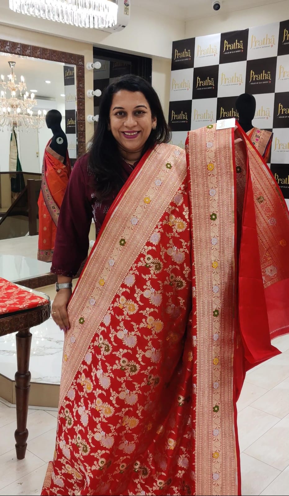 The ethereal and unusual shade of red in the Banarasi style with brocade design, this saree is a stunner! The unique colour makes you stand out! The bold but rich and intricate design of the motifs in brocade with meenakari is extremely beautiful. The zari colour- not too golden , not silver - makes this saree a true Banarasi !