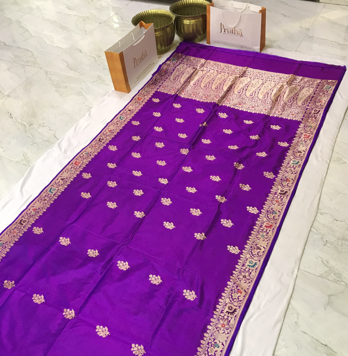 This enchanting Banarasi saree in a delicate shade of purple radiates timeless elegance. The self-colored zari border enhances its traditional charm, while the intricate leaf-inspired butti motifs in zari add a layer of refined artistry. The highlight of this saree is the exquisite multicolored meenakari work on the border and pallu, showcasing intricate floral designs that create a stunning visual harmony. Paired with a matching blouse featuring meenakari border, this saree is a perfect blend of tradition and sophistication, making it a distinctive choice for any occasion.