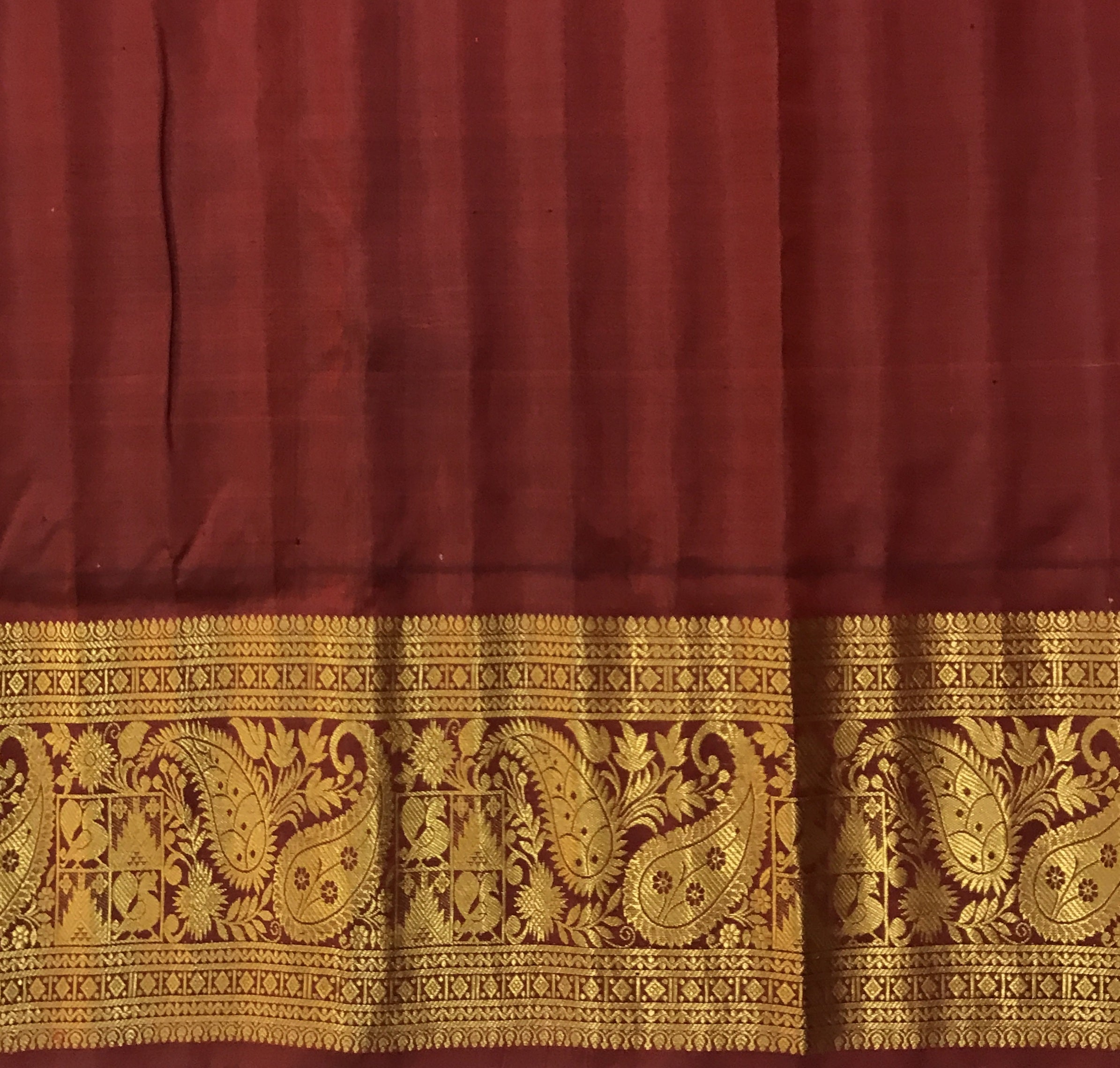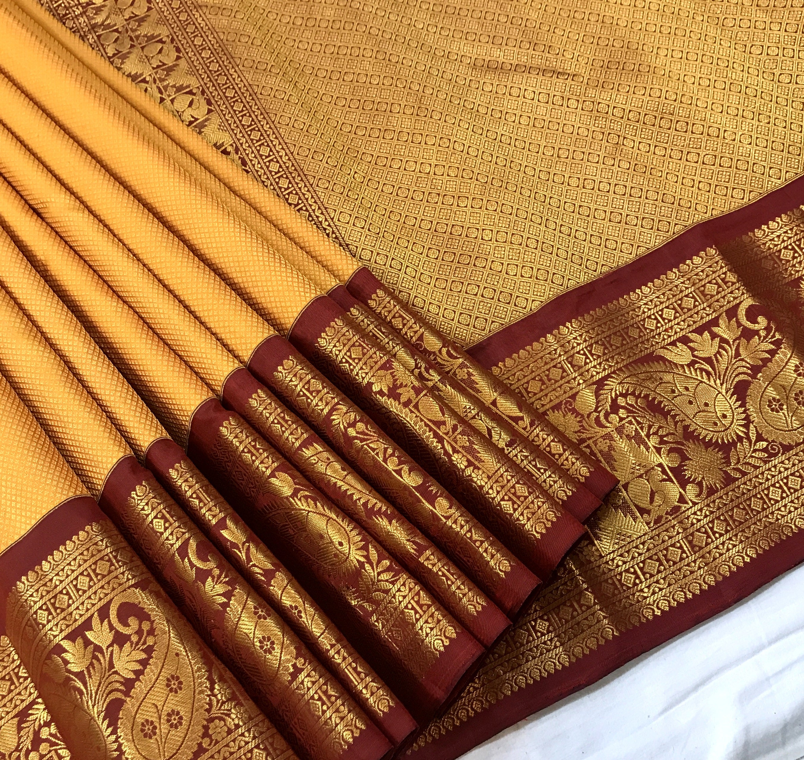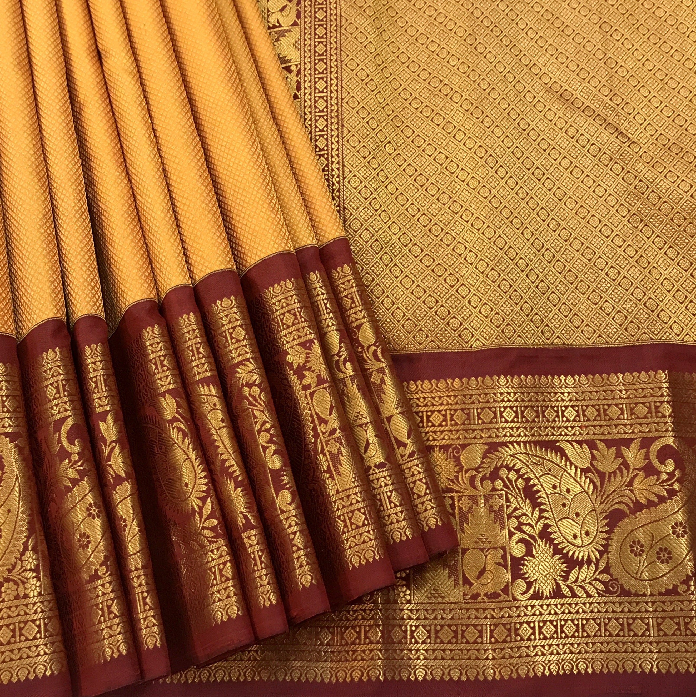 This saree is truly a vision of grace and grandeur! The rich mustard gold shade beautifully paired with a deep maroon Gadhwal border makes this piece perfect for festive and traditional occasions. The body features fine woven detailing that adds a subtle sheen, while the intricately crafted golden zari border, adorned with floral and paisley motifs reflects the timeless elegance of classic Gadhwal craftsmanship.The pallu is richly woven with exquisite golden zari brocade, showcasing elaborate floral designs that enhance the saree’s regal appeal. Every element of this weave highlights the artisan’s finesse, making it a perfect blend of tradition and sophistication.