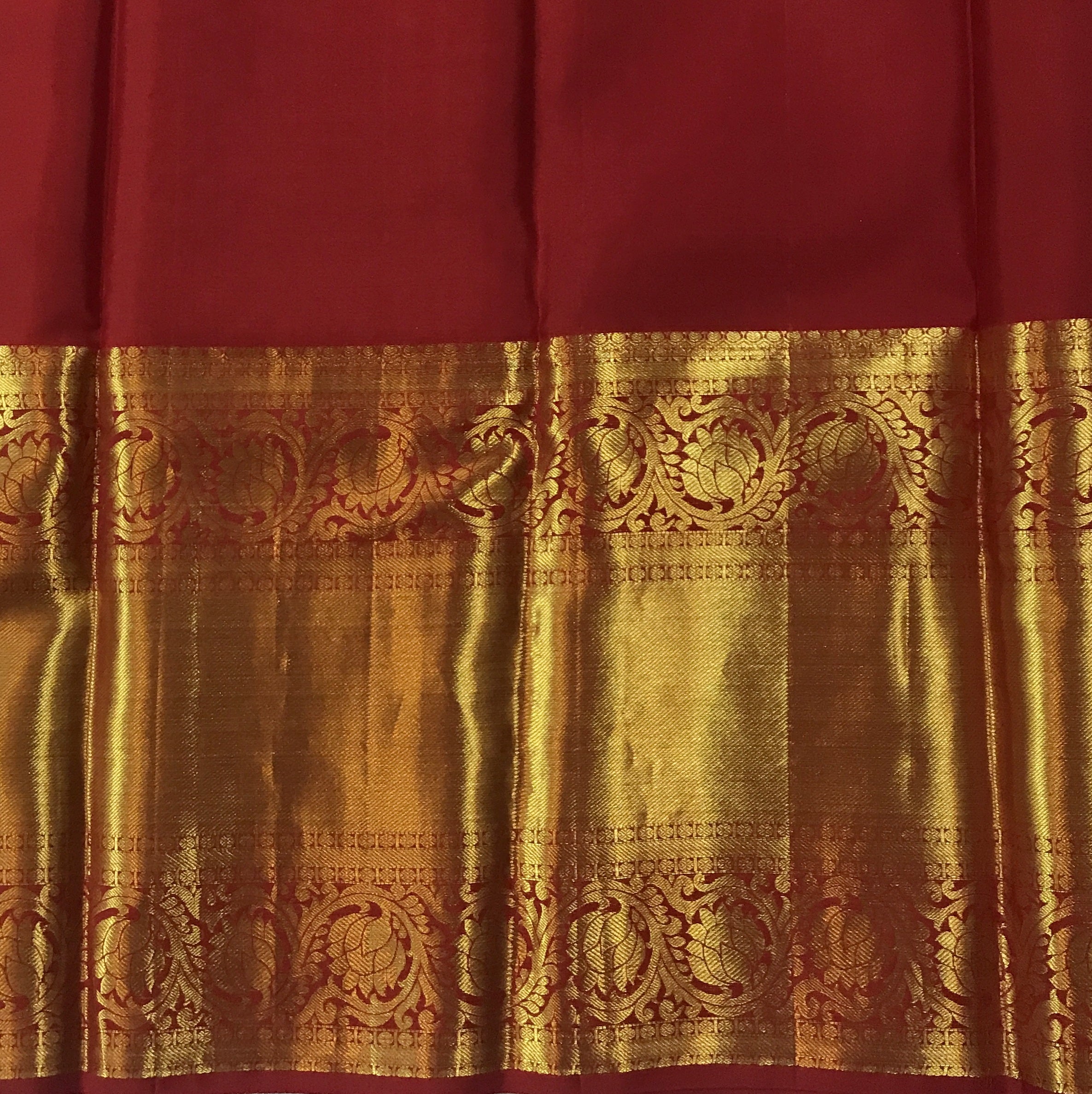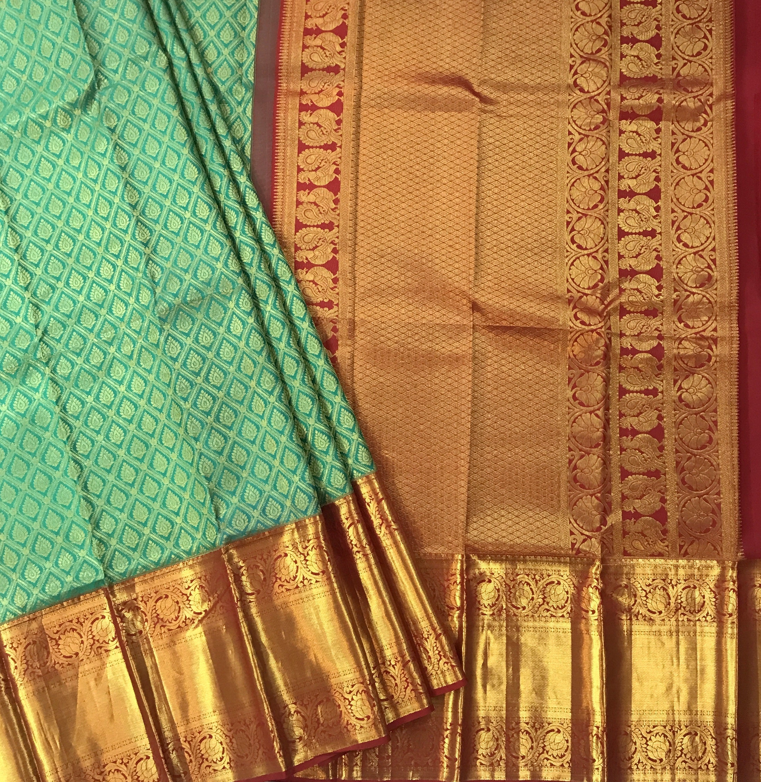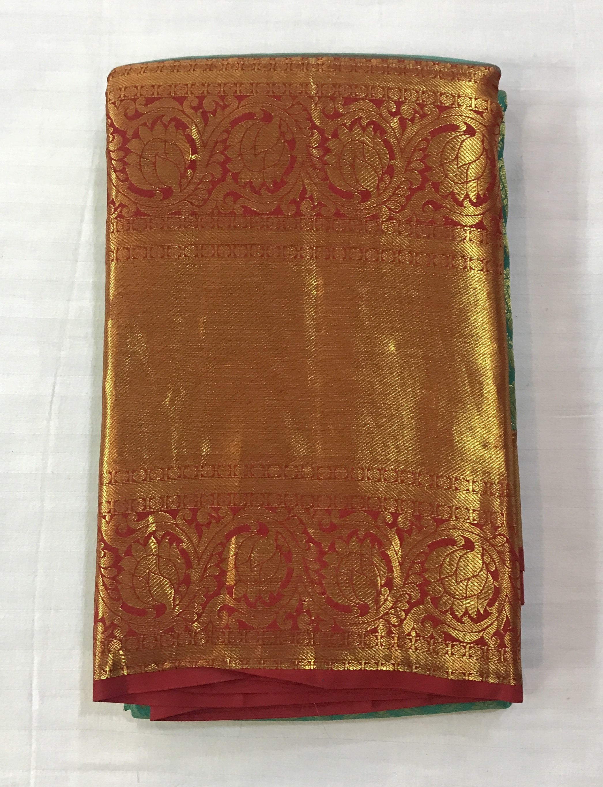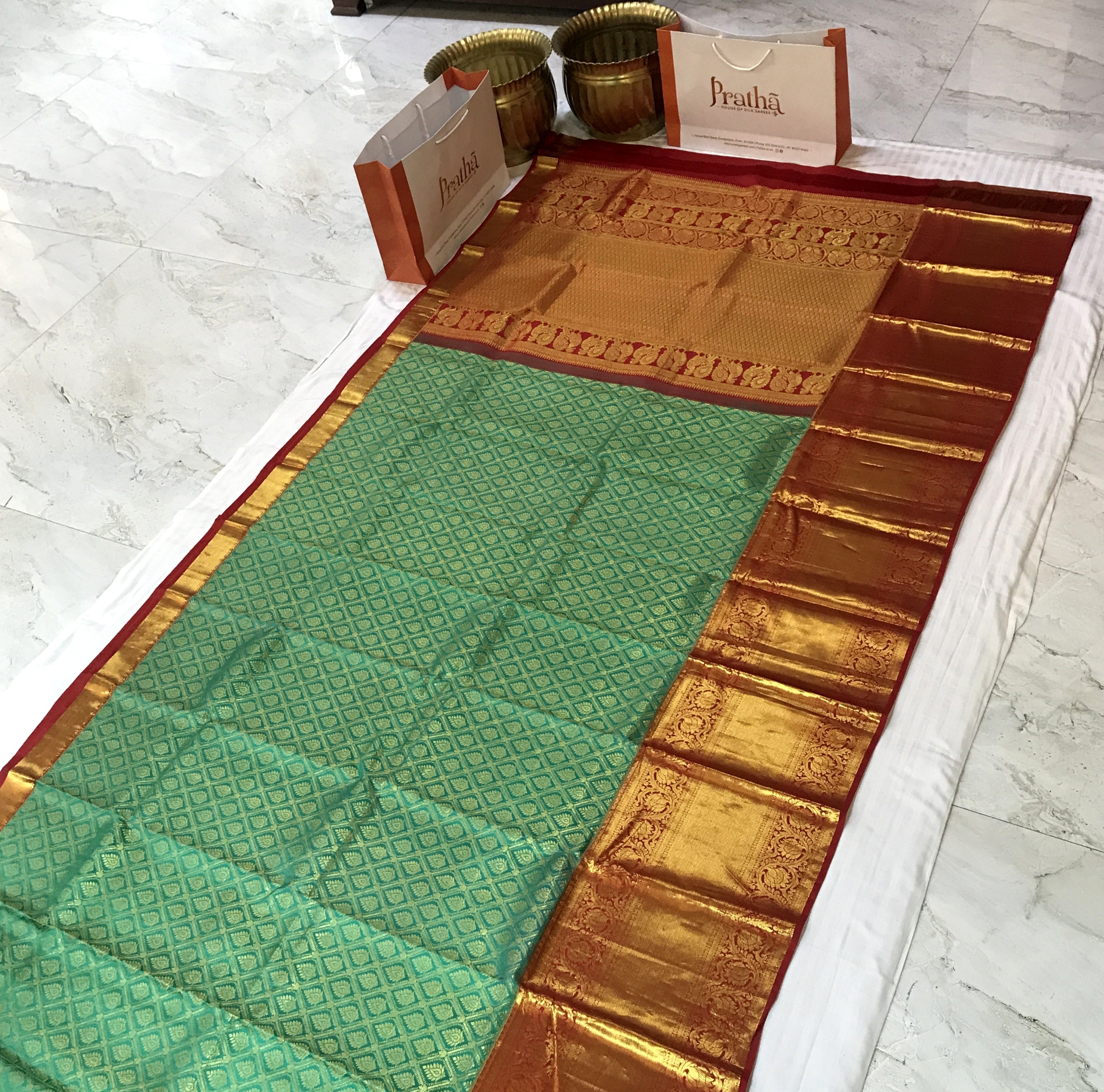 A festive 'avataar' of a traditional handwoven Kanjeevaram. The classic combination of green with bright red border and pallu makes this one perfect to be worn in weddings or on important festive occasions! The brocade zari work all over the saree is flawless and looks grand!