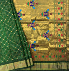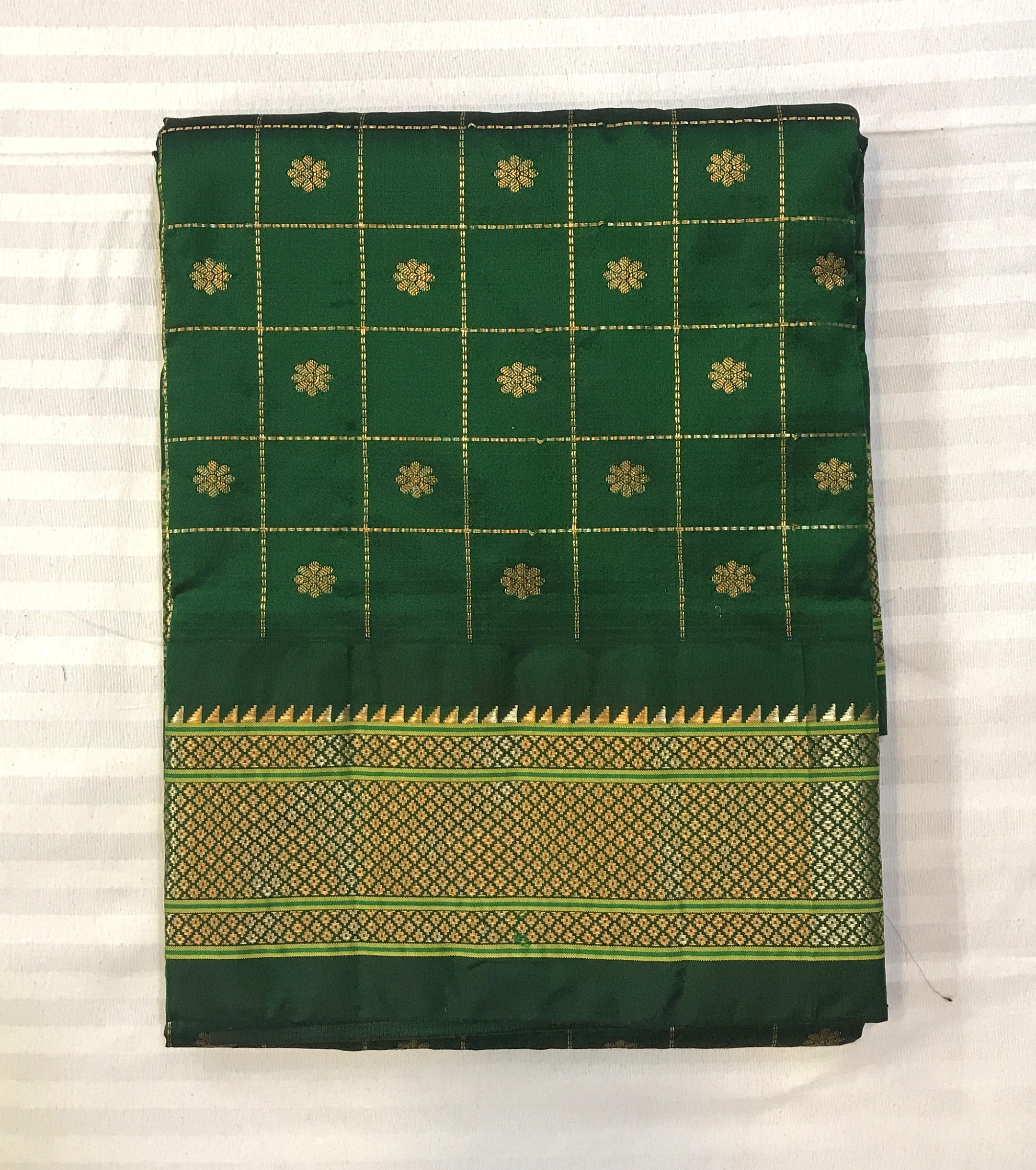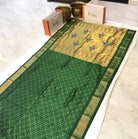 Elegant green checks Kanjeevaram saree with a sophisticated self border. This timeless piece features a classic checkered pattern in rich green tones, complemented by a matching border that creates a seamless, refined look. Perfect for traditional occasions and celebrations, this saree combines the luxurious drape of Kanjeevaram silk with understated elegance. Ideal for those who appreciate classic weaves and subtle sophistication.