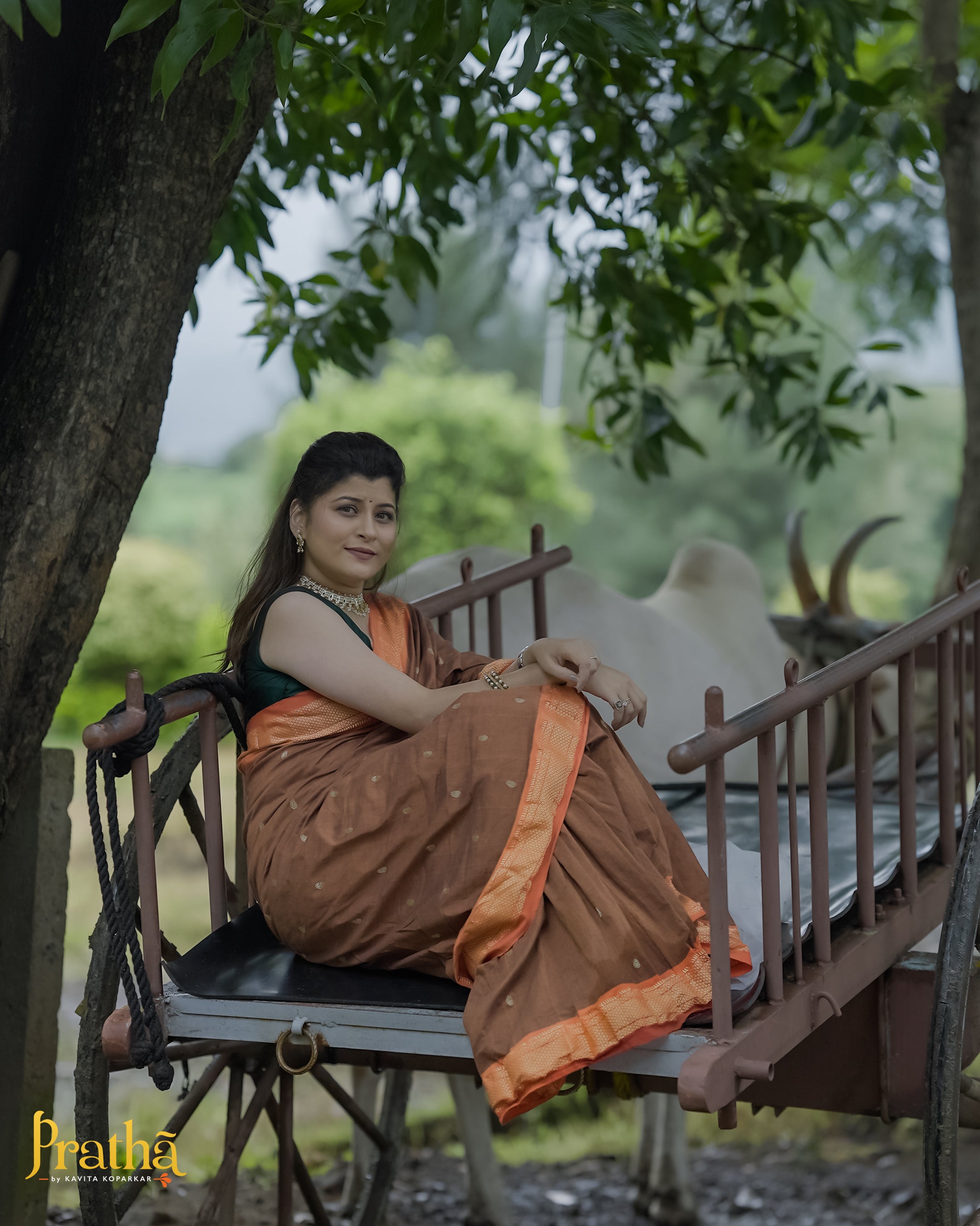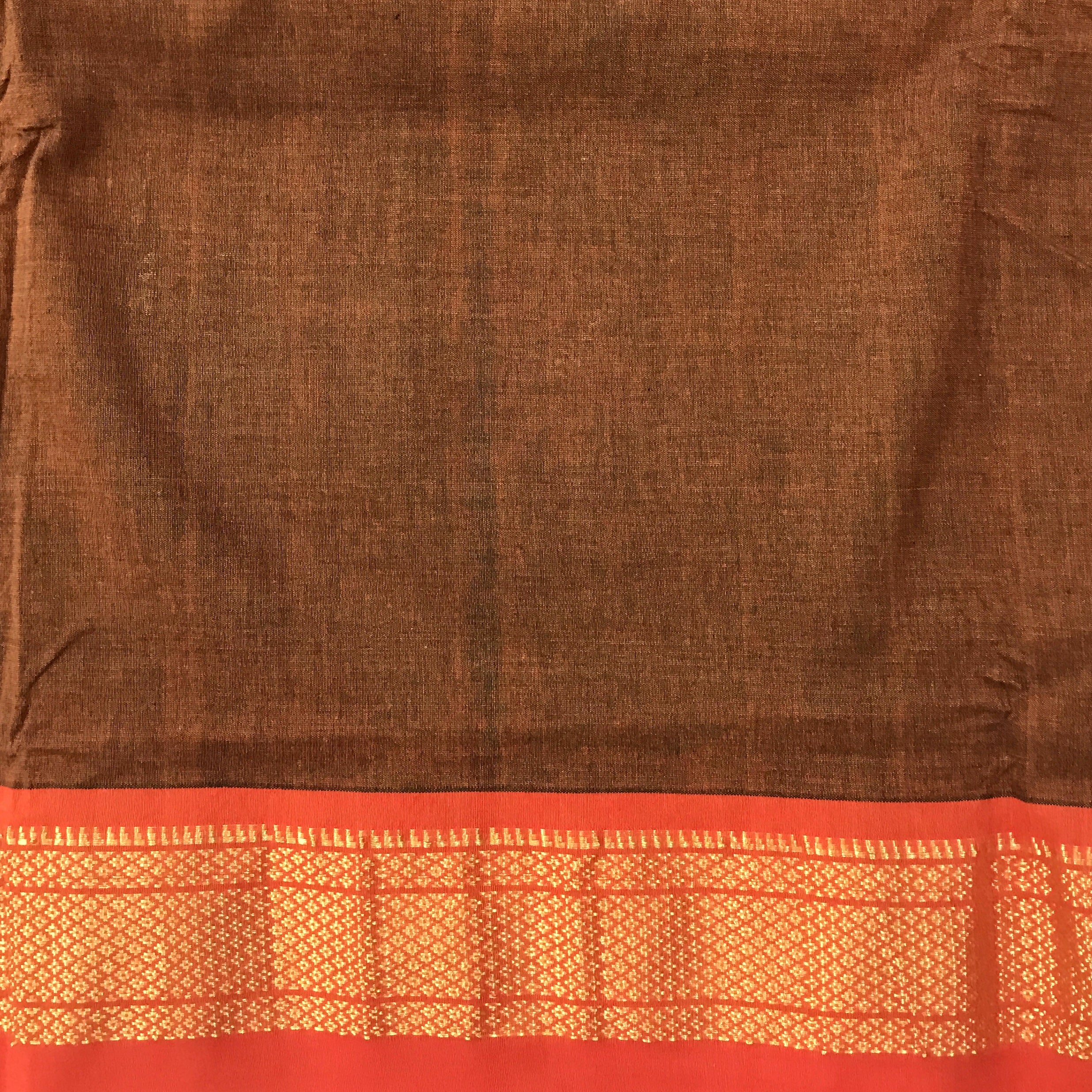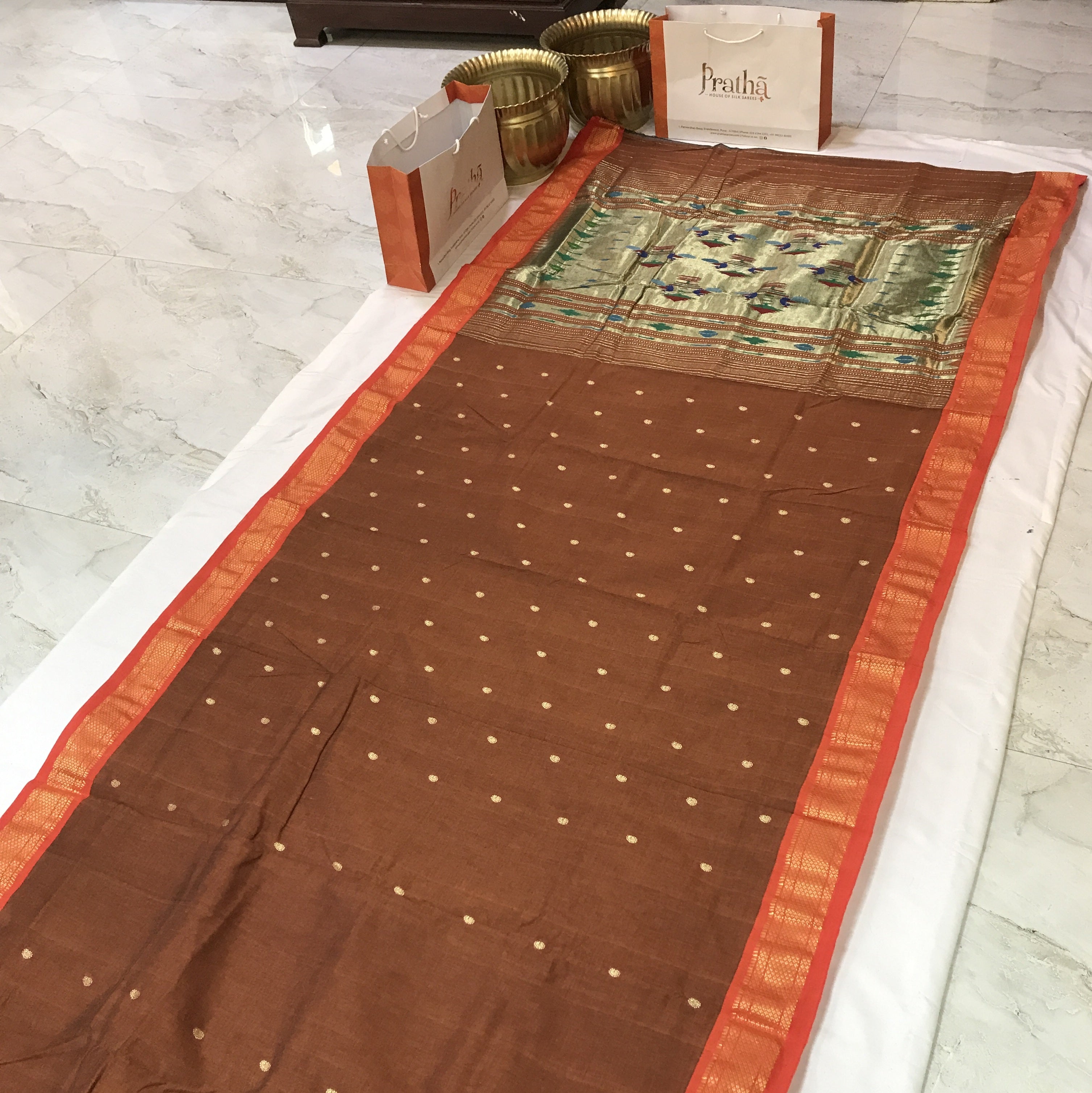 Those who love 'Cotton fabric' will surely love this Cotton Paithani ! This handwoven cotton weave with traditional tissue pallu is incredible. This is an unusual fresh Brown with contrast traditional border with delicate koyari butti that looks awesome , this definitely going to win your heart. Light in weight and easy to drape, this Cotton Paithani is casual yet elegant, simple yet graceful!