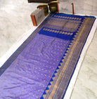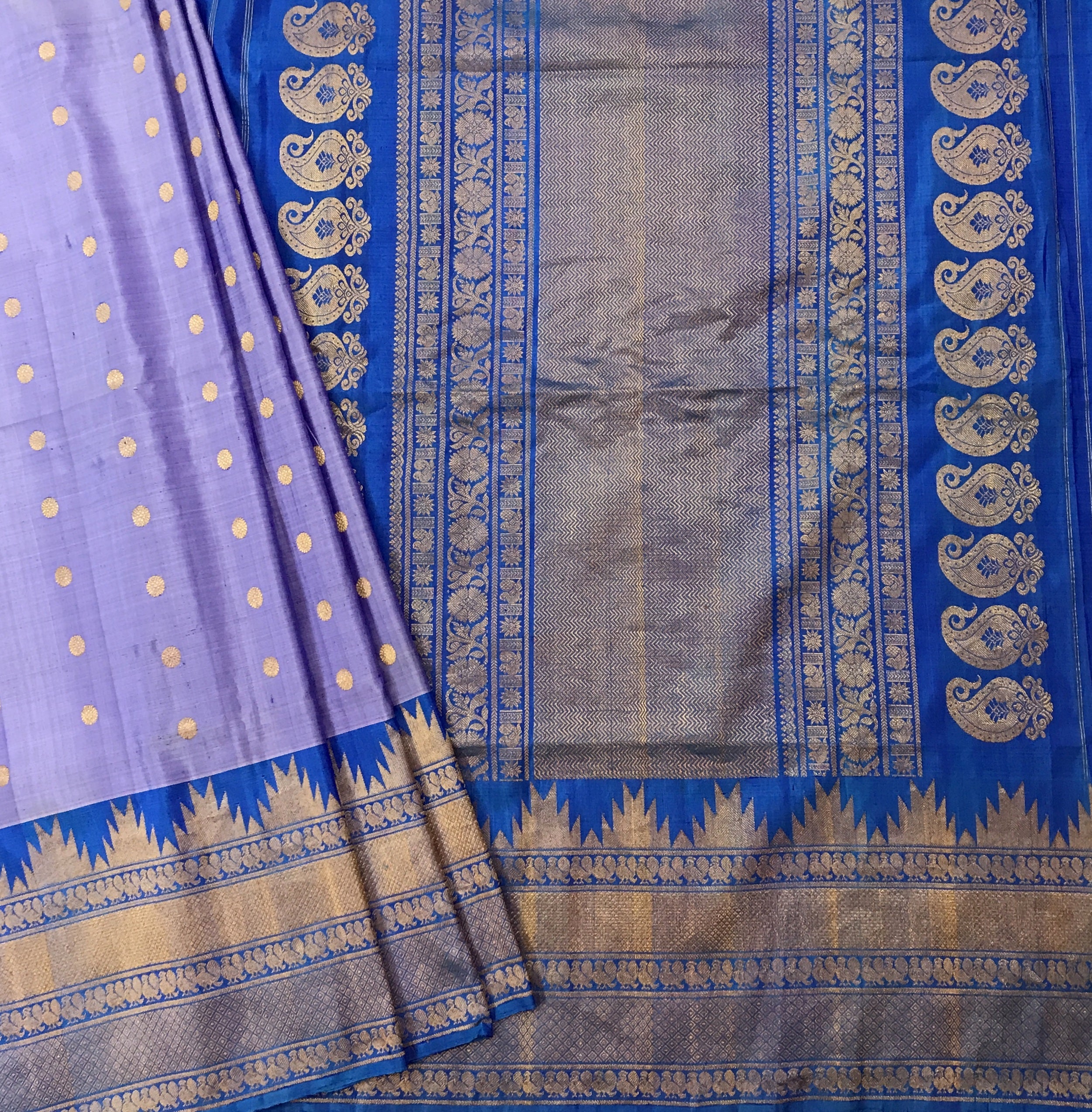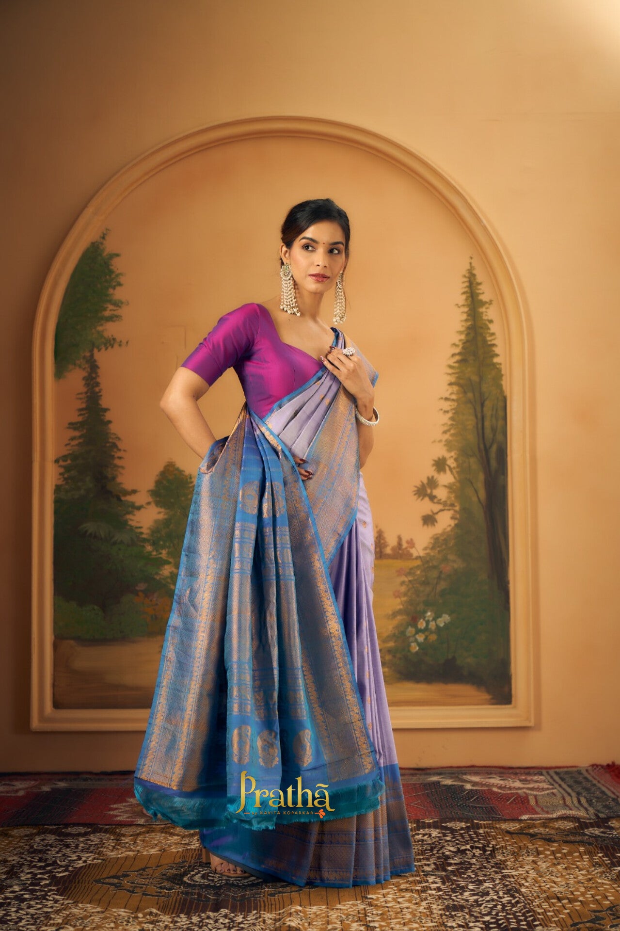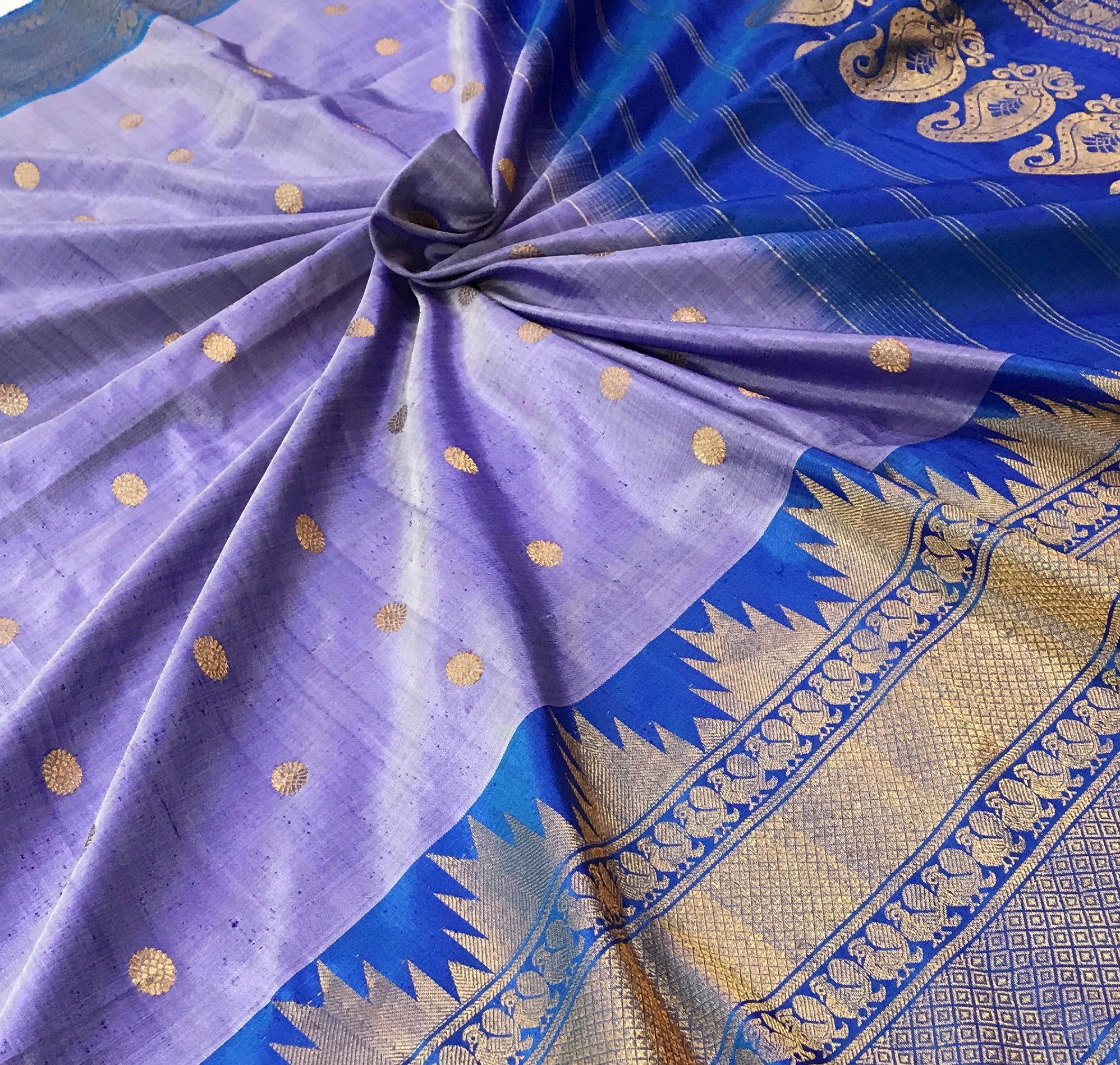 This exquisite Gadhwal saree in a rich shade of lavender, adorned with a mesmerizing special temple border and an intricately woven designer zari pallu, exudes sheer elegance. The gracefully arranged floral buttis above the classic Gadhwal border add a touch of sophistication. The intricate designed border enhances its regal charm, making it a true masterpiece.