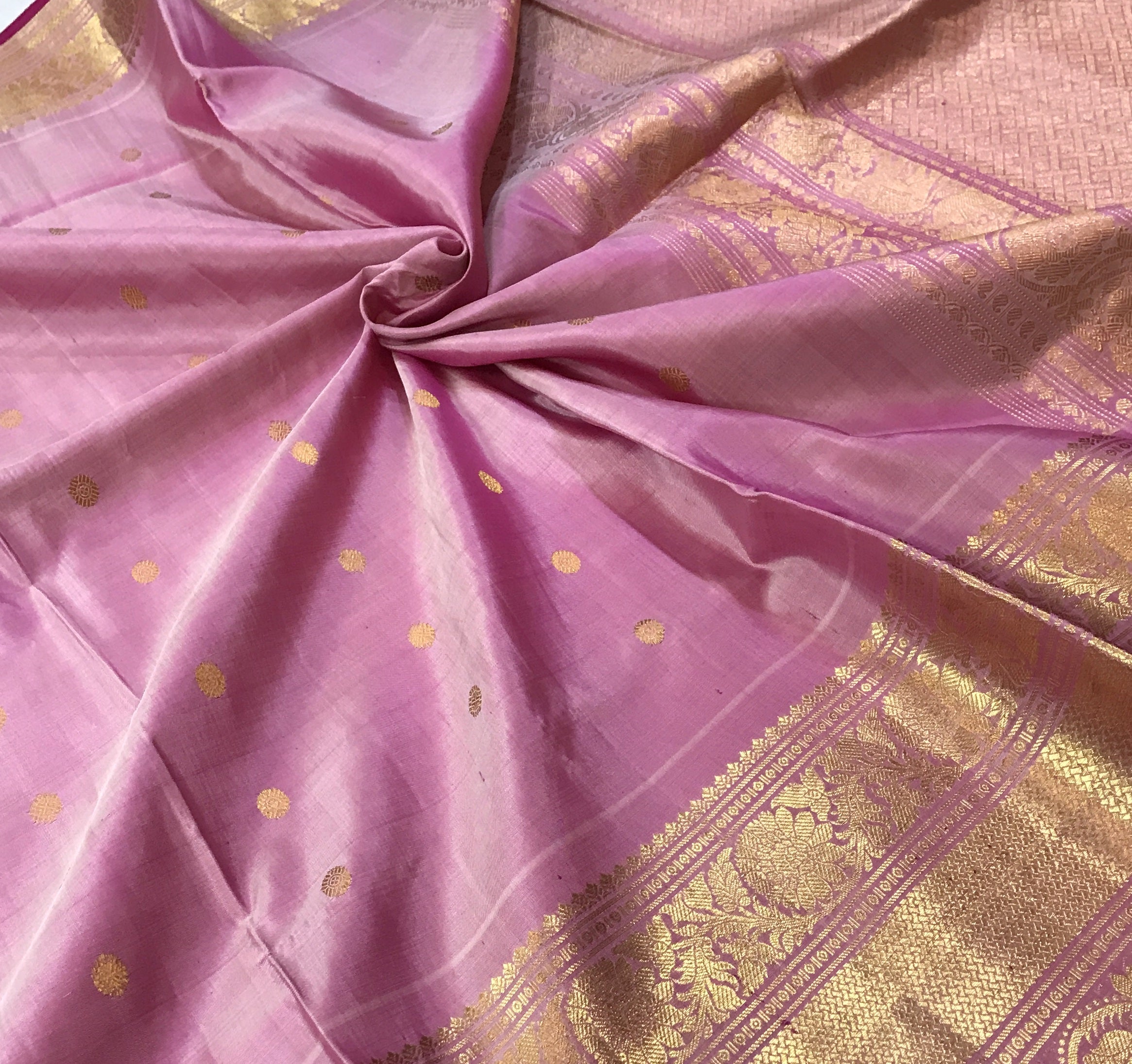 This elegant pink Gadwal saree features a striking self border, adding a vibrant touch to its classic appeal. The body is adorned with delicate zari butti, offering a rich and graceful look. A beautifully woven pallu enhances its traditional charm, making it perfect for festive occasions and celebrations
