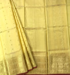 This elegant yellow Gadwal saree features a striking self border, adding a vibrant touch to its classic appeal. The body is adorned with delicate zari butti, offering a rich and graceful look. A beautifully woven pallu enhances its traditional charm, making it perfect for festive occasions and celebrations