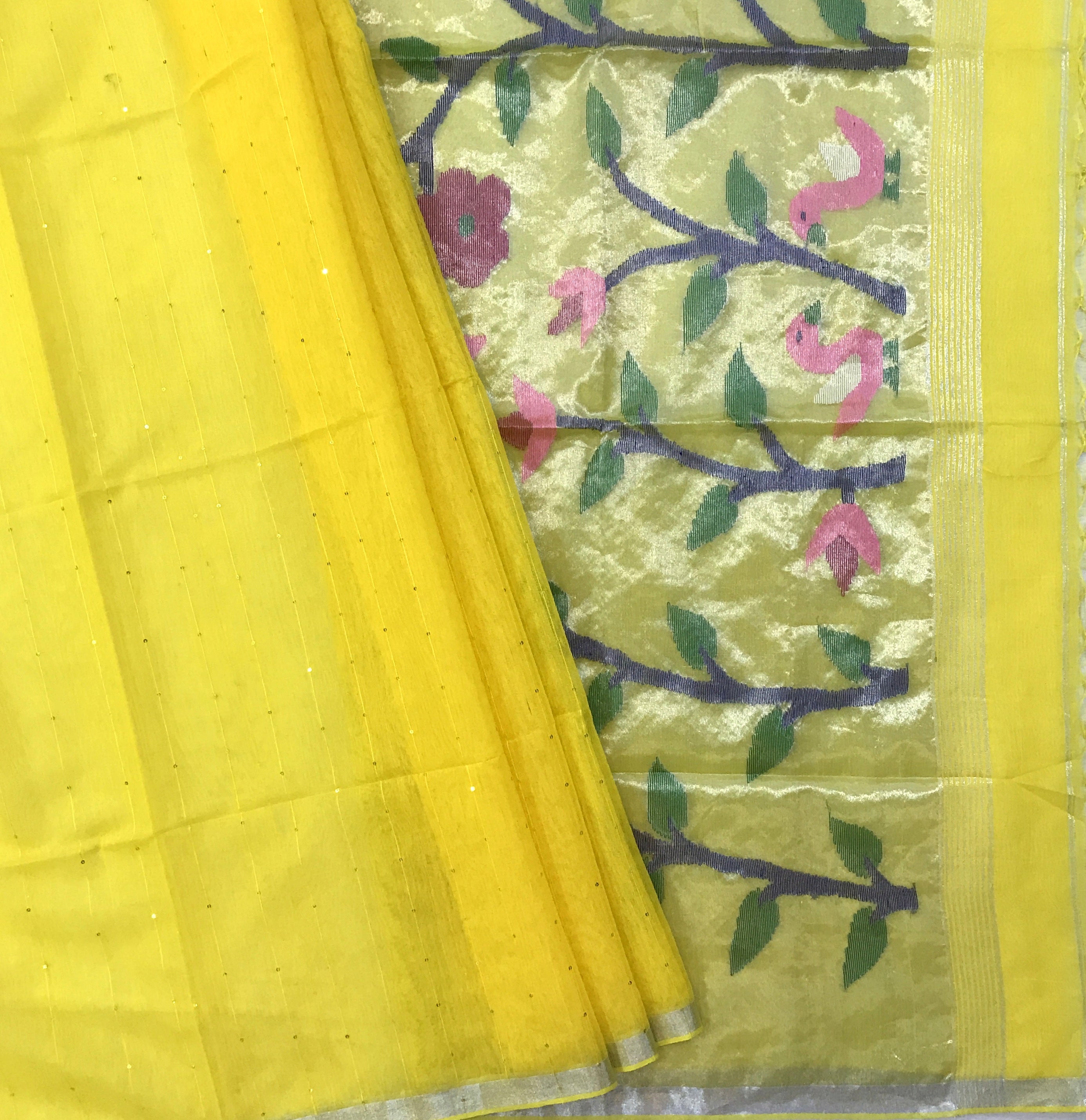 Radiant yellow Jamdani saree that captures timeless elegance with intricate handwoven patterns. This piece features a special pallu design that elevates the entire drape, showcasing traditional craftsmanship with contemporary appeal. The lightweight cotton blend ensures comfort for all-day wear, making it perfect for celebrations, festivals, or formal occasions. The delicate Jamdani weave creates an ethereal quality that flatters every silhouette. A versatile addition to your ethnic wardrobe that celebrates heritage and artistry.