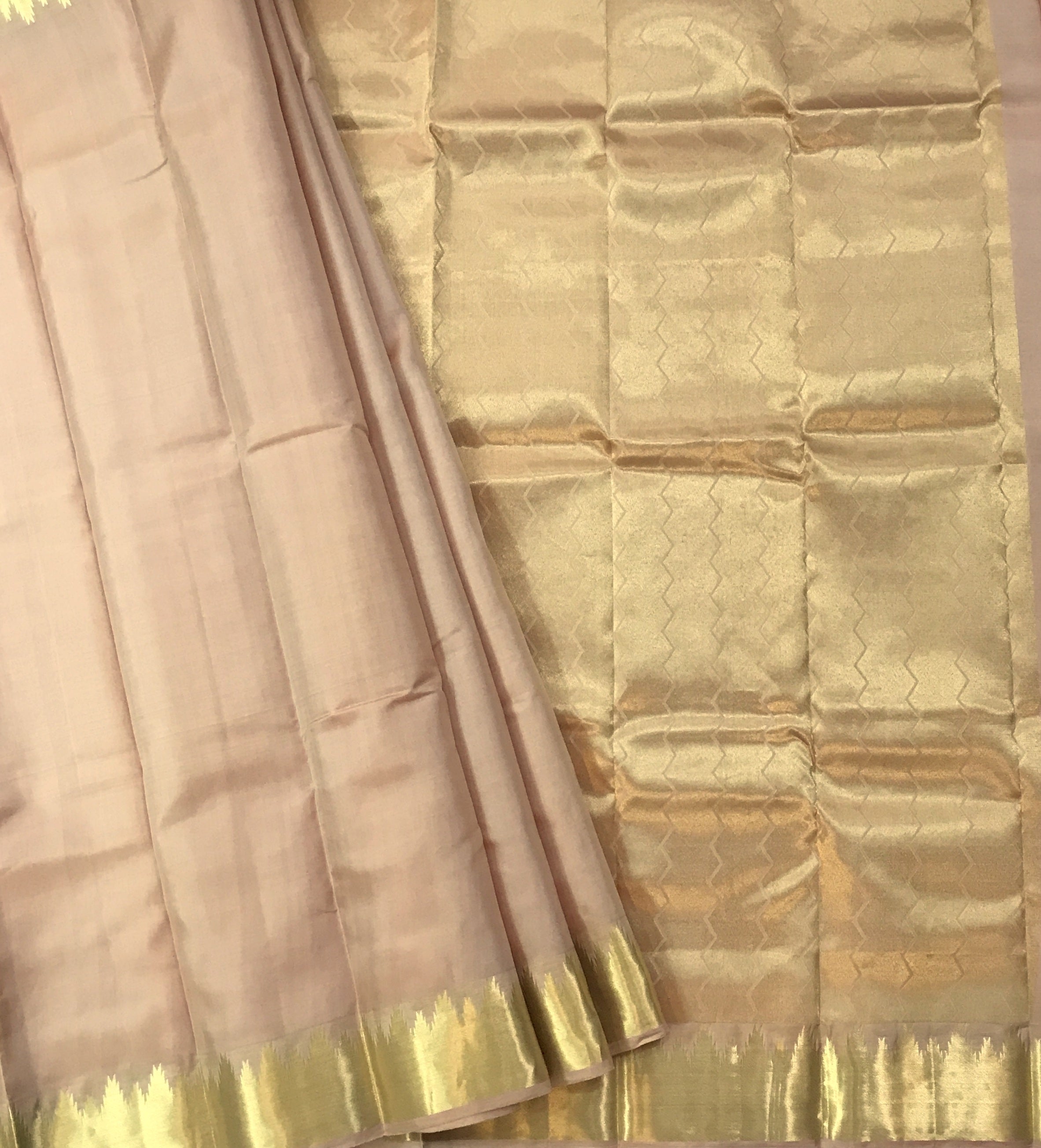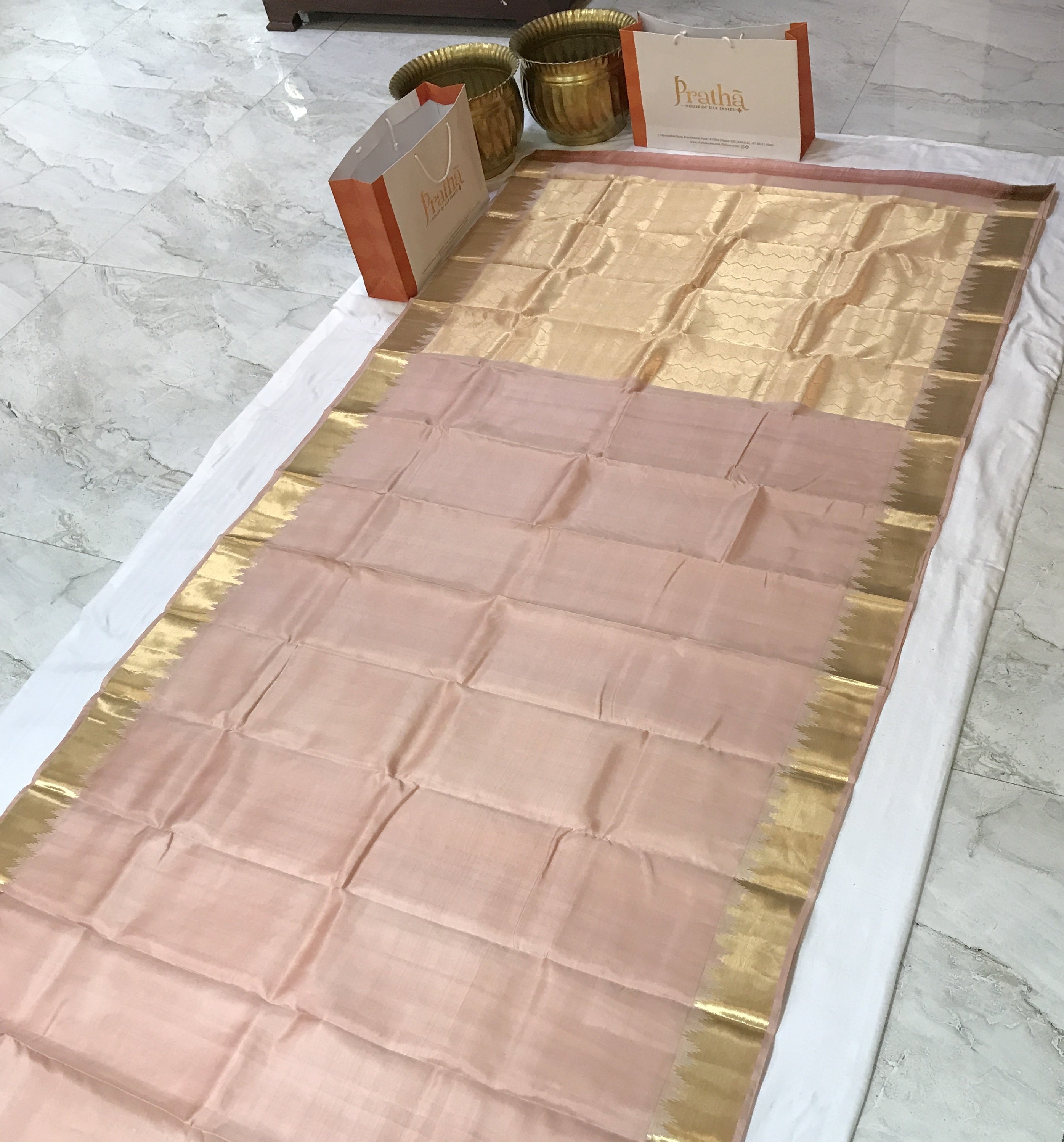 A beautiful shade of peach in traditional powerloom Kanjeevaram with a golden zari temple design border, this is a magnificent saree! The unique colour makes it stand out. This saree is perfect for day as well as evening.