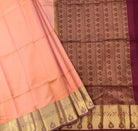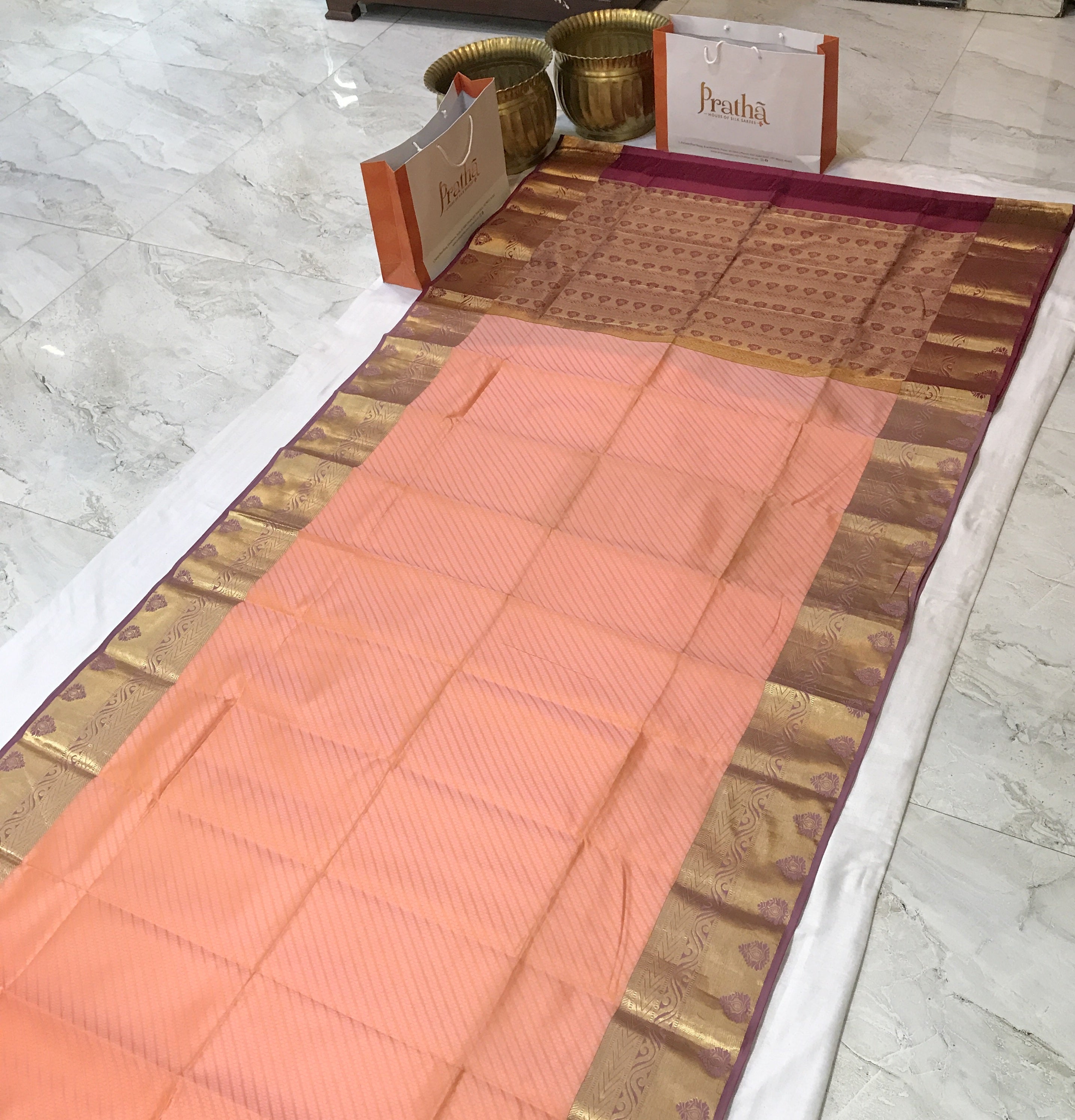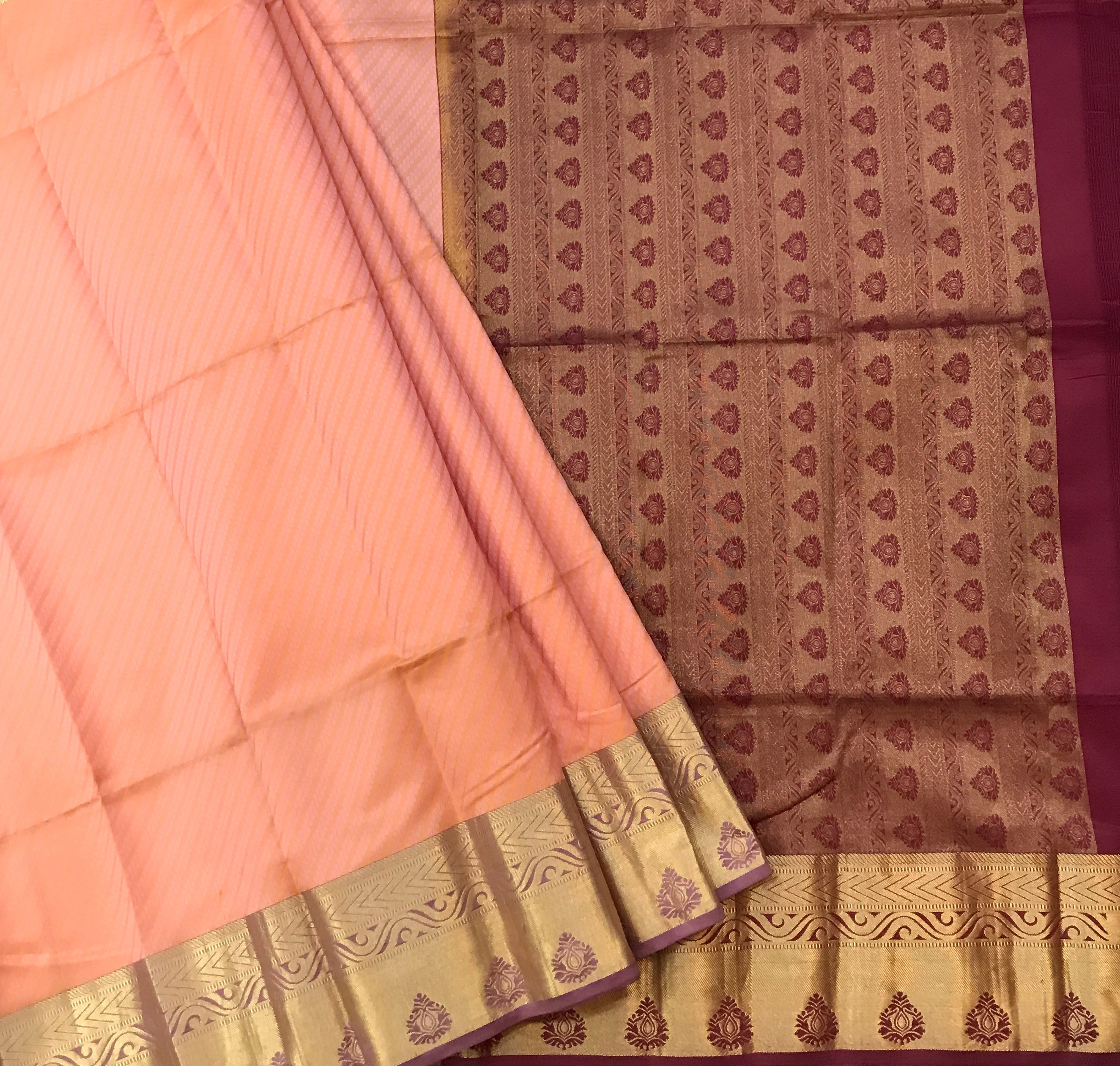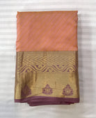 This is a traditional silk saree featuring a soft peach-colored body with fine subtle vertical stripes, contrasted by a rich maroon-brown pallu decorated with small repeating floral motifs in neat rows, and finished with a broad gold zari border woven with intricate paisley and geometric designs and highlighted by a thin purple edge, giving the saree an elegant, festive, and timeless appeal.