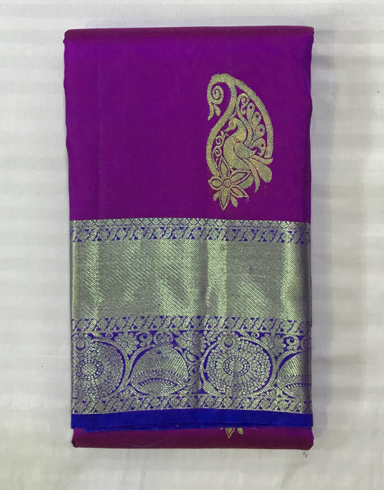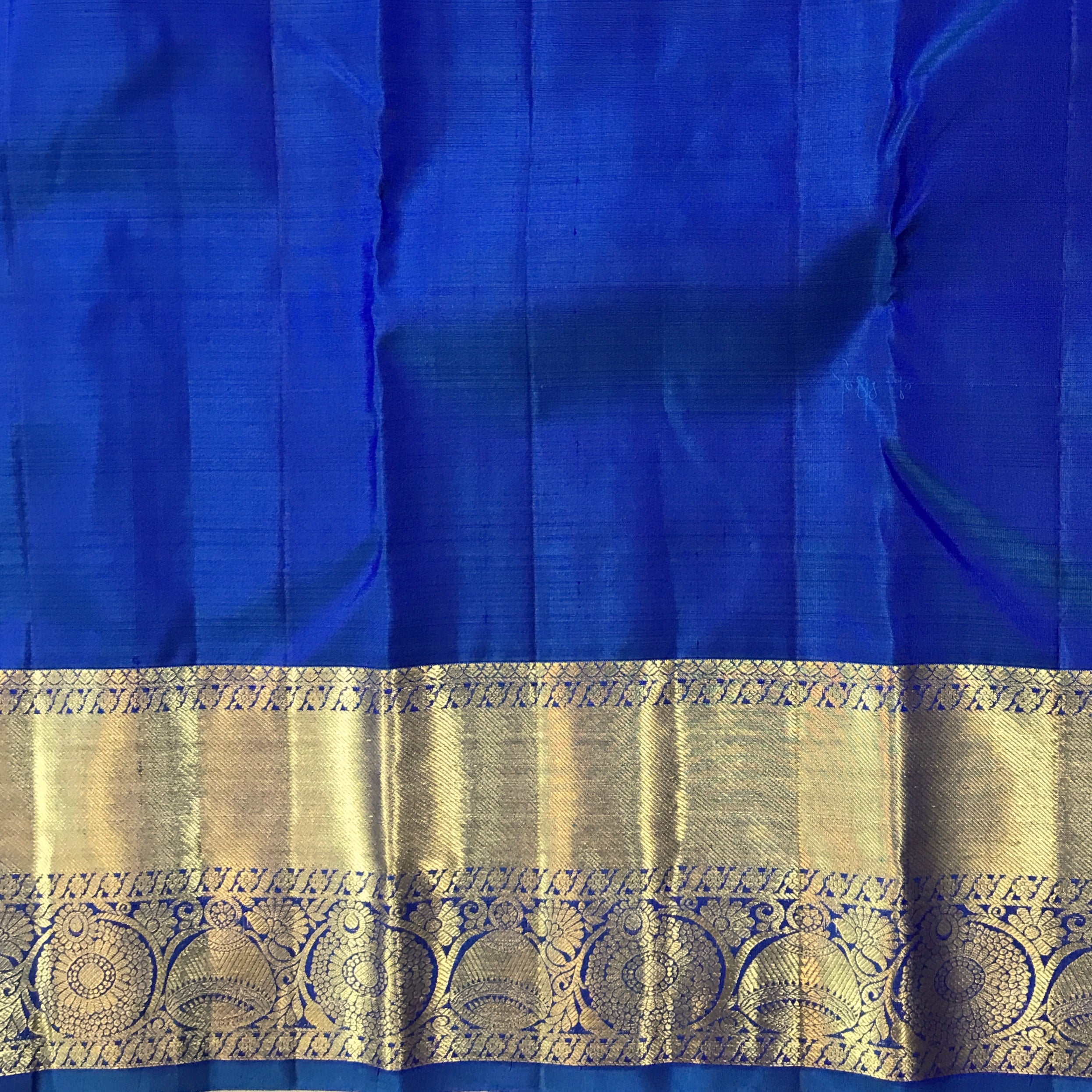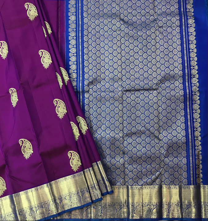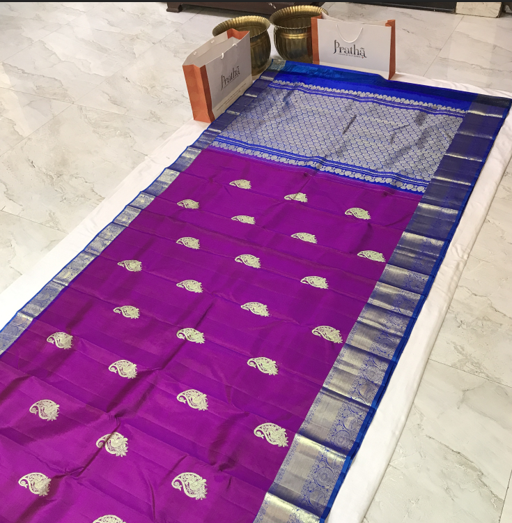 This phenomenal shade of purple pure silk handwoven Kanjeevaram, this one is perfectly traditional. The floral butti designs, contrast blue golden zari border and richly woven Pallu make this weave a classic! Thanks to its beautiful colour with the combination of gold, this Kanjeevaram will look great in the day as well as at night! Do not miss that, this saree has a very beautiful contrast blue golden zari border looks outstanding when we wear.